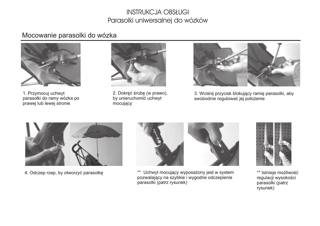 INSTRUKCJA OBSŁUGI Parasolki uniwersalnej do wózków Mocowanie parasolki do wózka 1. Przymocuj uchwyt parasolki do ramy wózka po prawej lub lewej stronie 4. Odczep rzep, by otworzyć parasolkę 2. Dokręć śrubę (w prawo), by unieruchomić uchwyt mocujący 3. Wciśnij przycisk blokujący ramię parasolki, aby swobodnie regulować jej położenie ** Uchwyt mocujący wyposażony jest w system pozwalający na szybkie i wygodne odczepienie parasolki (patrz rysunek) ** Istnieje możliwość regulacji wysokości parasolki (patrz rysunek) Demontaż parasolki 1. Złóż parasolkę tak, jak pokazano na rysunku i zabezpiecz rzepem 2. Odkręć śrubę w lewo, by poluzować mocowanie uchwytu parasolki, a następnie zdemontuj parasolkę 3. Parasolka złożona UWAGA Prosimy przeczytać instrukcję obsługi przed użyciem. W przypadku reklamacji zaleca się zachowanie nazwy dystrybutora, symbolu towaru oraz opakowania. Opakowanie nie jest integralną częścią produktu i należy je usunąć wraz z wszystkimi jego elementami przed użytkowaniem. Opakowanie nie służy do zabawy. Opakowanie foliowe może być niebezpieczne dla dziecka. Aby uniknąć możliwości uduszenia należy je usunąć wraz wszystkimi jego elementami przed użytkowaniem. Zachowaj instrukcję i etykietę ze względu na ważne informacje. Import i Dystrybucja R.Marszolik, J.Musioł Przedsiębiorstwo Produkcyjno Handlowo Usługowe „Marko” Spółka Jawna ul. Marklowicka 17, 44-300 Wodzisław Śląski, Polska, tel. +48 (0)32 4530171, [email protected] www.marko-zabawki.pl