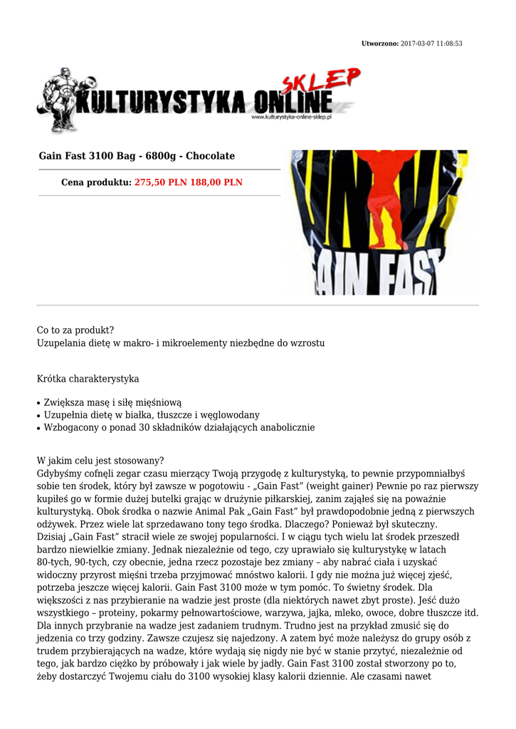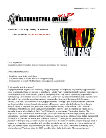 Utworzono: 2017-03-07 11:08:53 Gain Fast 3100 Bag - 6800g - Chocolate Cena produktu: 275,50 PLN 188,00 PLN Co to za produkt? Uzupelania dietę w makro- i mikroelementy niezbędne do wzrostu Krótka charakterystyka ● ● ● Zwiększa masę i siłę mięśniową Uzupełnia dietę w białka, tłuszcze i węglowodany Wzbogacony o ponad 30 składników działających anabolicznie W jakim celu jest stosowany? Gdybyśmy cofnęli zegar czasu mierzący Twoją przygodę z kulturystyką, to pewnie przypomniałbyś sobie ten środek, który był zawsze w pogotowiu - „Gain Fast” (weight gainer) Pewnie po raz pierwszy kupiłeś go w formie dużej butelki grając w drużynie piłkarskiej, zanim zająłeś się na poważnie kulturystyką. Obok środka o nazwie Animal Pak „Gain Fast” był prawdopodobnie jedną z pierwszych odżywek. Przez wiele lat sprzedawano tony tego środka. Dlaczego? Ponieważ był skuteczny. Dzisiaj „Gain Fast” stracił wiele ze swojej popularności. I w ciągu tych wielu lat środek przeszedł bardzo niewielkie zmiany. Jednak niezależnie od tego, czy uprawiało się kulturystykę w latach 80-tych, 90-tych, czy obecnie, jedna rzecz pozostaje bez zmiany – aby nabrać ciała i uzyskać widoczny przyrost mięśni trzeba przyjmować mnóstwo kalorii. I gdy nie można już więcej zjeść, potrzeba jeszcze więcej kalorii. Gain Fast 3100 może w tym pomóc. To świetny środek. Dla większości z nas przybieranie na wadzie jest proste (dla niektórych nawet zbyt proste). Jeść dużo wszystkiego – proteiny, pokarmy pełnowartościowe, warzywa, jajka, mleko, owoce, dobre tłuszcze itd. Dla innych przybranie na wadze jest zadaniem trudnym. Trudno jest na przykład zmusić się do jedzenia co trzy godziny. Zawsze czujesz się najedzony. A zatem być może należysz do grupy osób z trudem przybierających na wadze, które wydają się nigdy nie być w stanie przytyć, niezależnie od tego, jak bardzo ciężko by próbowały i jak wiele by jadły. Gain Fast 3100 został stworzony po to, żeby dostarczyć Twojemu ciału do 3100 wysokiej klasy kalorii dziennie. Ale czasami nawet mega-kalorie nie wystarczają. Czasami potrzebne jest coś jeszcze, coś takiego jak odżywki anaboliczne, specjalne zioła, naturalne sterole roślinne, EFA, enzymy pokarmowe i substancje optymalizujące mięśnie. Mówimy tutaj o składnikach takich jak L-arginina, MCT, siara IGF, L-karozyna, siarczan wanadylu, sterole roślinne (np. beta-sitosterol, stigmasterol, fukosterol, kempesterol), inozyna, żeń-szeń, piridoksyna alfa-ketoglutaret (PAK), cholina, inozyt, monofosfat i inne dobre substancje. Gdzie indziej można otrzymać taką mieszankę? Nigdzie indziej na świecie. Jest ona dostępna wyłącznie w Gain Fast 3100. Dzięki unikalnej formule Gain Fast 3100 „Stań się Wielki Szybko” otrzymuje się ponad 3100 kalorii ze 35 g białek, 171 g węglowodanów i tylko 15 g tłuszczu. Sprawdź sam, dlaczego Gain Fast 3100 jest naszym najlepiej sprzedającym się środkiem na budowę ciała. Co więcej, Gain Fast 3100 dostępny jest w kilku pysznych smakach: wanilia, czekolada, pinakolada i banan. Dostępne są również opakowania w dwóch rozmiarach: 2,3 kg i 4,5 kg. Zatem jeśli chcesz zwiększyć swoją masę poza sezonem lub chcesz dodać sobie trochę mięśni, spróbuj Gain Fast 3100. Skład: Wartości odżywcze Porcja: 5 miarek (225 g) Ilość porcji w opakowaniu: 30 Zawartość: 6,8 kg Składniki % Zapotrzebowanie dzienne Wartość energetyczna 842 kcal - Kalorie tłuszczu 27 kcal - Tłuszcz 3g 5 Nasycone 1g 5 Cholesterol 42 mg 14 Sód 142 mg 6 Potas 125 mg 4 Węglowodany 171 mg 57 Błonnik 4g 16 Cukry proste 72 g * Białko 35 g 70 * % dziennego zapotrzebowania obliczony dla diety o wartości energetycznej 2000 kcal © 2008 Fitness Authority Adres: http://www.ko.sklep.pl/ Telefon: kom. 782 010 880 Email: [email protected]