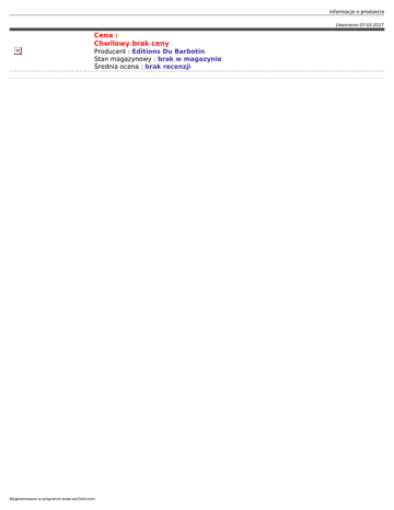 Informacje o produkcie Utworzono 07-03-2017 Cena : Chwilowy brak ceny Producent : Editions Du Barbotin Stan magazynowy : brak w magazynie Średnia ocena : brak recenzji Wygenerowano w programie www.oscGold.com
