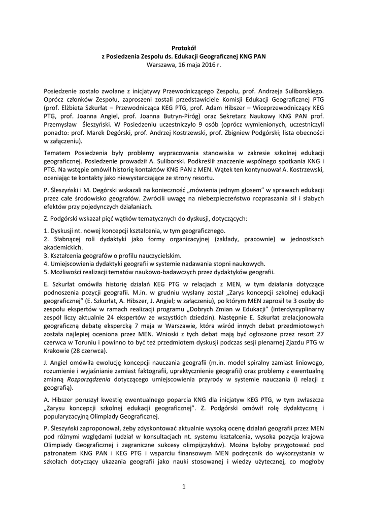 Protokół z Posiedzenia Zespołu ds. Edukacji Geograficznej KNG PAN Warszawa, 16 maja 2016 r. Posiedzenie zostało zwołane z inicjatywy Przewodniczącego Zespołu, prof. Andrzeja Suliborskiego. Oprócz członków Zespołu, zaproszeni zostali przedstawiciele Komisji Edukacji Geograficznej PTG (prof. Elżbieta Szkurłat – Przewodnicząca KEG PTG, prof. Adam Hibszer – Wiceprzewodniczący KEG PTG, prof. Joanna Angiel, prof. Joanna Butryn-Piróg) oraz Sekretarz Naukowy KNG PAN prof. Przemysław Śleszyński. W Posiedzeniu uczestniczyło 9 osób (oprócz wymienionych, uczestniczyli ponadto: prof. Marek Degórski, prof. Andrzej Kostrzewski, prof. Zbigniew Podgórski; lista obecności w załączeniu). Tematem Posiedzenia były problemy wypracowania stanowiska w zakresie szkolnej edukacji geograficznej. Posiedzenie prowadził A. Suliborski. Podkreślił znaczenie wspólnego spotkania KNG i PTG. Na wstępie omówił historię kontaktów KNG PAN z MEN. Wątek ten kontynuował A. Kostrzewski, oceniając te kontakty jako niewystarczające ze strony resortu. P. Śleszyński i M. Degórski wskazali na konieczność „mówienia jednym głosem” w sprawach edukacji przez całe środowisko geografów. Zwrócili uwagę na niebezpieczeństwo rozpraszania sił i słabych efektów przy pojedynczych działaniach. Z. Podgórski wskazał pięć wątków tematycznych do dyskusji, dotyczących: 1. Dyskusji nt. nowej koncepcji kształcenia, w tym geograficznego. 2. Słabnącej roli dydaktyki jako formy organizacyjnej (zakłady, pracownie) w jednostkach akademickich. 3. Kształcenia geografów o profilu nauczycielskim. 4. Umiejscowienia dydaktyki geografii w systemie nadawania stopni naukowych. 5. Możliwości realizacji tematów naukowo-badawczych przez dydaktyków geografii. E. Szkurłat omówiła historię działań KEG PTG w relacjach z MEN, w tym działania dotyczące podnoszenia pozycji geografii. M.in. w grudniu wysłany został „Zarys koncepcji szkolnej edukacji geograficznej” (E. Szkurłat, A. Hibszer, J. Angiel; w załączeniu), po którym MEN zaprosił te 3 osoby do zespołu ekspertów w ramach realizacji programu „Dobrych Zmian w Edukacji” (interdyscyplinarny zespół liczy aktualnie 24 ekspertów ze wszystkich dziedzin). Następnie E. Szkurłat zrelacjonowała geograficzną debatę ekspercką 7 maja w Warszawie, która wśród innych debat przedmiotowych została najlepiej oceniona przez MEN. Wnioski z tych debat mają być ogłoszone przez resort 27 czerwca w Toruniu i powinno to być też przedmiotem dyskusji podczas sesji plenarnej Zjazdu PTG w Krakowie (28 czerwca). J. Angiel omówiła ewolucję koncepcji nauczania geografii (m.in. model spiralny zamiast liniowego, rozumienie i wyjaśnianie zamiast faktografii, upraktycznienie geografii) oraz problemy z ewentualną zmianą Rozporządzenia dotyczącego umiejscowienia przyrody w systemie nauczania (i relacji z geografią). A. Hibszer poruszył kwestię ewentualnego poparcia KNG dla inicjatyw KEG PTG, w tym zwłaszcza „Zarysu koncepcji szkolnej edukacji geograficznej”. Z. Podgórski omówił rolę dydaktyczną i popularyzacyjną Olimpiady Geograficznej. P. Śleszyński zaproponował, żeby zdyskontować aktualnie wysoką ocenę działań geografii przez MEN pod różnymi względami (udział w konsultacjach nt. systemu kształcenia, wysoka pozycja krajowa Olimpiady Geograficznej i zagraniczne sukcesy olimpijczyków). Można byłoby przygotować pod patronatem KNG PAN i KEG PTG i wsparciu finansowym MEN podręcznik do wykorzystania w szkołach dotyczący ukazania geografii jako nauki stosowanej i wiedzy użytecznej, co mogłoby 1 umocnić pozycję tejże geografii w systemie edukacji i dawać argumenty o jej przydatności w innych nauczanych dziedzinach (a nie odwrotnie). Z. Podgórski omówił problemy siatki godzinowej, co do której istnieje niepewność wynikająca z braku ostatecznych decyzji co do podziału lat szkolnych na szkołę podstawową, gimnazjum, liceum (analizowane są różne warianty, tj. 5+3+4, 6+3+3, 4+4+4, 8+4). Wątek ten kontynuowali D. Piróg i A. Hibszer, wskazując, że bez tych rozstrzygnięć trudno oceniać, jak najoptymalniej plasować geografię i czy np. wyłączenie geografii do 1 godziny tygodniowo byłoby zasadne. Przy tym są pewne dane, że przyrody w dużej części nauczają geografowie. Z tego powodu D. Piróg poparła raczej utrzymanie przyrody, gdyż daje to szanse na odgrywanie pierwszorzędnej roli przez geografów. A. Suliborski zwrócił uwagę na kwestie przedmiotowe, związane z brakiem w przyrodzie zagadnień z zakresu geografii społeczno-ekonomicznej, co prowadzić będzie do marginalizacji tej ostatniej, względnie do rozproszenia w innych miejscach. Wyraził pogląd, że najbardziej prawdopodobny jest wariant 4+4+4. A. Kostrzewski poruszył wątek awansów naukowych, sceptycznie odnosząc się do możliwości uzyskiwania wyższych stopni naukowych z zakresu dydaktyki w obrębie dyscypliny geografii (wskazując na swoje dotychczasowe doświadczenie i dyskusje, m.in. w CK ds. SiTN). P. Śleszyński zaproponował, że może warto byłoby zrobić rozpoznanie tego problemu w innych komitetach naukowych PAN, tj. powiązanych merytorycznie z przedmiotami nauczanymi w szkołach (biologia, fizyka, historia, język polski itd.). P. Śleszyński zaproponował, że skoro jest materiał wypracowany przez KEG PTG i co najważniejsze – zyskał on wysoką ocenę środowiskową i poparcie MEN, to naturalne byłoby w pracach KNG PAN ten dorobek wykorzystać. Celowe byłoby zatem rozesłanie „Zarysu koncepcji szkolnej edukacji geograficznej” członkom KNG PAN jako jednego z materiałów do dyskusji na zebranie Plenarne 20 maja. M. Degórski wskazał na uwarunkowania legislacyjne (27 czerwca jest tylko etapem w dłuższym procesie zmian „Dobrej zmiany w edukacji”), rolę relacji przyroda-geografia, zagrożenie marginalizowaniem geografii społeczno-ekonomicznej w programach nauczania. Wyrazi