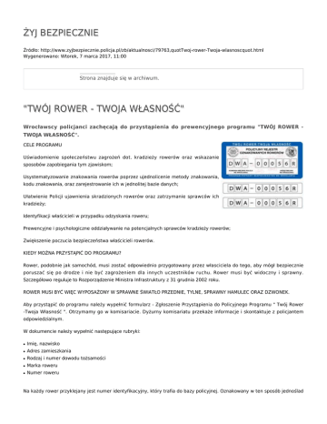 ŻYJ BEZPIECZNIE Źródło: http://www.zyjbezpiecznie.policja.pl/zb/aktualnosci/79763,quotTwoj-rower-Twoja-wlasnoscquot.html Wygenerowano: Wtorek, 7 marca 2017, 11:00 Strona znajduje się w archiwum. "TWÓJ ROWER - TWOJA WŁASNOŚĆ" Wrocławscy policjanci zachęcają do przystąpienia do prewencyjnego programu "TWÓJ ROWER TWOJA WŁASNOŚĆ". CELE PROGRAMU Uświadomienie społeczeństwu zagrożeń dot. kradzieży rowerów oraz wskazanie sposobów zapobiegania tym zjawiskom; Usystematyzowanie znakowania rowerów poprzez ujednolicenie metody znakowania, kodu znakowania, oraz zarejestrowanie ich w jednolitej bazie danych; Ułatwienie Policji ujawnienia skradzionych rowerów oraz zatrzymanie sprawców ich kradzieży; Identyfikacji właścicieli w przypadku odzyskania roweru; Prewencyjne i psychologiczne oddziaływanie na potencjalnych sprawców kradzieży rowerów; Zwiększenie poczucia bezpieczeństwa właścicieli rowerów. KIEDY MOŻNA PRZYSTĄPIĆ DO PROGRAMU? Rower, podobnie jak samochód, musi zostać odpowiednio przygotowany przez własciciela do tego, aby mógł bezpiecznie poruszać się po drodze i nie być zagrożeniem dla innych uczestników ruchu. Rower musi być widoczny i sprawny. Szczegółowo reguluje to Rozporządzenie Ministra Infrastruktury z 31 grudnia 2002 roku. ROWER MUSI BYĆ WIĘC WYPOSAŻONY W SPRAWNE ŚWIATŁO PRZEDNIE, TYLNE, SPRAWNY HAMULEC ORAZ DZWONEK. Aby przystąpić do programu należy wypełnić formularz - Zgłoszenie Przystąpienia do Policyjnego Programu " Twój Rower -Twoja Własność ". Otrzymamy go w komisariacie. Dyżurny komisariatu przekaże informacje i skontaktuje z policjantem odpowiedzialnym. W dokumencie należy wypełnić następujące rubryki: ● Imię, nazwisko ● Adres zamieszkania ● Rodzaj i numer dowodu tożsamości ● Marka roweru ● Numer roweru Na każdy rower przyklejany jest numer identyfikacyjny, który trafia do bazy policyjnej. Oznakowany w ten sposób jednoślad staje się mniej atrakcyjny dla potencjalnego złodzieja. W przypadku kradzieży i odnalezienia, łatwiej też odnaleźć właściciela. Każdy właściciel otrzymuje dokument potwierdzający tożsamość roweru oraz dane właściciela. Rower oznakować można w każdym komisariacie policji we Wrocławiu i powiatu wrocławskiego. (KWP we Wrocławiu / pt) Ocena: 0/5 (0) Tweetnij bezpieczeństwo