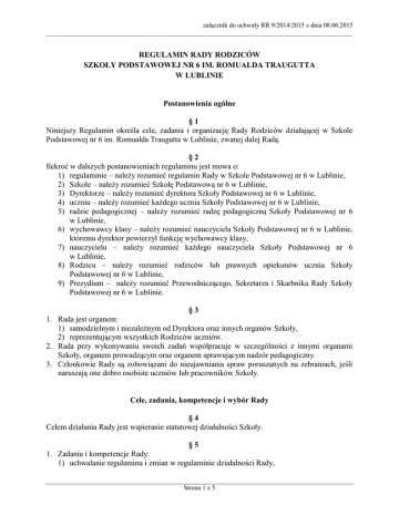 załącznik do uchwały RR 9/2014/2015 z dnia 08.06.2015 ______________________________________________________________________________________________ REGULAMIN RADY RODZICÓW SZKOŁY PODSTAWOWEJ NR 6 IM. ROMUALDA TRAUGUTTA W LUBLINIE Postanowienia ogólne §1 Niniejszy Regulamin określa cele, zadania i organizację Rady Rodziców działającej w Szkole Podstawowej nr 6 im. Romualda Traugutta w Lublinie, zwanej dalej Radą. §2 Ilekroć w dalszych postanowieniach regulaminu jest mowa o: 1) regulaminie – należy rozumieć regulamin Rady w Szkole Podstawowej nr 6 w Lublinie, 2) Szkole – należy rozumieć Szkołę Podstawową nr 6 w Lublinie, 3) Dyrektorze – należy rozumieć dyrektora Szkoły Podstawowej nr 6 w Lublinie, 4) uczniu – należy rozumieć każdego ucznia Szkoły Podstawowej nr 6 w Lublinie, 5) radzie pedagogicznej – należy rozumieć radzę pedagogiczną Szkoły Podstawowej nr 6 w Lublinie, 6) wychowawcy klasy – należy rozumieć nauczyciela Szkoły Podstawowej nr 6 w Lublinie, któremu dyrektor powierzył funkcję wychowawcy klasy, 7) nauczycielu – należy rozumieć każdego nauczyciela Szkoły Podstawowej nr 6 w Lublinie, 8) Rodzicu – należy rozumieć rodziców lub prawnych opiekunów ucznia Szkoły Podstawowej nr 6 w Lublinie, 9) Prezydium – należy rozumieć Przewodniczącego, Sekretarza i Skarbnika Rady Szkoły Podstawowej nr 6 w Lublinie. §3 1. Rada jest organem: 1) samodzielnym i niezależnym od Dyrektora oraz innych organów Szkoły, 2) reprezentującym wszystkich Rodziców uczniów. 2. Rada przy wykonywaniu swoich zadań współpracuje w szczególności z innymi organami Szkoły, organem prowadzącym oraz organem sprawującym nadzór pedagogiczny. 3. Członkowie Rady są zobowiązani do nieujawniania spraw poruszanych na zebraniach, jeśli naruszają one dobro osobiste uczniów lub pracowników Szkoły. Cele, zadania, kompetencje i wybór Rady §4 Celem działania Rady jest wspieranie statutowej działalności Szkoły. §5 1. Zadania i kompetencje Rady: 1) uchwalanie regulaminu i zmian w regulaminie działalności Rady, Strona 1 z 5 załącznik do uchwały RR 9/2014/2015 z dnia 08.06.2015 ______________________________________________________________________________________________ 2) występowanie z wnioskami i opiniami we wszystkich sprawach Szkoły do rady pedagogicznej, Samorządu Uczniowskiego, organu prowadzącego oraz organu sprawującego nadzór pedagogiczny nad Szkołą, 3) opiniowanie przedstawionych Radzie wniosków, 4) uchwalanie w porozumieniu z radą pedagogiczną programu wychowawczego Szkoły oraz programu profilaktyki, 5) opiniowanie programu i harmonogramu poprawy efektywności kształcenia lub wychowania Szkoły, 6) opiniowanie projektu planu finansowego Szkoły składanego przez Dyrektora, 7) wyznaczanie przedstawiciela Rady do komisji konkursowej powoływanej w celu przeprowadzenia konkursu na stanowisko Dyrektora, 8) występowanie z wnioskiem o dokonanie oceny pracy nauczyciela, 9) opiniowanie oceny dorobku zawodowego nauczyciela za okres stażu, 10) opiniowanie podjęcia działalności w Szkole przez stowarzyszenia i inne organizacje, których celem statutowym jest działalność wychowawcza albo rozszerzanie i wzbogacanie form działalności dydaktycznej, wychowawczej i opiekuńczej Szkoły, 11) opiniowanie zestawów podręczników lub materiałów edukacyjnych oraz materiałów ćwiczeniowych ustalanych przez Dyrektora, 12) występowanie z wnioskiem o zorganizowanie Rady Szkoły, 13) wyznaczanie przedstawicieli Rodziców do Rady Szkoły, o ile zostanie zorganizowana w Szkole, 14) występowanie z wnioskiem oraz wyrażanie zgody na wprowadzenie obowiązku noszenia przez uczniów na terenie Szkoły jednolitego stroju, 15) uzgadnianie z Dyrektorem wzoru jednolitego stroju obowiązkowo noszonego przez uczniów na terenie Szkoły, 16) uzgadnianie z Dyrektorem szczegółowej listy produktów dopuszczonych do sprzedaży w sklepiku szkolnym oraz stosowanych w ramach żywienia zbiorowego. §6 1. Kadencja Rady trwa jeden rok. 2. W skład Rady wchodzi po jednym przedstawicielu z każdej klasy. 3. Przedstawiciela klasy do Rady wybierają Rodzice uczniów danej klasy na pierwszym zebraniu rodziców w danym roku szkolnym. §7 1. Pierwsze zebranie Rady w danym roku szkolnym zwołuje Dyrektor Szkoły. 2. Na pierwszym zebraniu Rada wybiera ze swego grona Przewodniczącego Rady, Sekretarza i Skarbnika. 3. Dyrektor Szkoły przewodniczy pierwszemu zebraniu Rady do czasu wyboru Przewodniczącego Rady. 1. 2. 3. 4. §8 Wybory Przewodniczącego Rady przeprowadza się w głosowaniu tajnym. Każdy członek Rady dysponuje jednym głosem. Wybory Przewodniczącego Rady mogą być przeprowadzone w głosowaniu jawnym na wniosek członka Rady. Wybory Przewodniczącego Rady przeprowadza Dyrektor. Strona 2 z 5 załącznik do uchwały RR 9/2014/2015 z dnia 08.06.2015 ______________________________________________________________________________________________ 5. Kandydat na Przewodniczącego Rady musi wyrazić zgodę na kandydowanie. 6. Kandydat, który uzyskał największa liczbę głosów zostaje wybrany przewodniczącym Rady. 7. W przypadku równej liczby głosów otrzymanych przez kandydatów przeprowadza się kolejną turę głosowania. 8. Z przeprowadzonych wyborów Rady sporządza się protokół, w formie uchwały. 9. Wybory Sekretarza i Skarbnika przeprowadza się w taki sam sposób jak wybory Przewodniczącego Rady. §9 1. Do zadań Przewodniczącego Rady należy: 1) kierowanie pracami Rady, 2) reprezentowanie Rady jednoosobowo na zewnątrz, 3) składanie w imieniu Rady oświadczeń woli w zakresie praw i obowiązków majątkowych, 4) dysponowanie środkami pieniężnymi gromadzonymi na rachunku bankowym Rady. 2. Do zadań Sekretarza Rady należy nadzorowanie dokumentacji Rady. 3. Do zadań Skarbnika Rady należy nadzorowanie działalności finansowo-gospodarczej Rady. § 10 1. Rada może tworzyć stałe lub doraźne komisje i zespoły do wykonani