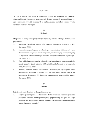 NOTATKA W dniu 6 marca 2014 roku w Warszawie odbyło się spotkanie 17 (słownie: siedemnaściorga) dyrektorów wewnętrznych działów prawnych przedsiębiorstw w celu omówienia kwestii związanych z niefinansowymi metodami motywowania członków zespołów prawnych. §1 Definicje Motywacja to ulotny koncept opisany (co najmniej) setkami definicji. Poniżej kilka przykładów. 1. Świadome dążenie do czegoś (E.J. Murray, Motywacja i uczucia, PWN, Warszawa, 1986). 2. Mechanizm psychologiczny uruchamiający i organizujący działanie człowieka skierowane na osiągnięcie określonego celu, co stanowi jego wewnętrzną siłę (J. Reykowski, Motywy ludzkiego działania, Zeszyt Nauk Instytutu Psychologii, UW, 1972, nr 2). 3. Chęć robienia czegoś, zależna od możliwości zaspokajania przez to działanie jakiejś potrzeby danej jednostki (S.P. Robbins, Zachowania w organizacji, PWE, Warszawa, 1998). 4. Bodziec, pobudka, zachęta do działania. Składa się na nią wszystko co w płaszczyźnie werbalnej, fizycznej czy psychofizycznej skłania kogoś do reagowania działaniem (N. Stevenson, Motywowanie pracowników, Liber, Warszawa, 2002). §2 Podziały Pojęcie motywacji dzieli się na dwa podstawowe typy. 1. Motywacja zewnętrzna – behawioralne dostosowanie do otoczenia (prawnik podejmuje działania, do których motywuje go przełożony, ale tylko tak długo jak długo jest motywowany, ORAZ tak długo jak dana metoda motywacji jest ważna dla danego prawnika). 1 2. Motywacja wewnętrzna – dana aktywność jest celem samym w sobie. “Motywacja jest jak wewnętrzny ogień, jeżeli ktoś inny próbuje go rozpalić, prawdopodobieństwo, że będzie się palił jest bardzo małe“ (Stephen R. Covey). §3 Koszty 1. Motywacja zewnętrzna – wysokie koszty dla pracodawcy. a. Subiektywna wartość nagrody finansowej spada praktycznie do zera po około trzech miesiącach od jej otrzymania. Aby uzyskać podobny efekt motywacyjny, następna nagroda (np. podwyżka) musi być o około 15% wyższa od poprzedniej. Jeżeli przełożony chciałby bazować tylko na motywatorach finansowych, musiałby podwyższać wynagrodzenie rocznie o około 75%. b. Ta sama zasada dotyczy nie tylko podstawowego wynagrodzenia, ale także świadczeń pracowniczych (np. dodatkowych ubezpieczeń, dofinansowań, nagród rzeczowych). Po jakimś czasie stają się one naturalnym składnikiem ogólnego wynagrodzenia, i często istnieje oczekiwanie, że sukcesywnie dodawane będą następne świadczenia. 2. Timothy Gubler, Ian Larkin i Lamar Pierce przeprowadzili badania1, w których udowodnili, że nagrody pieniężne i rzeczowe mają dokładnie odwrotny efekt od zamierzonego – motywują niektórych pracowników, ale tylko do tego co jest nagradzane i tak długo jak otrzymują oni te nagrody; a demotywują pozostałych pracowników. 3. Motywacja wewnętrzna – niski koszt dla pracodawcy, ALE motywacja wewnętrzna nie jest łatwo sterowalna, trudno do niej dotrzeć i łatwo zniszczyć. 1 http://ssrn.com/abstract=2215922 2 §4 Czynniki Niszczące Motywację Wewnętrzną 1. nagrody zewnętrzne; 2. brak uznania; 3. brak adekwatnych wyzwań; 4. brak możliwości rozwoju; 5. otrzymywanie wyłącznie negatywnej informacji zwrotnej; 6. niesprawna komunikacja w organizacji. §5 Narzędzia – Składniki Przepisu na Motywowanie Prawników 1. Nigel Nicholson2. - przeniesienie odpowiedzialności za motywację z przełożonego na podwładnego. a. b. trzy założenia: i. każdy człowiek ma motywację i energię do zmian; ii. ta energia i motywacja często są zablokowane w miejscu pracy iii. usuwanie blokad wymaga uczestnictwa pracownika. trzy kroki: i. stwórz pełen obraz (dowiedz się jak najwięcej o pracowniku, o sytuacji/kontekście, i o sobie); 2. ii. zmodyfikuj swoje cele; iii. dokładnie przygotuj spotkanie. David Meister3 - idealny pakiet motywacyjny prawników. a. wyznaczaj jasne cele; b. szybko udzielaj informacji zwrotnej i tak samo szybko nagradzaj; c. angażuj w proces decyzyjny; d. zapewnij autonomię/niezależność w pracy (mówimy „co“ ma być zrobione – wyznaczamy cele; nad tym „jak“ coś ma być zrobione spędzamy jak najmniej czasu; na wyjaśnianie „dlaczego“ coś powinno być zrobione poświęcamy najwięcej czasu); 2 „How to Motivate Your Problem People“, Harvard Business Review, January 2003 3 Managing the Professional Service Firm, Simon & Schuster, 1993 3 3. e. uczyń odpowiedzialnymi za wyniki pracy; f. zapewnij różnorodność w pracy; g. informuj na bieżąco o zbliżających się wyzwaniach. Jennifer Dulski4 - The Motivational Pie Chart (narzędzie do oceny co motywuje naszych podwładnych). a. należy poprosić każdego pracownika, żeby spisał wszystkie kategorie motywatorów w pracy (np. pieniądze, rozwój, uczenie się, pochwały, etc.); można wpisać tyle kategorii ile się chce; nie ma żadnego wzoru; b. każdej kategorii należy przypisać procent, w którym dana kategoria motywuje (suma nie może być wyższa niż 100%, np. pochwały 20%, rozwój 30%, etc.); c. używając czerwonego, żółtego i zielonego koloru zaznaczyć jak bardzo pracownik jest zadowolony z danej kategorii; jeżeli jest zadowolony z wynagrodzenia – zaznacza te kategorię kolorem zielonym, a kompletnie niezadowolony z poziomu wyzwań przed nim stojących – zaznacza tę kategorię na czerwono; d. następnie należy rozmawiać z pracownikiem jak możemy razem pracować na tym, żeby wszystkie kategorie były zaznaczone na zielono (pełne zadowolenie); e. to narzędzie powinno zawsze działać, bo to sami pracownicy mówią co ich motywuje i sami (z naszą pomocą) ustalają jak osiągnąć ten stan; f. ludzie są różni i motywują ich inne rzeczy; ALE g. ludzie są też bardzo podobni i większość jest motywowana przez: i. adekwatne wyzwania – kiedy wiedzą, że robią coś ważnego i zasługuje to na ich czas i energię; ii. zrozumienie jak ich praca i osobisty wkład jest ważny dla osią