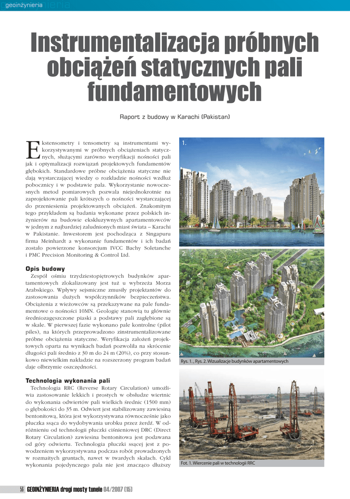 geoinżynieria geoinżynieria Instrumentalizacja próbnych obciążeń statycznych pali fundamentowych Raport z budowy w Karachi (Pakistan) E kstensometry i tensometry są instrumentami wykorzystywanymi w próbnych obciążeniach statycznych, służącymi zarówno weryfikacji nośności pali jak i optymalizacji rozwiązań projektowych fundamentów głębokich. Standardowe próbne obciążenia statyczne nie dają wystarczającej wiedzy o rozkładzie nośności wzdłuż pobocznicy i w podstawie pala. Wykorzystanie nowoczesnych metod pomiarowych pozwala niejednokrotnie na zaprojektowanie pali krótszych o nośności wystarczającej do przeniesienia projektowanych obciążeń. Znakomitym tego przykładem są badania wykonane przez polskich inżynierów na budowie ekskluzywnych apartamentowców w jednym z najbardziej zaludnionych miast świata – Karachi w Pakistanie. Inwestorem jest pochodząca z Singapuru firma Meinhardt a wykonanie fundamentów i ich badań zostało powierzone konsorcjum IVCC Bachy Soletanche i PMC Precision Monitoring & Control Ltd. 1. 2. Opis budowy Zespół ośmiu trzydziestopiętrowych budynków apartamentowych zlokalizowany jest tuż u wybrzeża Morza Arabskiego. Wpływy sejsmiczne zmusiły projektantów do zastosowania dużych współczynników bezpieczeństwa. Obciążenia z wieżowców są przekazywane na pale fundamentowe o nośności 10MN. Geologię stanowią tu głównie średniozagęszczone piaski a podstawy pali zagłębione są w skale. W pierwszej fazie wykonano pale kontrolne (pilot piles), na których przeprowadzono zinstrumentalizowane próbne obciążenia statyczne. Weryfikacja założeń projektowych oparta na wynikach badań pozwoliła na skrócenie długości pali średnio z 30 m do 24 m (20%), co przy stosunkowo niewielkim nakładzie na rozszerzony program badań daje olbrzymie oszczędności. Rys. 1. , Rys. 2. Wizualizacje budynków apartamentowych Technologia wykonania pali Technologia RRC (Reverse Rotary Circulation) umożliwia zastosowanie lekkich i prostych w obsłudze wiertnic do wykonania odwiertów pali wielkich średnic (1500 mm) o głębokości do 35 m. Odwiert jest stabilizowany zawiesiną bentonitową, która jest wykorzystywana równocześnie jako płuczka ssąca do wydobywania urobku przez żerdź. W odróżnieniu od technologii płuczki ciśnieniowej DRC (Direct Rotary Circulation) zawiesina bentonitowa jest podawana od góry odwiertu. Technologia płuczki ssącej jest z powodzeniem wykorzystywana podczas robót prowadzonych w rozmaitych gruntach, nawet w twardych skałach. Cykl wykonania pojedynczego pala nie jest znacząco dłuższy 56 GEOINŻYNIERIA drogi mosty tunele 04/2007 (15) Fot. 1. Wiercenie pali w technologii RRC geoinżynieria geoinżynieria niż w przypadku pali wierconych w rurach obsadowych wyciąganych, a wykonawca zamiast kilku kosztownych wiertnic dysponuje kilkunastoma nieskomplikowanymi maszynami skracając tym samym termin zakończenia robót. Palowanie z użyciem tej metody wymaga jednak przemyślanego projektu organizacji robót: odstojniki zawiesiny bentonitowej zlokalizowane są zwykle w centrum placu budowy a tymczasowe kanały doprowadzają do poszczególnych odwiertów świeżą płuczkę. Program badań Zinstrumentalizowane próbne obciążenia są przeprowadzane najczęściej na palach kontrolnych (pilotowych) jeszcze przed rozpoczęciem właściwych robót palowych. Wówczas projektant dysponuje możliwością zweryfikowania założeń i ewentualnie redukuje długości lub średnice projektowanych pali. Pozostałe badania wykonuje się z powszechnie przyjętymi standardami: próbne obciążenia statyczne i dynamiczne, badania ciągłości metodą Sonic Echo oraz prześwietlenie pali ultradźwiękami metodą Crosshole Sonic Logging. Badania wykonuje się w ilości zależnej od stopnia skomplikowania warunków geotechnicznych i ogólnej liczby pali. Na przedmiotowej budowie wykonano: – 8 zinstrumentalizowanych próbnych obciążeń siłą 30MN (przeciążenie 300%) na palach pilotowych (ultimate compression on instrumented preliminary piles), – 22 standardowe próbne obciążenia statyczne siłą do 20MN (przeciążenie 200%), – 38 badań dynamicznych (Dynamic Load Tests) z użyciem specjalnie do tego celu skonstruowanego kafaru o ciężarze 35 ton, jak dotąd jednego z największych, – badania ciągłości na wszystkich palach. Należy zwrócić uwagę na doskonałą korelację wyników badań statycznych i dynamicznych. Pomiar siły w trakcie wszystkich próbnych obciążeń statycznych został przeprowadzony z użyciem elektronicznych dynamometrów oraz indukcyjnych czujników przemieszczeń. Czas trwania jednego próbnego obciążenia statycznego wynosił nawet 80 godz. i składał się z trzech cykli: 150%, 200% i 300% przy czym w pierwszych dwóch cyklach maksymalna wartość obciążenia trwała 24 godz. Automatyczne sterowanie układem pompa – siłownik oraz zdalna rejestracja wszystkich parametrów testu zostały zapewnione przez komputery Data Logger. Badania siłą 30MN wykonano z użyciem 4 pali kotwiących natomiast mniejsze testy wykonywano z użyciem balastu. Zastosowane kryterium stabilizacji osiadań w próbnych obciążeniach zostało określone zgodnie ze standardami Ove Arup - wynosiło 0.10 mm/godz. i było trzykrotnie bardziej rygorystyczne od stosowanego w Polsce 0.05 mm/10 min. Fot. 2. Zinstrumentalizowany test 30 000 kN Fot. 3. Ekstensometry w palu gotowym do badań Fot. 4. Stanowisko balastowe 20MN Ekstensometry (rod extensometers) Nazwa ekstensometr jest myląca (ang. extension – przedłużenie), ponieważ w trakcie badania dokonuje się pomiaru nie wydłużenia, lecz skrócenia długości poszczególnych odcinków pala pod zadanym obciążeniem. Pozornemu wydłużeniu, a raczej wysunięciu podlegają pręty zagłębione swobodnie w rurach dostępowych. Rury te (o różnych długościach) mocuje się do kosza zbrojeniowego przed betonowaniem pala. Im głębiej zainst