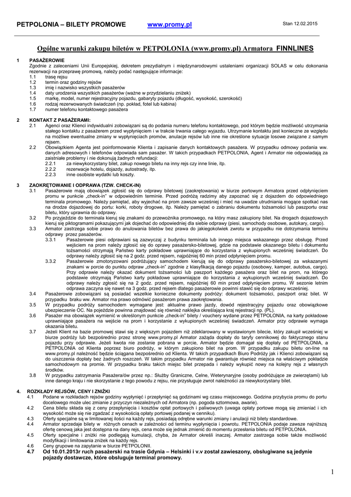 PETPOLONIA – BILETY PROMOWE www.promy.pl Stan 12.02.2015 Ogólne warunki zakupu biletów w PETPOLONIA (www.promy.pl) Armatora FINNLINES 1 PASAŻEROWIE Zgodnie z zaleceniami Unii Europejskiej, dekretem prezydialnym i międzynarodowymi ustaleniami organizacji SOLAS w celu dokonania rezerwacji na przeprawę promową, należy podać następujące informacje: 1.1 trasę rejsu 1.2 termin oraz godziny rejsów 1.3 imię i nazwisko wszystkich pasażerów 1.4 daty urodzenia wszystkich pasażerów (ważne w przydzielaniu zniżek) 1.5 markę, model, numer rejestracyjny pojazdu, gabaryty pojazdu (długość, wysokość, szerokość) 1.6 rodzaj rezerwowanych świadczeń (np. pokład, fotel lub kabina) 1.7 numer telefonu kontaktowego pasażera 2 KONTAKT Z PASAŻERAMI: 2.1 Agenci oraz Klienci indywidualni zobowiązani są do podania numeru telefonu kontaktowego, pod którym będzie możliwość utrzymania stałego kontaktu z pasażerem przed wypłynięciem i w trakcie trwania całego wyjazdu. Utrzymanie kontaktu jest konieczne ze względu na możliwe ewentualne zmiany w wypłynięciach promów, anulacje rejsów lub inne nie określone sytuacje losowe związane z samym rejsem. 2.2 Obowiązkiem Agenta jest poinformowanie Klienta i zapisanie danych kontaktowych pasażera. W przypadku odmowy podania ww. danych adresowych i telefonów odpowiada sam pasażer. W takich przypadkach PETPOLONIA, Agent i Armator nie odpowiadają za zaistniałe problemy i nie dokonują żadnych refundacji: 2.2.1 za niewykorzystany bilet, zakup nowego biletu na inny rejs czy inne linie, itp. 2.2.2 rezerwacje hotelu, dojazdy, autostrady, itp. 2.2.3 inne osobiste wydatki lub koszty. 3 ZAOKRĘTOWANIE I ODPRAWA (TZW. CHECK-IN) 3.1 Pasażerowie mają obowiązek zgłosić się do odprawy biletowej (zaokrętowania) w biurze portowym Armatora przed odpłynięciem promu w punkcie „check-in” w odpowiednim terminie. Przed podróżą radzimy aby zapoznać się z dojazdem do odpowiedniego terminala promowego. Należy pamiętać, aby wyjechać na prom zawsze wcześniej i mieć na uwadze utrudniania mogące spotkać nas na drodze dojazdowej do portu: korki, roboty drogowe, itp. Należy pamiętać o zabraniu dokumentu tożsamości lub paszportu oraz biletu, który uprawnia do odprawy. 3.2 Po przyjeździe do terminala kieruj się znakami do przewoźnika promowego, na który masz zakupiony bilet. Na drogach dojazdowych kieruj się piktogramami pokazującymi jak dojechać do odpowiedniej dla siebie odprawy (piesi, samochody osobowe, autokary, cargo). 3.3 Armator zastrzega sobie prawo do anulowania biletów bez prawa do jakiegokolwiek zwrotu w przypadku nie dotrzymania terminu odprawy przez pasażerów. 3.3.1 Pasażerowie piesi odprawiani są zazwyczaj z budynku terminala lub innego miejsca wskazanego przez obsługę. Przed wejściem na prom należy zgłosić się do oprawy pasażersko-biletowej, gdzie na podstawie okazanego biletu i dokumentu tożsamości otrzymają Państwo karty pokładowe uprawniające do korzystania z wykupionych wcześniej świadczeń. Do odprawy należy zgłosić się na 2 godz. przed rejsem, najpóźniej 60 min przed odpłynięciem promu. 3.3.2 Pasażerowie zmotoryzowani podróżujący samochodem kierują się do odprawy pasażersko-biletowej za wskazanymi znakami w porcie do punktu odpraw „check-in” zgodnie z klasyfikacją danego pojazdu (osobowy, kamper, autobus, cargo). Przy odprawie należy okazać dokument tożsamości lub paszport każdego pasażera oraz bilet na prom, na którego podstawie otrzymają Państwo karty pokładowe uprawniające do korzystania z wykupionych wcześniej świadczeń. Do odprawy należy zgłosić się na 2 godz. przed rejsem, najpóźniej 60 min przed odpłynięciem promu. W sezonie letnim odprawa zaczyna się nawet na 3 godz. przed rejsem dlatego pasażerowie powinni stawić się do odprawy wcześniej. 3.4 Pasażerowie zobowiązani są posiadać wszelkie konieczne dokumenty podróży: dokument tożsamości, paszport oraz bilet. W przypadku braku ww. Armator ma prawo odmówić pasażerom prawa zaokrętowania. 3.5 W przypadku podróży samochodem wymagane jest: aktualne prawo jazdy, dowód rejestracyjny pojazdu oraz obowiązkowe ubezpieczenie OC. Na pojeździe powinna znajdować się również naklejka określająca kraj rejestracji np. (PL). 3.6 Pasażer ma obowiązek wymienić w określonym punkcie „check-in” bilety / vouchery wydane przez PETPOLONIA, na karty pokładowe uprawniające pasażera na wejście na prom i korzystanie z wykupionych wcześniej świadczeń. Armator przy odprawie wymaga okazania biletu. 3.7 Jeżeli Klient na bazie promowej stawi się z większym pojazdem niż zdeklarowany w wystawionym bilecie, który zakupił wcześniej w biurze podróży lub bezpośrednio przez stronę www.promy.pl Armator zażąda dopłaty do taryfy cennikowej do faktycznego stanu pojazdu przy odprawie. Jeżeli kwota nie zostanie pobrana w porcie, Armator będzie domagał się dopłaty od PETPOLONIA, a PETPOLONIA od Klienta poprzez biuro podróży, w którym zakupiono bilet na prom. W przypadku zakupu biletu on-line na www.promy.pl należność będzie ściągana bezpośrednio od Klienta. W takich przypadkach Biuro Podróży jak i Klienci zobowiązani są do uiszczenia dopłaty bez żadnych roszczeń. W takim przypadku Armator nie gwarantuje również miejsca na właściwym pokładzie samochodowym na promie. W przypadku braku takich miejsc bilet przepada i należy wykupić nowy na kolejny rejs z własnych środków. 3.8 W przypadku zatrzymania Pasażera/ów przez np.: Służby Graniczne, Celne, Weterynaryjne (osoby podróżujące ze zwierzętami) lub inne danego kraju i nie skorzystanie z tego powodu z rejsu, nie przysługuje zwrot należności za niewykorzystany bilet. 4. ROZKŁADY REJSÓW, CENY I ZNIŻKI 4.1 Podane w rozkładach rejsów godziny wypłynięć i przepłynięć są godzinami wg czasu miejscowego. Godzina przybycia promu do portu docelowego może ulec zmianie z przyczyn nieza