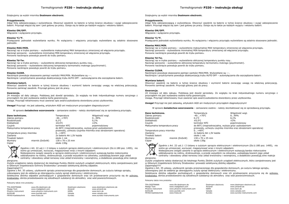 Termohigrometr P330 – instrukcja obsługi Termohigrometr P330 – instrukcja obsługi Dziękujemy za wybór miernika Dostmann electronic. Dziękujemy za wybór miernika Dostmann electronic. Przygotowanie. Zdjąć folię zabezpieczającą z wyświetlacza. Otworzyć zasobnik na baterie w tylnej ściance obudowy i wyjąć zabezpieczenie baterii. Przyrząd włącza się sam i jest gotowy po pracy. Dzieje się to także po każdym wyjęciu i włożeniu baterii. Przygotowanie. Zdjąć folię zabezpieczającą z wyświetlacza. Otworzyć zasobnik na baterie w tylnej ściance obudowy i wyjąć zabezpieczenie baterii. Przyrząd włącza się sam i jest gotowy po pracy. Dzieje się to także po każdym wyjęciu i włożeniu baterii. Klawisz ON/OFF. Włączanie i wyłączanie przyrządu. Klawisz ON/OFF. Włączanie i wyłączanie przyrządu. Klawisz oC/oF. Przełączanie jednostek wyświetlania wyniku. Po wyłączeniu i włączeniu przyrządu wyświetlane są ostatnio stosowane jednostki. Klawisz oC/oF. Przełączanie jednostek wyświetlania wyniku. Po wyłączeniu i włączeniu przyrządu wyświetlane są ostatnio stosowane jednostki. Klawisz MAX/MIN. Nacisnąć raz w trybie pomiaru – wyświetlenie maksymalnej MAX temperatury zmierzonej od włączenia przyrządu. Nacisnąć ponownie - wyświetlenie minimalnej MIN temperatury zmierzonej od włączenia przyrządu. Ponowne naciśnięcie powoduje powrót do trybu pomiaru. Klawisz Td-Tw. Nacisnąć raz w trybie pomiaru – wyświetlenie obliczonej temperatury punktu rosy.. Nacisnąć ponownie – wyświetlenie obliczonej temperatury termometru mokrego (psychrometr). Ponowne naciśnięcie powoduje powrót do trybu pomiaru. Klawisz CLEAR. Naciśnięcie powoduje skasowanie pamięci wartości MAX/MIN. Wyświetlane są ---. Naciśnięcie i przytrzymanie powoduje deaktywizację trybu AUTO OFF – autowyłączania dla oszczędzania baterii. Wymiana baterii. Otworzyć zasobnik na baterie w tylnej ściance obudowy i wymienić baterie zwracając uwagę na właściwą polaryzację. Ponownie zamknąć zasobnik. Przyrząd gotowy jest do pracy. Gwarancja. 24 miesiące od daty zakupu. Podstawą jest dowód sprzedaży. Ze względu na brak indywidualnego numeru seryjnego z przyrządem nie jest wydawana osobna karta gwarancyjna. Uwaga. Przyrząd reklamowany musi zawierać opis awarii/uszkodzenia stwierdzony przez użytkownika. Klawisz MAX/MIN. Nacisnąć raz w trybie pomiaru – wyświetlenie maksymalnej MAX temperatury zmierzonej od włączenia przyrządu. Nacisnąć ponownie - wyświetlenie minimalnej MIN temperatury zmierzonej od włączenia przyrządu. Ponowne naciśnięcie powoduje powrót do trybu pomiaru. Klawisz Td-Tw. Nacisnąć raz w trybie pomiaru – wyświetlenie obliczonej temperatury punktu rosy.. Nacisnąć ponownie – wyświetlenie obliczonej temperatury termometru mokrego (psychrometr). Ponowne naciśnięcie powoduje powrót do trybu pomiaru. Klawisz CLEAR. Naciśnięcie powoduje skasowanie pamięci wartości MAX/MIN. Wyświetlane są ---. Naciśnięcie i przytrzymanie powoduje deaktywizację trybu AUTO OFF – autowyłączania dla oszczędzania baterii. Wymiana baterii. Otworzyć zasobnik na baterie w tylnej ściance obudowy i wymienić baterie zwracając uwagę na właściwą polaryzację. Ponownie zamknąć zasobnik. Przyrząd gotowy jest do pracy. Gwarancja. 24 miesiące od daty zakupu. Podstawą jest dowód sprzedaży. Ze względu na brak indywidualnego numeru seryjnego z przyrządem nie jest wydawana osobna karta gwarancyjna. Uwaga. Przyrząd reklamowany musi zawierać opis awarii/uszkodzenia stwierdzony przez użytkownika. Uwaga! Przyrząd nie jest zabawką, artykułem AGD ani medycznym przyrządem diagnostycznym! Uwaga! Przyrząd nie jest zabawką, artykułem AGD ani medycznym przyrządem diagnostycznym! W sprawie świadectwa wzorcowania – zamawiane osobno - należy skontaktować się ze sprzedawcą przyrządu. W sprawie świadectwa wzorcowania – zamawiane osobno - należy skontaktować się ze sprzedawcą przyrządu. Dane techniczne. Zakres pomiaru Rozdzielczość Dokładność Czujnik Maksymalna temperatura pracy Temperatura pracy miernika Zasilanie Trwałość baterii Wymiary miernik (DxSxW) Ciężar Temperatura Wilgotność wzgl. -40...+70oC 0...99% o 0,1 C 0,1% o ±0,5 C ±3% termistor NTC pojemnościowy o do 80 C (nieprzekraczalna, wyższa grozi uszkodzeniem przewodu, uchwytu czujnika miernika oraz obrażeniami operatora) 0...+40oC 2x baterie AA 1,5V każda około 1 rok 130 x 70 x 25 mm około 130g Zgodnie z Art. 22 ust.1 i 2 Ustawy o zużytym sprzęcie elektrycznym i elektronicznym (Dz.U.180 poz. 1495), nie wolno go umieszczać, wyrzucać, magazynować wraz z innymi odpadami. Niebezpieczne związki zawarte w sprzęcie elektrycznym i elektronicznym wykazują bardzo niekorzystne oddziaływanie na rośliny, drobnoustroje, a przede wszystkim na człowieka, uszkadzają bowiem jego układ centralny i obwodowy układ nerwowy oraz układ krwionośny i wewnętrzny, a dodatkowo powodują silne reakcje alergiczne. Zużyte urządzenie należy dostarczyć do lokalnego Punktu Zbiórki zużytych urządzeń elektrycznych, który zarejestrowany jest w Głównym Inspektoracie Ochrony Środowiska i prowadzi selektywną zbiórkę odpadów. Zapamiętaj!!!!! Zgodnie z Art. 35 ustawy, użytkownik sprzętu przeznaczonego dla gospodarstw domowych, po zużyciu takiego sprzętu, zobowiązany jest do oddania go zbierającemu zużyty sprzęt elektryczny i elektroniczny. Selektywna zbiórka odpadów pochodzących z gospodarstw domowych oraz ich przetwarzanie przyczynia się do ochrony środowiska, obniża przedostawanie się szkodliwych substancji do atmosfery oraz wód powierzchniowych. Dane techniczne. Zakres pomiaru Rozdzielczość Dokładność Czujnik Maksymalna temperatura pracy Temperatura pracy miernika Zasilanie Trwałość baterii Wymiary miernik (DxSxW) Ciężar Temperatura Wilgotność wzgl. -40...+70oC 0...99% 0,1oC 0,1% o ±0,5 C ±3% termistor 