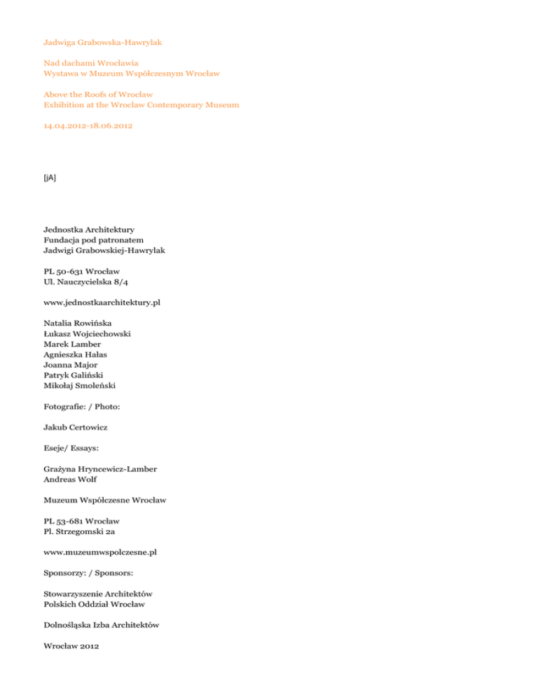 Jadwiga Grabowska-Hawrylak Nad dachami Wrocławia Wystawa w Muzeum Współczesnym Wrocław Above the Roofs of Wrocław Exhibition at the Wroclaw Contemporary Museum 14.04.2012-18.06.2012 [jA] Jednostka Architektury Fundacja pod patronatem Jadwigi Grabowskiej-Hawrylak PL 50-631 Wrocław Ul. Nauczycielska 8/4 www.jednostkaarchitektury.pl Natalia Rowińska Łukasz Wojciechowski Marek Lamber Agnieszka Hałas Joanna Major Patryk Galiński Mikołaj Smoleński Fotografie: / Photo: Jakub Certowicz Eseje/ Essays: Grażyna Hryncewicz-Lamber Andreas Wolf Muzeum Współczesne Wrocław PL 53-681 Wrocław Pl. Strzegomski 2a www.muzeumwspolczesne.pl Sponsorzy: / Sponsors: Stowarzyszenie Architektów Polskich Oddział Wrocław Dolnośląska Izba Architektów Wrocław 2012 Czas przeszły, czas przyszły Past Tense, Future Perfect Wystawę na temat prac Jadwigi Grabowskiej -Hawrylak zorganizowaliśmy, po to, żeby pokazać, jak mogą wyglądać jej budynki dzięki renowacji. Materiał graficzny powstał w oparciu o archiwalne rysunki, fotografie i wytyczne autorki. Pani Jadwiga zaakceptowała ich wygląd. The goal of the exhibition of the works by Jadwiga Grabowska-Hawrylak is to present how the buildings could look after their careful renovation. The graphics are based on archival images, drawings and mostly – the priceless directives of the author. It’s important for us that Mrs. Jadwiga has accepted the visualizations and found time to consult them. Jak pisze prof. Andreas Wolf w swoim eseju – jej budynki z jednej strony poddały się działaniu czasu, z drugiej są świadectwem wyjątkowego momentu architektonicznego, w którym powstały. Chcieliśmy przywrócić im świeżość jaką może mieć tylko projekt. Wizualizacje zdają się mieć dziś dużo większą moc przekonywania niż zaniedbane i wymagające uważnego spojrzenia obiekty modernistyczne. Obrazy te są optymistyczną wizją przyszłości tych budynków, zbyt często przypisywanych do błędów przeszłości. Architektura 10/1973 According to the following essay by Prof. Andreas Wolf from Leipzig her neglected buildings on one hand have gave up to passing time, on the other they are the symbol of outstanding optimism in 1970’s architecture. Thus we want to look at them as freshly, as we can perceive a project only. Moreover the renderings seem today to be more convenient than untidy buildings that need careful eye. These images are optimistic visions of the future for the edifices which are so often treated as the old mistakes. Wehikuły czasu Twórczość Jadwigi Grabowskiej-Hawrylak zajmuje szczególną pozycję w kontekście powojennej architektury europejskiej. Mimo praktyki ograniczonej przez socjalistyczne realia, Grabowska -Hawrylak była jedną z niewielu kobiet architektek w XX wieku, którym udało się stworzyć budynki łączące silną formalnie i przejrzystą pod względem funkcjonalnym zasadę ze śmiałym projektem i konstrukcją. Wartość tych uznanych i szeroko komentowanych cech staje się prawdziwie widoczna dla obserwatora, który spojrzy na jej budynki „w czasie i w przestrzeni” lub dokładniej – w czasie i w skali. należytej troski i dbałości w utrzymaniu, wiele elementów i detali demaskuje wiek 50 letnich konstrukcji. Wizualizacje komputerowe prezentowane podczas wystawy i w katalogu pokazują jak dbała renowacja i uaktualnienie mogłaby odmienić wygląd tych budynków. Architektura uwolniona od naleciałości czasu, jej elegancja i funkcjonalność zostałyby odkryte, a ponadczasowa jakość i waga budynków stałyby się widoczne. Ochrona i rewitalizacja tej architektonicznej spuścizny powinna być priorytetowym zadaniem dla władz miasta nie tylko ze względu na fakt, iż Wrocław ma zostać Europejską Stolicą Kultury w 2016 , ale choćby z szacunku dla 92-letniej autorki. Andreas Wolf, Lipsk 2012 Chciałbym zobrazować jakość budynków Grabowskiej-Hawrylak na przykładzie jej zespołu usługowo-mieszkaniowego powstałego w latach 70. przy placu Grunwaldzkim we Wrocławiu, który do dziś pozostaje ważnym punktem odniesienia w urbanistyce miasta. Zbliżając się do zespołu od strony Mostu Grunwaldzkiego, odznacza się on własnym charakterem – to zgrabnie ukształtowana całość, zdominowana przez wieżowce wyraźnie powiązane stylistycznie z japońskim metabolizmem. Nawet dzisiaj, optymistyczny duch architektury epoki, w której powstał zespół, oddziałuje na krajobraz miasta, manifestując obietnicę zintegrowanego życia miejskiego zarówno typologicznie, jak i poprzez klarowną strukturę wież. Utopijna moc plastycznej architektury Grabowskiej -Hawrylak staje się niemal surrealistyczna w zestawieniu z otaczającymi ją dziewiętnastowiecznymi zdobionymi fasadami wzdłuż ulicy Szczytnickiej. Silny kontrast jest widoczny nie tylko między XIX a XX wiecznymi formami urbanistycznymi, ale również między niemal całkowicie różnymi realiami. Teren stanowi więc miejsce urbanistycznych napięć , nie dziwi więc fakt, że kilku młodych wrocławskich artystów i architektów zdecydowało się założyć tam swoje pracownie. Przy bliższym spojrzeniu widoczne stają się kolejne oznaki upływu czasu. Z jednej strony wielowarstwowa elewacja nosi ślad toczącego się tam życia – personalizacja balkonów, umeblowania i oznakowania. Z drugiej zaś, ze względu na brak Tygodnik Polski, lata 60. (z archiwum J. G.-H.) Time Machines The work of Jadwiga Grabowska-Hawrylak occupies a special position within the context of European post-war architecture. Practising under the particular constraints of Polish socialist state planning and production, she was one of the few female architects in the 20th century who managed to create buildings that combined strong formal discipline and clear functionality with bold and experimental design and construction. The value of these recognized and much debated qualities becomes truly apparent to the sympathetic observer only when he encounte