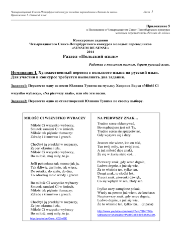 Четырнадцатый Санкт-Петербургский конкурс молодых переводчиков «Sensum de sensu» Приложение 5. Польский язык Лист 1 _____________________________________________________________________________ Приложение 5 к Положению о Четырнадцатом Санкт-Петербургском конкурсе молодых переводчиков «Sensum de sensu» Конкурсные задания Четырнадцатого Санкт-Петербургского конкурса молодых переводчиков «SENSUM DE SENSU» 2014 Раздел «Польский язык» Работая с польским языком, береги русский язык. Номинация I. Художественный перевод с польского языка на русский язык. Для участия в конкурсе требуется выполнить два задания. Задание1: Перевести одну из песен Юлиана Тувима на музыку Хенрика Варса «Miłość Сi wszystko wybaczy», «Na pierwszy znak», или обе эти песни. Задание2: Перевести одно из стихотворений Юлиана Тувима по своему выбору. MIŁOŚĆ CI WSZYSTKO WYBACZY Miłość Ci wszystko wybaczy, Smutek zamieni Ci w śmiech. Miłość tak pięknie tłumaczy: Zdradę i kłamstwo i grzech. NA PIERWSZY ZNAK… Trudno serce okłamywać, Bo mądrzejsze jest niż Ty, Trudno sercu się sprzeciwiać, Gdy wyrywa się i drży. Choćbyś ją przeklął w rozpaczy, Że jest okrutna i zła, Miłość Ci wszystko wybaczy, Bo miłość, mój miły, to ja. Jeszcze nie wiesz, kto on taki, Ten twój miły, ten twój ktoś, A już miłość daje znaki, Że się w życiu stało coś… Jeśli pokochasz tak mocno jak ja, Tak tkliwie, żarliwie, tak wiesz, Do ostatka, do szału, do dna, To zdradzaj mnie wtedy i grzesz. Pierwszy znak, gdy serce drgnie, Ledwo drgnie, a już się wie, Że to właśnie ten, tylko ten. Drugi znak, to słodki lek, Trzeci znak, piosenki dźwięk, Co się wplątał w sen, złoty sen. Bo miłość Ci wszystko wybaczy Smutek zamieni Ci w śmiech. Miłość tak pięknie tłumaczy: Zdradę i kłamstwo i grzech. Choćbyś ją przeklął w rozpaczy, Że jest okrutna i zła, Miłość Ci wszystko wybaczy Bo miłość, mój miły, to ja. http://youtu.be/Gere_K02mGE I tylko oczy zamglone pokaż, Wtedy na pewno już wiem, że kochasz: Na pierwszy znak, gdy serce drgnie, Ledwo drgnie, a już się wie, Że to właśnie ten, tylko ten… (2 раза) http://www.youtube.com/watch?v=JYD4tTfXbQ&feature=share&list=PL86C4EE50E452AC99. Четырнадцатый Санкт-Петербургский конкурс молодых переводчиков «Sensum de sensu» Приложение 5. Польский язык Лист 2 _____________________________________________________________________________ Юлиан Тувим (1894–1953) – замечательный польский поэт и переводчик, один из основателей поэтической группы «Скамандр». 2013 год объявлен в Польше Годом Тувима. Его лирические и сатирические произведения, а также стихи для детей хорошо известны в нашей стране. А вот предлагаемые Вам песни на русский язык никогда не переводились. Их исполнила знаменитая певица Ханка Ордонувна в кинофильме «Шпион в маске» (1933), поют их и сейчас.