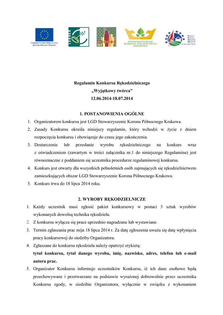 Regulamin Konkursu Rękodzielniczego „Wyjątkowy twórca” 12.06.2014-18.07.2014 1. POSTANOWIENIA OGÓLNE 1. Organizatorem konkursu jest LGD Stowarzyszenie Korona Północnego Krakowa. 2. Zasady Konkursu określa niniejszy regulamin, który wchodzi w życie z dniem rozpoczęcia konkursu i obowiązuje do czasu jego zakończenia. 3. Dostarczenie lub przesłanie wyrobu rękodzielniczego na konkurs wraz z oświadczeniem (zawartym w treści załącznika nr.1 do niniejszego Regulaminu) jest równoznaczne z poddaniem się uczestnika procedurze regulaminowej konkursu. 4. Konkurs jest otwarty dla wszystkich pełnoletnich osób zajmujących się rękodzielnictwem zamieszkujących obszar LGD Stowarzyszenie Korona Północnego Krakowa. 5. Konkurs trwa do 18 lipca 2014 roku. 2. WYROBY RĘKODZIELNICZE 1. Każdy uczestnik musi zgłosić pakiet konkursowy w postaci 3 sztuk wyrobów wykonanych dowolną technika rękodzieła. 2. Z konkursu wyłącza się prace uprzednio nagradzane lub wystawiane. 3. Termin zgłaszania prac mija 18 lipca 2014 r. Za datę zgłoszenia uważa się datę wpłynięcia pracy konkursowej do siedziby Organizatora. 4. Zgłaszane do konkursu rękodzieła należy opatrzyć etykietą: tytuł konkursu, tytuł danego wyrobu, imię, nazwisko, adres, telefon lub e-mail autora prac. 5. Organizator Konkursu informuje uczestników Konkursu, iż ich dane osobowe będą przechowywane i przetwarzane na podstawie wyrażonej dobrowolnie przez uczestnika Konkursu zgody, w siedzibie Organizatora, wyłącznie w związku z wykonaniem postanowień niniejszego Regulamin. Każdy z uczestników ma prawo do wglądu swoich danych oraz ich poprawiania. 6. Rękodzieła należy składać bezpośrednio w Biurze LGD Stowarzyszenie Korona Północnego Krakowa lub przesyłać na adres: Stowarzyszenie Korona Północnego Krakowa Raciborowice 126 32-091 Michałowice Z dopiskiem: konkurs rękodzielniczy „Wyjątkowy twórca”. 7. Wraz z przekazaniem rękodzieła należy przekazać podpisany formularz zgłoszeniowy, którego wzór stanowi załącznik nr 1 do niniejszego regulaminu. 3. HARMONOGRAM KONKURSU 1. Nadsyłanie prac do 18 lipca 2014 r. 2. Ocena jury do 31 lipca 2014 r. 3. Zawiadomienie o werdykcie jury oraz rozdanie nagród do 15 sierpnia 2014 r. 4. NAGRODY 1. Laureat pierwszego miejsca w konkursie otrzyma nagrodę w postaci Vouchera na weekendowy wyjazd dla 4 osób do Bałtowa o łącznej wartości do 1100,00 zł. 2. Laureat drugiego miejsca w konkursie otrzyma nagrodę w postaci Vouchera na weekendowy wyjazd dla 2 osób do hotelu w Zatorze o łącznej wartości do 740,00 zł. 3. Laureat trzeciego miejsca w konkursie otrzyma w postaci Vouchera na obiad rodzinny dla 4 osób w karczmie regionalnej o łącznej wartości do 300,00 zł. 4. Laureaci 3 wyróżnień otrzymają po zestawie gadżetów od LGD. 5. Laureaci zostaną powiadomieni przez Organizatora drogą e-mailową lub listowną. 5. PREZENTACJA RĘKODZIEŁA 1. Zgłoszenie wyrobów rękodzielniczych do konkursu oznacza wyrażenie zgody na ich nieodpłatne wykorzystywanie do promocji LGD Stowarzyszenie Korona Północnego Krakowa. Organizator zastrzega sobie prawo do prezentacji wyrobów na swoich stoiskach wystawienniczych, a także wykorzystania ich w innej formie podając dane autora (imię i nazwisko). 6. POSTANOWIENIA KOŃCOWE 1. Zgłoszenie wyrobów rękodzielniczych do konkursu jest jednoznaczne z przyjęciem warunków niniejszego regulaminu i oświadczeniem, że rękodzieło złożone na konkurs zostało wykonane osobiście. 2. Wyroby rękodzieła zgłoszone do konkursu nie będą zwracane i pozostaną w zbiorach LGD Stowarzyszenie Korona Północnego Krakowa. 3. Organizator nie ponosi odpowiedzialności za ewentualne szkody spowodowane opublikowaniem nieprawdziwych danych osobowych bądź innych nieprawdziwych informacji opartych na zgłoszeniach sporządzonych przez Uczestników. 4. Decyzje Jury są ostateczne i wiążące dla Uczestników 5. Ostateczna interpretacja niniejszego regulaminu należy do Organizatora. 6. W sprawach nieuregulowanych niniejszym Regulaminem zastosowanie mają przepisy kodeksu cywilnego. Załącznik nr 1 do Regulaminu konkursu rękodzielniczego „Wyjątkowy twórca” FORMULARZ ZGŁOSZENIOWY DLA UCZESTNIKA KONKURSU RĘKODZIELNICZEGO „WYJĄTKOWY TWÓRCA” IMIĘ: ………………………………………………………………………………………………… NAZWISKO: ………………………………………………………………………………………………… DATA URODZENIA: ………………………………………………………………………………………………… ADRES: ………………………………………………………………………………………………… ………………………………………………………………………………………………… TELEFON: ………………………………………………………………………………………………… E-MAIL: ………………………………………………………………………………………………… Data…………………………………. Czytelny podpis ………………………………….. OŚWIADCZENIE Udzielam LGD Stowarzyszenie Korona Północnego Krakowa niegraniczonej w czasie oraz nieodpłatnej licencji na zasadach określonych w niniejszym oświadczeniu złożonym przez mnie w dniu………………………… Wyrażam zgodę na przetwarzanie podanych powyżej moich danych osobowych przez LGD Stowarzyszenie Korona Północnego Krakowa (administratora danych osobowych) ‐ organizatora konkursu „Wyjątkowy twórca” w celu przeprowadzenia konkursu, dalszego przetwarzania moich danych osobowych związanego z późniejszym wykorzystaniem przesłanych przeze mnie prac, a także dla zrealizowania prawnie usprawiedliwionych celów LGD związanych z konkursem. Jestem świadomy, że moje dane osobowe będą przetwarza