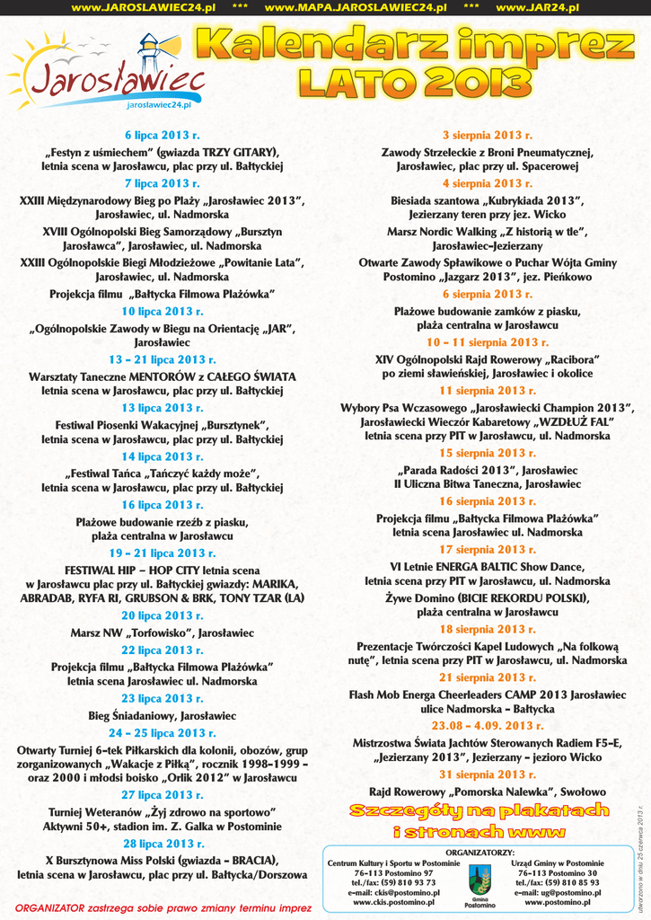 www.JAROSLAWIEC24.pl *** www.MAPA.JAROSLAWIEC24.pl *** www.JAR24.pl Kalendarz imprez LATO 2013 6 lipca 2013 r. 3 sierpnia 2013 r. „Festyn z uśmiechem” (gwiazda TRZY GITARY), letnia scena w Jarosławcu, plac przy ul. Bałtyckiej Zawody Strzeleckie z Broni Pneumatycznej, Jarosławiec, plac przy ul. Spacerowej 7 lipca 2013 r. 4 sierpnia 2013 r. XXIII Międzynarodowy Bieg po Plaży „Jarosławiec 2013”, Jarosławiec, ul. Nadmorska Biesiada szantowa „Kubrykiada 2013”, Jezierzany teren przy jez. Wicko XVIII Ogólnopolski Bieg Samorządowy „Bursztyn Jarosławca”, Jarosławiec, ul. Nadmorska Marsz Nordic Walking „Z historią w tle”, Jarosławiec-Jezierzany XXIII Ogólnopolskie Biegi Młodzieżowe „Powitanie Lata”, Jarosławiec, ul. Nadmorska Otwarte Zawody Spławikowe o Puchar Wójta Gminy Postomino „Jazgarz 2013”, jez. Pieńkowo Projekcja filmu „Bałtycka Filmowa Plażówka” 6 sierpnia 2013 r. 10 lipca 2013 r. Plażowe budowanie zamków z piasku, plaża centralna w Jarosławcu 13 - 21 lipca 2013 r. Warsztaty Taneczne MENTORÓW z CAŁEGO ŚWIATA letnia scena w Jarosławcu, plac przy ul. Bałtyckiej 13 lipca 2013 r. Festiwal Piosenki Wakacyjnej „Bursztynek”, letnia scena w Jarosławcu, plac przy ul. Bałtyckiej 14 lipca 2013 r. „Festiwal Tańca „Tańczyć każdy może”, letnia scena w Jarosławcu, plac przy ul. Bałtyckiej 16 lipca 2013 r. Plażowe budowanie rzeźb z piasku, plaża centralna w Jarosławcu 19 - 21 lipca 2013 r. FESTIWAL HIP – HOP CITY letnia scena w Jarosławcu plac przy ul. Bałtyckiej gwiazdy: MARIKA, ABRADAB, RYFA RI, GRUBSON & BRK, TONY TZAR (LA) 20 lipca 2013 r. Marsz NW „Torfowisko”, Jarosławiec 22 lipca 2013 r. Projekcja filmu „Bałtycka Filmowa Plażówka” letnia scena Jarosławiec ul. Nadmorska 23 lipca 2013 r. Bieg Śniadaniowy, Jarosławiec 24 - 25 lipca 2013 r. Otwarty Turniej 6-tek Piłkarskich dla kolonii, obozów, grup zorganizowanych „Wakacje z Piłką”, rocznik 1998-1999 oraz 2000 i młodsi boisko „Orlik 2012” w Jarosławcu 27 lipca 2013 r. Turniej Weteranów „Żyj zdrowo na sportowo” Aktywni 50+, stadion im. Z. Galka w Postominie 28 lipca 2013 r. X Bursztynowa Miss Polski (gwiazda - BRACIA), letnia scena w Jarosławcu, plac przy ul. Bałtycka/Dorszowa ORGANIZATOR zastrzega sobie prawo zmiany terminu imprez 10 - 11 sierpnia 2013 r. XIV Ogólnopolski Rajd Rowerowy „Racibora” po ziemi sławieńskiej, Jarosławiec i okolice 11 sierpnia 2013 r. Wybory Psa Wczasowego „Jarosławiecki Champion 2013”, Jarosławiecki Wieczór Kabaretowy „WZDŁUŻ FAL” letnia scena przy PIT w Jarosławcu, ul. Nadmorska 15 sierpnia 2013 r. „Parada Radości 2013”, Jarosławiec II Uliczna Bitwa Taneczna, Jarosławiec 16 sierpnia 2013 r. Projekcja filmu „Bałtycka Filmowa Plażówka” letnia scena Jarosławiec ul. Nadmorska 17 sierpnia 2013 r. VI Letnie ENERGA BALTIC Show Dance, letnia scena przy PIT w Jarosławcu, ul. Nadmorska Żywe Domino (BICIE REKORDU POLSKI), plaża centralna w Jarosławcu 18 sierpnia 2013 r. Prezentacje Twórczości Kapel Ludowych „Na folkową nutę”, letnia scena przy PIT w Jarosławcu, ul. Nadmorska 21 sierpnia 2013 r. Flash Mob Energa Cheerleaders CAMP 2013 Jarosławiec ulice Nadmorska - Bałtycka 23.08 - 4.09. 2013 r. Mistrzostwa Świata Jachtów Sterowanych Radiem F5-E, „Jezierzany 2013”, Jezierzany - jezioro Wicko 31 sierpnia 2013 r. Rajd Rowerowy „Pomorska Nalewka”, Swołowo Szczegóły na plakatach i stronach www ORGANIZATORZY: Centrum Kultury i Sportu w Postominie Urząd Gminy w Postominie 76-113 Postomino 97 76-113 Postomino 30 tel./fax: (59) 810 93 73 tel./fax: (59) 810 85 93 e-mail: [email protected] e-mail: [email protected] Gmina www.ckis.postomino.pl www.postomino.pl Postomino utworzono w dniu 25 czerwca 2013 r. „Ogólnopolskie Zawody w Biegu na Orientację „JAR”, Jarosławiec www.JAROSLAWIEC24.pl *** www.MAPA.JAROSLAWIEC24.pl *** www.JAR24.pl