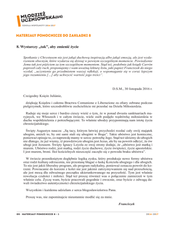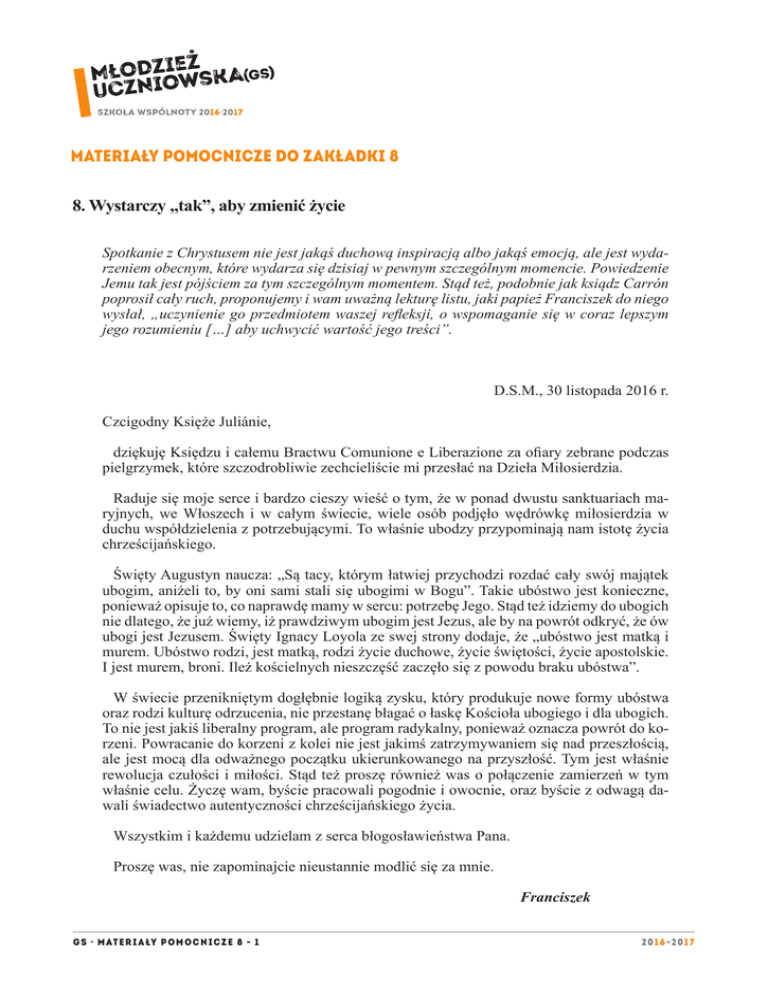 MATERIAŁY POMOCNICZE DO ZAKŁADKI 8 8. Wystarczy „tak”, aby zmienić życie Spotkanie z Chrystusem nie jest jakąś duchową inspiracją albo jakąś emocją, ale jest wydarzeniem obecnym, które wydarza się dzisiaj w pewnym szczególnym momencie. Powiedzenie Jemu tak jest pójściem za tym szczególnym momentem. Stąd też, podobnie jak ksiądz Carrón poprosił cały ruch, proponujemy i wam uważną lekturę listu, jaki papież Franciszek do niego wysłał, „uczynienie go przedmiotem waszej refleksji, o wspomaganie się w coraz lepszym jego rozumieniu […] aby uchwycić wartość jego treści”. D.S.M., 30 listopada 2016 r. Czcigodny Księże Juliánie, dziękuję Księdzu i całemu Bractwu Comunione e Liberazione za ofiary zebrane podczas pielgrzymek, które szczodrobliwie zechcieliście mi przesłać na Dzieła Miłosierdzia. Raduje się moje serce i bardzo cieszy wieść o tym, że w ponad dwustu sanktuariach maryjnych, we Włoszech i w całym świecie, wiele osób podjęło wędrówkę miłosierdzia w duchu współdzielenia z potrzebującymi. To właśnie ubodzy przypominają nam istotę życia chrześcijańskiego. Święty Augustyn naucza: „Są tacy, którym łatwiej przychodzi rozdać cały swój majątek ubogim, aniżeli to, by oni sami stali się ubogimi w Bogu”. Takie ubóstwo jest konieczne, ponieważ opisuje to, co naprawdę mamy w sercu: potrzebę Jego. Stąd też idziemy do ubogich nie dlatego, że już wiemy, iż prawdziwym ubogim jest Jezus, ale by na powrót odkryć, że ów ubogi jest Jezusem. Święty Ignacy Loyola ze swej strony dodaje, że „ubóstwo jest matką i murem. Ubóstwo rodzi, jest matką, rodzi życie duchowe, życie świętości, życie apostolskie. I jest murem, broni. Ileż kościelnych nieszczęść zaczęło się z powodu braku ubóstwa”. W świecie przenikniętym dogłębnie logiką zysku, który produkuje nowe formy ubóstwa oraz rodzi kulturę odrzucenia, nie przestanę błagać o łaskę Kościoła ubogiego i dla ubogich. To nie jest jakiś liberalny program, ale program radykalny, ponieważ oznacza powrót do korzeni. Powracanie do korzeni z kolei nie jest jakimś zatrzymywaniem się nad przeszłością, ale jest mocą dla odważnego początku ukierunkowanego na przyszłość. Tym jest właśnie rewolucja czułości i miłości. Stąd też proszę również was o połączenie zamierzeń w tym właśnie celu. Życzę wam, byście pracowali pogodnie i owocnie, oraz byście z odwagą dawali świadectwo autentyczności chrześcijańskiego życia. Wszystkim i każdemu udzielam z serca błogosławieństwa Pana. Proszę was, nie zapominajcie nieustannie modlić się za mnie. Franciszek G S · M AT E R I A ŁY P O M O C N I C Z E 8 - 1 2 0 1 6 -2 0 1 7