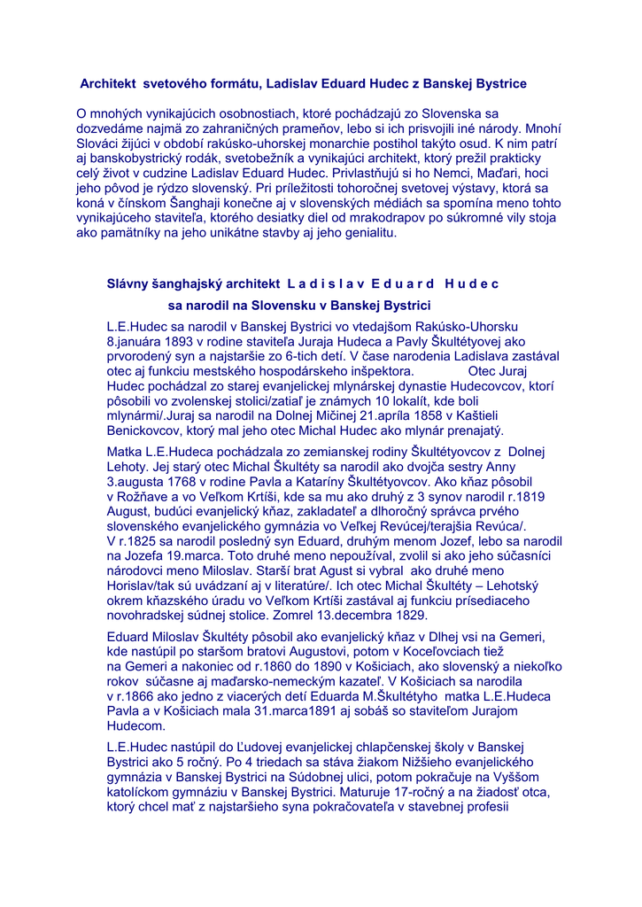 Architekt svetového formátu, Ladislav Eduard Hudec z Banskej Bystrice O mnohých vynikajúcich osobnostiach, ktoré pochádzajú zo Slovenska sa dozvedáme najmä zo zahraničných prameňov, lebo si ich prisvojili iné národy. Mnohí Slováci žijúci v období rakúsko-uhorskej monarchie postihol takýto osud. K nim patrí aj banskobystrický rodák, svetobežník a vynikajúci architekt, ktorý prežil prakticky celý život v cudzine Ladislav Eduard Hudec. Privlastňujú si ho Nemci, Maďari, hoci jeho pôvod je rýdzo slovenský. Pri príležitosti tohoročnej svetovej výstavy, ktorá sa koná v čínskom Šanghaji konečne aj v slovenských médiách sa spomína meno tohto vynikajúceho staviteľa, ktorého desiatky diel od mrakodrapov po súkromné vily stoja ako pamätníky na jeho unikátne stavby aj jeho genialitu. Slávny šanghajský architekt L a d i s l a v E d u a r d H u d e c sa narodil na Slovensku v Banskej Bystrici L.E.Hudec sa narodil v Banskej Bystrici vo vtedajšom Rakúsko-Uhorsku 8.januára 1893 v rodine staviteľa Juraja Hudeca a Pavly Škultétyovej ako prvorodený syn a najstaršie zo 6-tich detí. V čase narodenia Ladislava zastával otec aj funkciu mestského hospodárskeho inšpektora. Otec Juraj Hudec pochádzal zo starej evanjelickej mlynárskej dynastie Hudecovcov, ktorí pôsobili vo zvolenskej stolici/zatiaľ je známych 10 lokalít, kde boli mlynármi/.Juraj sa narodil na Dolnej Mičinej 21.apríla 1858 v Kaštieli Benickovcov, ktorý mal jeho otec Michal Hudec ako mlynár prenajatý. Matka L.E.Hudeca pochádzala zo zemianskej rodiny Škultétyovcov z Dolnej Lehoty. Jej starý otec Michal Škultéty sa narodil ako dvojča sestry Anny 3.augusta 1768 v rodine Pavla a Kataríny Škultétyovcov. Ako kňaz pôsobil v Rožňave a vo Veľkom Krtíši, kde sa mu ako druhý z 3 synov narodil r.1819 August, budúci evanjelický kňaz, zakladateľ a dlhoročný správca prvého slovenského evanjelického gymnázia vo Veľkej Revúcej/terajšia Revúca/. V r.1825 sa narodil posledný syn Eduard, druhým menom Jozef, lebo sa narodil na Jozefa 19.marca. Toto druhé meno nepoužíval, zvolil si ako jeho súčasníci národovci meno Miloslav. Starší brat Agust si vybral ako druhé meno Horislav/tak sú uvádzaní aj v literatúre/. Ich otec Michal Škultéty – Lehotský okrem kňazského úradu vo Veľkom Krtíši zastával aj funkciu prísediaceho novohradskej súdnej stolice. Zomrel 13.decembra 1829. Eduard Miloslav Škultéty pôsobil ako evanjelický kňaz v Dlhej vsi na Gemeri, kde nastúpil po staršom bratovi Augustovi, potom v Koceľovciach tiež na Gemeri a nakoniec od r.1860 do 1890 v Košiciach, ako slovenský a niekoľko rokov súčasne aj maďarsko-nemeckým kazateľ. V Košiciach sa narodila v r.1866 ako jedno z viacerých detí Eduarda M.Škultétyho matka L.E.Hudeca Pavla a v Košiciach mala 31.marca1891 aj sobáš so staviteľom Jurajom Hudecom. L.E.Hudec nastúpil do Ľudovej evanjelickej chlapčenskej školy v Banskej Bystrici ako 5 ročný. Po 4 triedach sa stáva žiakom Nižšieho evanjelického gymnázia v Banskej Bystrici na Súdobnej ulici, potom pokračuje na Vyššom katolíckom gymnáziu v Banskej Bystrici. Maturuje 17-ročný a na žiadosť otca, ktorý chcel mať z najstaršieho syna pokračovateľa v stavebnej profesii odchádza r.1910 študovať architektúru na Kráľovskú technickú univerzitu v Budapešti. Štúdium absolvoval v júni 1914. Počas svetovej vojny bol ako vojak rakúsko-uhorskej armády odvelený na ruský front. V júni 1816 bol ranený do nohy a zajatý. Bol umiestnený vo veľkom zajateckom tábore v Chabarovsku na západnej Sibíri. Počas prevozu vlakom na iné miesto sa v novembri 1918 podarilo L.E.Hudecovi ujsť. Dostal sa do Šanghaja, kde začal ako kreslič pracovať vo firme „Kerry – zaoceánska spoločnosť“. Za niekoľko rokov sa vypracoval až na post vedúceho architekta a partnera firmy. V r.1925 sa osamostatňuje a zakladá vlastnú firmu „Hudec zaoceánska spoločnosť“. Až do opustenia Šanghaja v r.1947 Hudec postavil vyše 65 budov, z ktorých je väčšina zachovaných a viac ako 20 pamiatkovo chránených. Najznámejšou budovou je Park hotel dokončený v decembri 1934, niekoľko desaťročí najvyššia budova Ázie. Medzi chránené stavby patrí Americký klub, Oblastná nemocnica dokončená r.1926 s klimatizovanými operačnými sálami, ale aj čakárňami pre pacientov, Nemocnica Margaret Wiliamsovej, budova Kresťanského literárneho spolku, budova Čínskeho baptistického vydavateľstva, Dievčenská škola Mc Tyiereho, Grand Theater, Nanyangská verejná akadémia, Sanghai Beer Company, niekoľko kostolov, nájomných apartmánových domov, veľa súkromných rezidencii boháčov i dom pre vlastnú rodinu. Počas rokov strávených v Šanghaji L.E.Hudec navštívil veľa krajín Európy, bol nielen výborným architektom, ale aj dokumentaristom - filmárom a kresličom/ kresliť sa učil u Dominika Skuteckého/. Poznatky z ciest a inšpirácie zachytené v notesoch, ktoré nosil vždy so sebou zúžitkoval pri projektovaní svojich stavieb. V Šanghaji sa L.E.Hudec oženil s Gizelou Meyerovou, dcérou bohatého nemeckého obchodníka Carla Theodora Meyera. Ich 3 deti – Martin Juraj /1924/, Teodor Peter/1926/ a Alessa/1928 / museli s rodičmi tajne opustiť Šanghai v r.1947. Po krátkom pobyte vo Švajčiarsku sa presťahovali do USA. L.E.Hudec nebol len vynikajúcim architektom a technickým intelektuálom. Škola a iste aj rodinná história vzbudili v ňom záujem aj o humanitné predmety – históriu, filozofiu a teológiu. Keďže prestal pôsobiť ako architekt mohol sa v posledných rokoch života naplno venovať svojim záujmom. Ladislav Eduard Hudec, architekt, ktorý zmenil tvár Šanghaja zomrel v Kalifornii – Berkeley dňa 26.októbra 1958 vo veku 65 rokov. Urna s popolom bola uložená do rodinnej hrobky na evanjelickom cintoríne v Banskej by