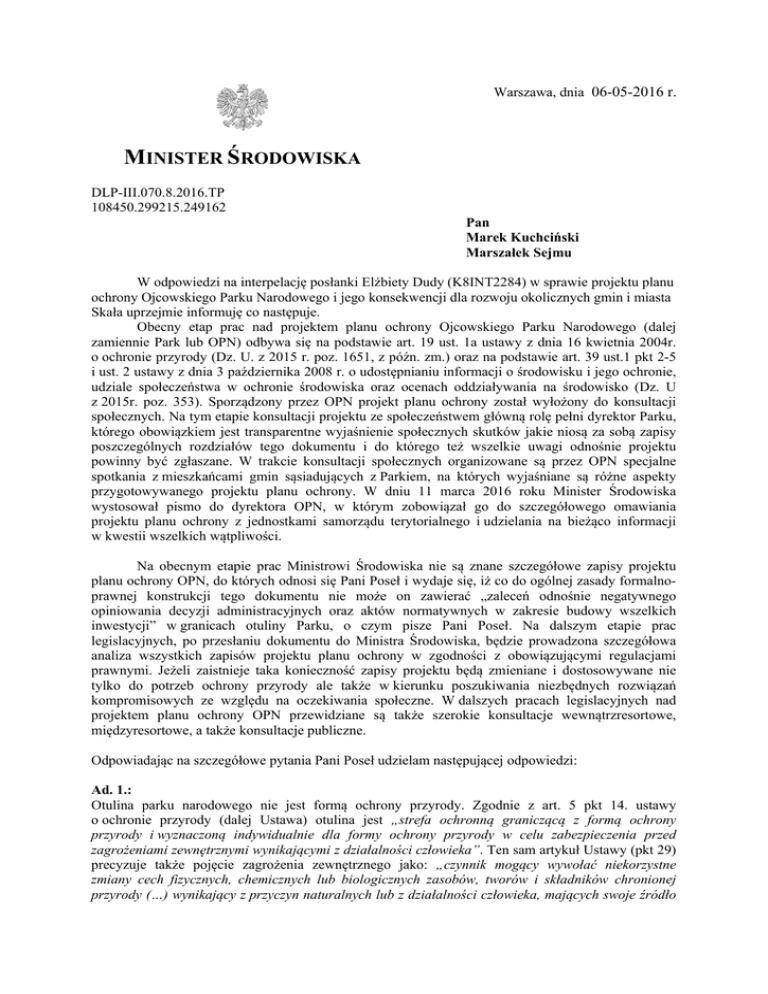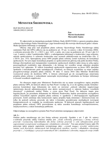 Warszawa, dnia 06-05-2016 r. MINISTER ŚRODOWISKA DLP-III.070.8.2016.TP 108450.299215.249162 Pan Marek Kuchciński Marszałek Sejmu W odpowiedzi na interpelację posłanki Elżbiety Dudy (K8INT2284) w sprawie projektu planu ochrony Ojcowskiego Parku Narodowego i jego konsekwencji dla rozwoju okolicznych gmin i miasta Skała uprzejmie informuję co następuje. Obecny etap prac nad projektem planu ochrony Ojcowskiego Parku Narodowego (dalej zamiennie Park lub OPN) odbywa się na podstawie art. 19 ust. 1a ustawy z dnia 16 kwietnia 2004r. o ochronie przyrody (Dz. U. z 2015 r. poz. 1651, z późn. zm.) oraz na podstawie art. 39 ust.1 pkt 2-5 i ust. 2 ustawy z dnia 3 października 2008 r. o udostępnianiu informacji o środowisku i jego ochronie, udziale społeczeństwa w ochronie środowiska oraz ocenach oddziaływania na środowisko (Dz. U z 2015r. poz. 353). Sporządzony przez OPN projekt planu ochrony został wyłożony do konsultacji społecznych. Na tym etapie konsultacji projektu ze społeczeństwem główną rolę pełni dyrektor Parku, którego obowiązkiem jest transparentne wyjaśnienie społecznych skutków jakie niosą za sobą zapisy poszczególnych rozdziałów tego dokumentu i do którego też wszelkie uwagi odnośnie projektu powinny być zgłaszane. W trakcie konsultacji społecznych organizowane są przez OPN specjalne spotkania z mieszkańcami gmin sąsiadujących z Parkiem, na których wyjaśniane są różne aspekty przygotowywanego projektu planu ochrony. W dniu 11 marca 2016 roku Minister Środowiska wystosował pismo do dyrektora OPN, w którym zobowiązał go do szczegółowego omawiania projektu planu ochrony z jednostkami samorządu terytorialnego i udzielania na bieżąco informacji w kwestii wszelkich wątpliwości. Na obecnym etapie prac Ministrowi Środowiska nie są znane szczegółowe zapisy projektu planu ochrony OPN, do których odnosi się Pani Poseł i wydaje się, iż co do ogólnej zasady formalnoprawnej konstrukcji tego dokumentu nie może on zawierać „zaleceń odnośnie negatywnego opiniowania decyzji administracyjnych oraz aktów normatywnych w zakresie budowy wszelkich inwestycji” w granicach otuliny Parku, o czym pisze Pani Poseł. Na dalszym etapie prac legislacyjnych, po przesłaniu dokumentu do Ministra Środowiska, będzie prowadzona szczegółowa analiza wszystkich zapisów projektu planu ochrony w zgodności z obowiązującymi regulacjami prawnymi. Jeżeli zaistnieje taka konieczność zapisy projektu będą zmieniane i dostosowywane nie tylko do potrzeb ochrony przyrody ale także w kierunku poszukiwania niezbędnych rozwiązań kompromisowych ze względu na oczekiwania społeczne. W dalszych pracach legislacyjnych nad projektem planu ochrony OPN przewidziane są także szerokie konsultacje wewnątrzresortowe, międzyresortowe, a także konsultacje publiczne. Odpowiadając na szczegółowe pytania Pani Poseł udzielam następującej odpowiedzi: Ad. 1.: Otulina parku narodowego nie jest formą ochrony przyrody. Zgodnie z art. 5 pkt 14. ustawy o ochronie przyrody (dalej Ustawa) otulina jest „strefa ochronną graniczącą z formą ochrony przyrody i wyznaczoną indywidualnie dla formy ochrony przyrody w celu zabezpieczenia przed zagrożeniami zewnętrznymi wynikającymi z działalności człowieka”. Ten sam artykuł Ustawy (pkt 29) precyzuje także pojęcie zagrożenia zewnętrznego jako: „czynnik mogący wywołać niekorzystne zmiany cech fizycznych, chemicznych lub biologicznych zasobów, tworów i składników chronionej przyrody (…) wynikający z przyczyn naturalnych lub z działalności człowieka, mających swoje źródło poza granicami obszarów lub obiektów podlegających ochronie prawnej”. Dlatego też, na podstawie art. 20 ust. 1 pkt 2 Ustawy w projektach planów ochrony wyszczególnia się, między innymi, potencjalne zagrożenia zewnętrzne które mogą mieć negatywny wpływ na przyrodę parku narodowego. Na mocy tego samego artykułu Ustawy plan ochrony powinien zawierać charakterystykę i ocenę stanu zagospodarowania przestrzennego, o której wspomina Pani Poseł. Plan ochrony nie może wprowadzać w powyższym względzie zakazów na obszarze otuliny parku narodowego, a co najwyżej „ustalenia do studiów uwarunkowań i kierunków zagospodarowania przestrzennego (…) dotyczące eliminacji lub ograniczania zagrożeń wewnętrznych lub zewnętrznych” – (art. 20 ust. 3 pkt 7 Ustawy). Na podstawie powyższych regulacji ustawowych plan ochrony może wprowadzać zapisy skutkujące w określonych przypadkach wskazaniami o charakterze postulatywnym do wymienionych powyżej dokumentów planistycznych. Zapisy planu ochrony nie powinny przyczyniać się do ograniczania rozwoju gmin w sąsiedztwie OPN czy też miasta Skała, o czym pisze Pani Poseł. Jedną z idei nadrzędnych planu ochrony w powyższym względzie - jest zaprezentowanie zagrożeń, przede wszystkim zewnętrznych (bezpośrednich lub pośrednich) skutkujących deprecjacją walorów przyrodniczych samego parku narodowego jako ustanowionej z mocy Ustawy najwyższej formy ochrony przyrody w Polsce. Chodzi w tym względzie o wyspecyfikowanie zagrożeń istotnych z punktu widzenia funkcjonowania parku narodowego. Zagrożenia, o których mowa powinny być uwzględniane przez władze samorządowe w tworzonych dokumentach planistycznych wyższej rangi, w szczególności, w miejscowych planach zagospodarowania przestrzennego gmin. Należy w tym miejscu nadmienić, że wskazywanie zagrożeń, o którym mowa, musi się opierać na realnych (eksperckich, studialnych) ustaleniach, a nie cechować się przypadkowym charakterem. Ad.2.: Co do zasady plan ochrony nie może prowadzić do ograniczenia wykorzystania prawa własności obywateli. Ograniczenia prawa własności są możliwe na podstawie regulacji określonych wyłącznie w Ustawie. W tym względzie na przykład, kiedy planowana inwestycja w otulinie Parku stanowiłaby udowodnione (na podstawie opracowań spe