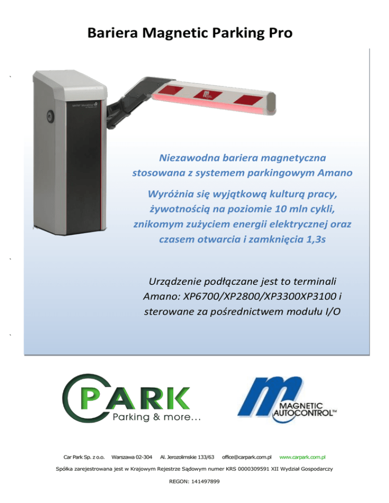Bariera Magnetic Parking Pro ` Niezawodna bariera magnetyczna stosowana z systemem parkingowym Amano Wyróżnia się wyjątkową kulturą pracy, żywotnością na poziomie 10 mln cykli, znikomym zużyciem energii elektrycznej oraz czasem otwarcia i zamknięcia 1,3s ` Urządzenie podłączane jest to terminali Amano: XP6700/XP2800/XP3300XP3100 i sterowane za pośrednictwem modułu I/O ` Car Park Sp. z o.o. Warszawa 02-304 Al. Jerozolimskie 133/63 [email protected] www.carpark.com.pl Spółka zarejestrowana jest w Krajowym Rejestrze Sądowym numer KRS 0000309591 XII Wydział Gospodarczy REGON: 141497899 Specyfikacja: Sterownik Główny: Dedykowany kontroler MGC Pro w pełni kontrolujący wszelkie parametry pracy W standardzie zintegrowany 2 kanałowy detektor pętli indukcyjnych Wyświetlacz: Zintegrowany w sterowniku Czasy pracy: Otwarcie i zamknięcie bariery w 1,3 sekundy Obudowa: Aluminiowa – malowana proszkowo Podstawa mocująca – stal nierdzewna malowana proszkowo Ramię szlabanu: Prostokątne, aluminiowe, malowane proszkowo z naklejkami odblaskowymi Ramię proste 3,5m standard Opcjonalnie moduł łamany, max. prześwit 2,5m Komunikacja: Moduł I/O - 8 wejść/6 wyjść przekaźnikowych/4 cyfrowe Parametry Pracy: Definiowalne scenariusze działania w przypadku: Wyłamania ramienia Wykrycia wandalizmu Napotkania przeszkody Braku zasilania (auto otwarcie) Warunki Pracy: Temperatura od -30°C do +55°C Główne Zasilanie: Waga: 85 - 264 V AC 50/60 Hz Zintegrowany zasilacz 24V 6W Spoczynkowo 90W Szczytowo 40 kg Wymiary: 315 x 360 x 915 Ilość cykli: Gwarantowane 10 mln Gwarancja: 2 lata Pobór mocy: Car Park Sp. z o.o. Warszawa 02-304 Al. Jerozolimskie 133/63 [email protected] www.carpark.com.pl Spółka zarejestrowana jest w Krajowym Rejestrze Sądowym numer KRS 0000309591 XII Wydział Gospodarczy REGON: 141497899