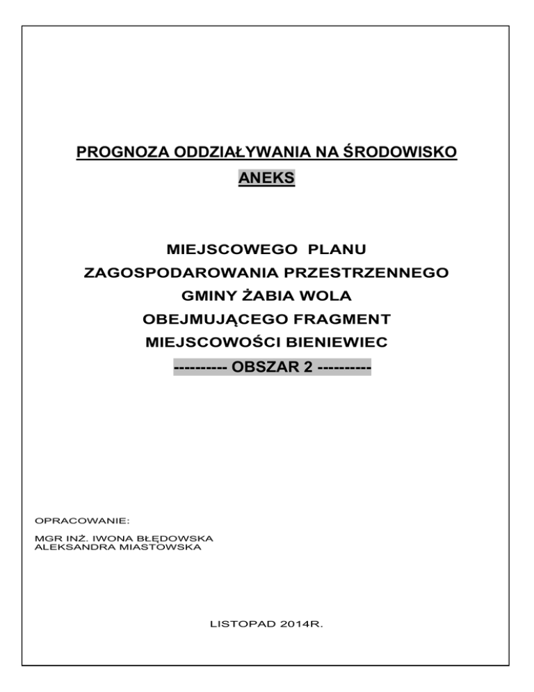 PROGNOZA ODDZIAŁYWANIA NA ŚRODOWISKO ANEKS MIEJSCOWEGO PLANU ZAGOSPODAROWANIA PRZESTRZENNEGO GMINY ŻABIA WOLA OBEJMUJĄCEGO FRAGMENT MIEJSCOWOŚCI BIENIEWIEC ---------- OBSZAR 2 ---------- OPRACOWANIE: MGR INŻ. IWONA BŁĘDOWSKA ALEKSANDRA MIASTOWSKA LISTOPAD 2014R. ANEKS DO MIEJSCOWY PLAN ZAGOSPODAROWANIA PRZESTRZENNEGO GMINY ŻABIA WOLA obejmujący fragment miejscowości Bieniewiec – obszar II. SPIS TREŚCI: I. Informacje wstępne. II. Podstawowe informacje dotyczące projektu planu oraz wprowadzonych zmian. III. Wprowadzone zmiany, a ustalenia Studium uwarunkowań i kierunków zagospodarowania przestrzennego Gminy Żabia Wola. IV. Analiza przewidywanego oddziaływania projektu planu na środowisko. 2 ANEKS DO MIEJSCOWY PLAN ZAGOSPODAROWANIA PRZESTRZENNEGO GMINY ŻABIA WOLA obejmujący fragment miejscowości Bieniewiec – obszar II. I. Informacje wstępne Niniejsze opracowanie jest aneksem do prognozy oddziaływania na środowisko miejscowego planu zagospodarowania przestrzennego gminy Żabia Wola obejmującego fragment miejscowości Bieniewiec wykonanym po przeprowadzeniu analiz i złożeniu uwag do projektu miejscowego planu zagospodarowania przestrzennego podczas wyłożenia do publicznego wglądu zgodnie z Ustawą o planowaniu i zagospodarowaniu przestrzennym. Podjęto decyzję w sprawie zmiany Uchwały Nr 23/V/2007 Rady Gminy Żabia Wola z dnia 20 marca 2007r w sprawie przystąpienia do sporządzenia zmiany miejscowego planu zagospodarowania przestrzennego Gminy Żabia Wola obejmującego fragment miejscowości Bieniewiec. W wyniku czego obszar opracowania planu zgodny z Uchwałą Nr 23/V/2007 został podzielony na dwa obszary (OBSZAR 1 i OBSZAR 2), w granicach, których zostaną sporządzone i uchwalone miejscowe plany zagospodarowania przestrzennego. Obecna kontynuacja sporządzenia Planu dotyczy OBSZARU 2 i podlega przepisom ustawy z dnia 27 marca 2003r o planowaniu i zagospodarowaniu przestrzennym. Projekt Planu sporządzony jest zgodnie z ww. ustawą, i z przepisami wykonawczymi wydanymi na jej podstawie oraz z przepisami odrębnymi związanymi z planowaniem i zagospodarowaniem przestrzennym oraz zgodnie z ustaleniami Studium uwarunkowań i kierunków zagospodarowania przestrzennego Gminy Żabia Wola. Uwzględnia ponadto uwarunkowania i zmiany w obszarze objętym Planem wynikające ze stanu faktycznego oraz zamierzenia i oczekiwania inwestycyjne. Zaktualizowany Aneks zawiera zestawienie skutków, które mogą wynikać z projektowanego przeznaczenia terenu i realizacji ustaleń projektu planu miejscowego w kontekście wprowadzonych zmian. Opisano również działania mające na celu ograniczenie niekorzystnych oddziaływań związanych z planowanym zagospodarowaniem terenu. W zakresie stanu środowiska nie nastąpiły zmiany w odniesieniu do czasu opracowania pierwotnej „ Prognozy ....”. Proponowane rozwiązania w zakresie systemu przyrodniczego w projekcie Planu dla OBSZARU 2, są zgodne w tym zakresie ze Studium uwarunkowań i kierunków zagospodarowania przestrzennego Gminy Żabia Wola przyjętego Uchwałą Nr 8/XVII/2012 z dnia 24 kwietnia 2012r Rady Gminy Żabia Wola. Niniejszy Aneks należy rozpatrywać łącznie z „Prognozą.......... z lipca 2009r.” 3 ANEKS DO MIEJSCOWY PLAN ZAGOSPODAROWANIA PRZESTRZENNEGO GMINY ŻABIA WOLA obejmujący fragment miejscowości Bieniewiec – obszar II. II. Podstawowe informacje dotyczące projektu planu oraz wprowadzonych zmian Plan dla OBSZARU 2 obejmuje fragment miejscowości Bieniewiec położony w bezpośrednim sąsiedztwie drogi krajowej nr 8 Warszawa – Wrocław, przez który przebiega droga gminna (ul. Zagrodowa) stanowiąca obecnie główną oś rozwoju zabudowy mieszkaniowej jednorodzinnej i zagrodowej. Granica obszaru planu wyznaczona jest: od północy - granicą administracyjną miejscowości Bieniewiec; od południowego – wschodu - granicą administracyjną miejscowości Bieniewiec; od południowego – zachodu - granice wyznacza północno- wschodnia granica działki drogi o nr ewid. 116; od wschodu - wyznaczają granice administracyjne miejscowości Bieniewiec; od zachodu - granice wyznacza zachodnia granica działki 21, dalej przecięci działki drogi nr ew. 59/1 (ul. Zagrodowa), dalej zachodnia granica działki 68/11, 68/12, 68/2, 68/3, 68/4. Orientacyjna lokalizacja terenu objętego prognozą na tle gminy Żabia Wola 4 ANEKS DO MIEJSCOWY PLAN ZAGOSPODAROWANIA PRZESTRZENNEGO GMINY ŻABIA WOLA obejmujący fragment miejscowości Bieniewiec – obszar II. Plan obejmuje część miejscowości Bieniewiec, o powierzchni 114,71 ha, w tym wyłączony teren, dla którego obowiązuje miejscowy plany zagospodarowania przestrzennego, o powierzchni 13,90ha. Obecnie jest to obszar w części północnej głównie użytkowany rolniczo. Zabudowa mieszkaniowa jednorodzinna oraz zabudowa zagrodowa zlokalizowane są wzdłuż biegnącej przez centralną część obszaru drogę gminną (ul. Zagrodowa). Odnośnie zabudowy Plan wprowadza możliwość powiększenia już istniejącej zabudowy oraz wyznacza wzdłuż drogi krajowej nr 8 tereny produkcyjno – usługowe. Opracowany projekt Planu posiada charakter porządkująco – inwestycyjny. Wprowadzone zmiany: - zmiana granic obszaru opracowania projektu Planu - dostosowanie projektu Planu do wytycznych w Studium. III. Wprowadzone zmiany, a ustalenia Studium uwarunkowań i kierunków zagospodarowania przestrzennego Gminy Żabia Wola Lokalizacja form zagospodarowania terenu, jak i inne ustalenia w tym zasady ochrony środowiska przyrodniczego, zagospodarowania zostały przestrzennego na opracowane podstawie w projekcie wytycznych miejscowego określonych w planu Studium Uwarunkowań i Kierunków zagospodarowania Przestrzennego gminy Żabia Wola (Uchwała Nr 8/XVII/2012 z dnia 24 kwietnia 2012r Rady Gminy Żabia Wola) i nie naruszają ich ustaleń. Zgodnie ze Studium Uwarunkowań i Kierunków Zagospodarowania Przestrzennego gminy Żabia Wola przedmiotowy teren zlokalizowany jest