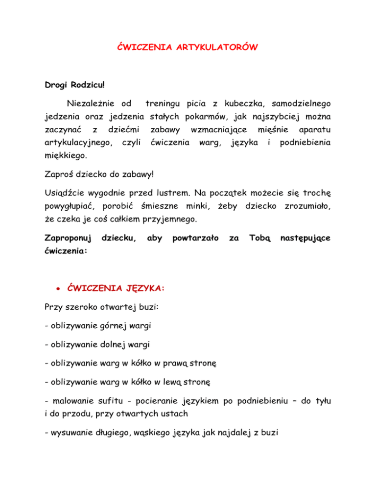 ĆWICZENIA ARTYKULATORÓW Drogi Rodzicu! Niezależnie od
