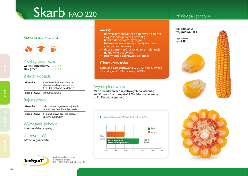 Skarb FAO 220 Morfologia i genetyka Zalety Kierunki użytkowania NOWOŚCI Profil agronomiczny wzrost początkowy m m m stay green mmm • uniwersalny charakter do uprawy na ziarno i wysokoenergetyczną kiszonkę • bardzo dobry wczesny wigor • toleruje wczesne siewy i mniej zasobne stanowiska glebowe • dobra odporność na wyleganie i tolerancja na głownię guzowatą • rośliny długo zachowują zieloność Charakterystyka Odmiana zarejestrowana w 2012 r. na Słowacji z katalogu Wspólnotowego (CCA). Zalecana obsada WCZESNE kiszonka ziarno i CCM 95 000 roślin/ha na słabszych stanowiskach glebowych do 110 000 roślin/ha na dobrych 80 000 roślin/ha ŚREDNIOWCZESNE Rejon uprawy kiszonka cały kraj, szczególnie w rejonach mniej korzystnie klimatycznych ziarno i CCM II i południowa część III rejonu uprawy kukurydzy Wymagania glebowe toleruje słabsze gleby Zdrowotność ŚREDNIOPÓŹNE Głownia guzowata m m Wyłączny dystrybutor na terenie Polski tel. +48 52 384 28 51 wew. 131 32 Wyniki plonowania W doświadczeniach rejestrowych na kiszonkę na Słowacji Skarb uzyskał 176 dt/ha suchej masy z 51,1% udziałem kolb \\ Doświadczenia rejestrowe COBORU 2009 r. typ odmiany: trójliniowa (TC) typ ziarna: semi flint SKARB – WY£¥CZNY DYSTRYBUTOR NA POLSKÊ ŚREDNIOPÓŹNE ŚREDNIOWCZESNE WCZESNE NOWOŚCI NA KAŻDYM POLU
