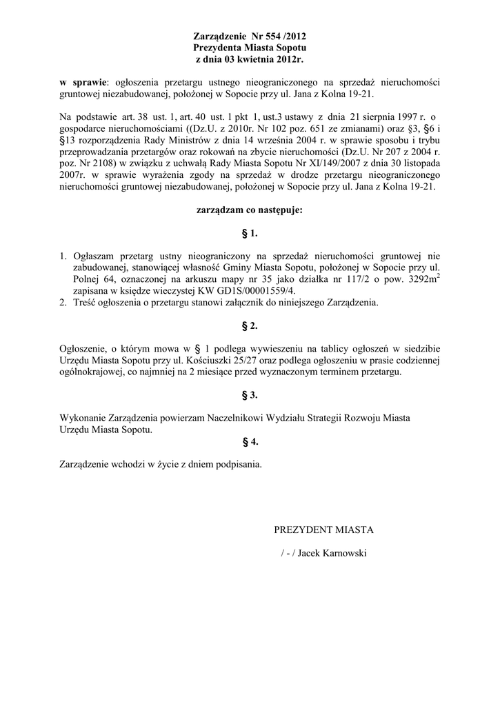 Zarządzenie Nr 554 /2012 Prezydenta Miasta Sopotu z dnia 03 kwietnia 2012r. w sprawie: ogłoszenia przetargu ustnego nieograniczonego na sprzedaż nieruchomości gruntowej niezabudowanej, położonej w Sopocie przy ul. Jana z Kolna 19-21. Na podstawie art. 38 ust. 1, art. 40 ust. 1 pkt 1, ust.3 ustawy z dnia 21 sierpnia 1997 r. o gospodarce nieruchomościami ((Dz.U. z 2010r. Nr 102 poz. 651 ze zmianami) oraz §3, §6 i §13 rozporządzenia Rady Ministrów z dnia 14 września 2004 r. w sprawie sposobu i trybu przeprowadzania przetargów oraz rokowań na zbycie nieruchomości (Dz.U. Nr 207 z 2004 r. poz. Nr 2108) w związku z uchwałą Rady Miasta Sopotu Nr XI/149/2007 z dnia 30 listopada 2007r. w sprawie wyrażenia zgody na sprzedaż w drodze przetargu nieograniczonego nieruchomości gruntowej niezabudowanej, położonej w Sopocie przy ul. Jana z Kolna 19-21. zarządzam co następuje: § 1. 1. Ogłaszam przetarg ustny nieograniczony na sprzedaż nieruchomości gruntowej nie zabudowanej, stanowiącej własność Gminy Miasta Sopotu, położonej w Sopocie przy ul. Polnej 64, oznaczonej na arkuszu mapy nr 35 jako działka nr 117/2 o pow. 3292m2 zapisana w księdze wieczystej KW GD1S/00001559/4. 2. Treść ogłoszenia o przetargu stanowi załącznik do niniejszego Zarządzenia. § 2. Ogłoszenie, o którym mowa w § 1 podlega wywieszeniu na tablicy ogłoszeń w siedzibie Urzędu Miasta Sopotu przy ul. Kościuszki 25/27 oraz podlega ogłoszeniu w prasie codziennej ogólnokrajowej, co najmniej na 2 miesiące przed wyznaczonym terminem przetargu. § 3. Wykonanie Zarządzenia powierzam Naczelnikowi Wydziału Strategii Rozwoju Miasta Urzędu Miasta Sopotu. § 4. Zarządzenie wchodzi w życie z dniem podpisania. PREZYDENT MIASTA / - / Jacek Karnowski Załącznik do Zarządzenia Nr 554 //2012 Prezydenta Miasta Sopotu z dnia 03 kwietnia 2012r. Prezydent Miasta Sopotu 81-704 Sopot, ul. Kościuszki 25/27, fax 551-01-33 ogłasza przetarg ustny nieograniczony na sprzedaż nieruchomości gruntowej niezabudowanej, stanowiącej własność Gminy Miasta Sopotu (strona internetowa www.sopot.pl) 1. Lokalizacja : Sopot, ul. Jana z Kolna 19-21. 2. Oznaczenie nieruchomości wg danych z ewidencji gruntów: Własność Gminy Miasta Sopotu, arkusz mapy nr 35, działka nr 117/2, KW GD1S/00001559/4. 3. Powierzchnia nieruchomości: 3292m2 4. Opis nieruchomości: Nieruchomość położona w Sopocie Wyścigach, w niedalekim sąsiedztwie terenu wyścigów konnych, targowiska miejskiego oraz stacji kolejki SKM. Działka stanowi płaski teren zielony, graniczący z nieruchomością zabudowaną budynkiem Wyższej Szkoły Psychologii Społecznej. 5. Obciążenia nieruchomości i inne zobowiązania : nieruchomość wolna jest od obciążeń i innych zobowiązań. 6. Przeznaczenie nieruchomości i sposób ich zagospodarowania: Miejscowy plan zagospodarowania przestrzennego miasta (Uchwała Rady Miasta Sopotu Nr X/90/2011 z dnia 29 czerwca 2011r.) karta terenu nr M-6/05, numer terenu 05, przeznaczenie: teren zabudowy usługowej; zakres dopuszczalnych funkcji usługowych: oświata i nauka. Warunki gestorów sieci obowiązujące inwestora znajdują się w Wydziale Strategii Rozwoju Miasta UM Sopotu - do wglądu i zapoznania się. Istniejące warunki nie zwalniają inwestora z obowiązku wystąpienia do gestorów sieci z wnioskiem o wydanie szczegółowych warunków technicznych podłączenia nieruchomości do infrastruktury podziemnej. 7. Cena wywoławcza nieruchomości: 3.900.000,-zł (słownie: trzy miliony dziewięćset tysięcy złotych). Do wartości nieruchomości ustalonej w przetargu, doliczony zostanie podatek VAT23%. Wylicytowana cena sprzedaży nieruchomości wraz z podatkiem VAT winna wpłynąć na konto Urzędu Miasta Sopotu nr 79116022020000000061948141, do dnia podpisania umowy sprzedaży. W dniu podpisywania umowy w formie aktu notarialnego, cała wymagana należność musi znajdować się na w/w koncie. 8. Termin i miejsce przetargu: 11.06.2012r. godz.1300 sala nr 39 Urzędu Miasta Sopotu. 9. Wysokość, forma, termin i miejsce wniesienia wadium: Wadium w kwocie 200.000,-zł (słownie: dwieście tysięcy zł) należy wpłacić w gotówce na konto Urzędu Miasta Sopotu nr 93116022020000000061948083. Wadium winno znaleźć się na podanym koncie najpóźniej w dniu 5.06.2012r. W przetargu mogą wziąć udział wyłącznie osoby, które wywiązały się z w/w warunku. 10. Skutki uchylenia się od zawarcia umowy sprzedaży: Wadium ulegnie przepadkowi jeżeli uczestnik przetargu uchyli się od podpisania umowy sprzedaży w formie aktu notarialnego w miejscu i terminie wyznaczonym przez organizatora przetargu, przypadającym nie później niż 11.07.2012r. 11. Warunki dodatkowe: Uczestnicy przetargu winni posiadać dowód osobisty, dowód wpłaty wadium, wpis do ewidencji działalności gospodarczej lub odpis z KRS i zgodę organów statutowych na nabycie nieruchomości. Pozostałe warunki i informacje – do zapoznania się w Wydziale Strategii Rozwoju Miasta – pok. 67, tel. 58 521-37-97.