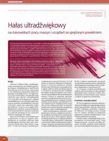 mgr in¿. BO¯ENA SMAGOWSKA Centralny Instytut Ochrony Pracy – Pañstwowy Instytut Badawczy Ha³as ultradźwiêkowy na stanowiskach pracy maszyn i urz¹dzeñ ze sprê¿onym powietrzem W artykule przedstawiono pomiary i ocenê ha³asu ultradźwiêkowego przeprowadzone na stanowiskach obs³ugi: pras wulkanizacyjnych, zrywarki uszczelek, obcinarki uszczelek, suszenia masek sitodruku, czyszczenia p³ytek drukowanych oraz kuwet. Ponadto podano zalecenia ograniczenia ha³asu w pobli¿u źróde³ aerodynamicznych, jakie mog¹ stanowiæ stanowiska pracy maszyn i urz¹dzeñ ze sprê¿onym powietrzem. Wyniki badañ dotycz¹ce nara¿enia na ha³as ultradźwiêkowy pracowników obs³uguj¹cych wymienione stanowiska wykaza³y, ¿e najwiêksze przekroczenia wartości NDN ha³asu ultradźwiêkowego wystêpuj¹ w pasmach tercjowych o czêstotliwościach środkowych 10 kHz, 12,5 kHz i 16 kHz. Wstêp G³ównymi źród³ami ha³asu ultradźwiêkowego w procesie pracy s¹ urz¹dzenia generuj¹ce drgania ultradźwiêkowe o czêstotliwości znamionowej od 16 do 40 kHz, wytwarzane w celu realizacji lub usprawnienia za³o¿onych procesów technologicznych [1-4]. Najliczniejsz¹ grupê źróde³ ha³asu ultradźwiêkowego stanowi¹ myjki (p³uczki) ultradźwiêkowe (2/3 wszystkich technologicznych urz¹dzeñ ultradźwiêkowych), zaś na drugim miejscu plasuj¹ siê zgrzewarki ultradźwiêkowe (tworzyw sztucznych, metali oraz materia³ów trudno zgrzewalnych). Poza tym, do urz¹dzeñ ultradźwiêkowych zaliczamy: dr¹¿arki ultradźwiêkowe, lutownice rêczne i wanny do cynowania oraz jednostki dentystyczne do czyszczenia kamienia nazêbnego, tzw. skalery. Poza wymienionymi technologicznymi urz¹dzeniami, w których drgania ultradźwiêkowe s¹ czynnikiem roboczym, ha³as ultradźwiêkowy powstaje tak¿e jako niezamierzony skutek pracy wielu maszyn i urz¹dzeñ. Z nielicznych danych literaturowych 38 07-08/2011 (opublikowanych ponad 10 lat temu) [2, 5-8] wynika, ¿e obecnośæ sk³adowych ultradźwiêkowych o znacznych poziomach ciśnienia akustycznego stwierdzono w przypadku pracy urz¹dzeñ, podczas której wystêpuj¹ zjawiska o charakterze aerodynamicznym (przep³yw lub wyp³yw sprê¿onych gazów) oraz mechanicznym (du¿e prêdkości obrotowe elementów maszyn). Dotyczy to sprê¿arek, palników, zaworów, narzêdzi pneumatycznych oraz maszyn wysokoobrotowych (strugarek, frezarek, szlifierek, pi³ tarczowych oraz niektórych maszyn w³ókienniczych). Najwiêksza ilośæ energii akustycznej emitowanej przez te maszyny zawiera siê w zakresie wysokich czêstotliwości s³yszalnych i niskich ultradźwiêkowych. Ha³as ultradźwiêkowy emitowany przez wymienione maszyny i urz¹dzenia mo¿e dzia³aæ szkodliwie na narz¹d s³uchu (powodowaæ ubytki s³uchu) [9], a tak¿e wp³ywaæ ujemnie na uk³ad przedsionkowy, co objawia siê bólami i zawrotami g³owy, zaburzeniami równowagi i nudnościami. Badania oddzia³ywañ pozas³uchowych wykaza³y, ¿e ekspozycja zawodowa na ha³as ultradźwiêkowy o poziomach powy¿ej Fot. FFot Fo oott. Sibaudio/Stock Siba i uudi ib udd o/SStock tocck Ultrasonic noise at workstations with machinery and devices with air compression This article presents measurements and assessment of noise at workstations with vulcanization presses, machines used for cutting and tearing off gaskets, screen printing mask dryers and workstations where printed circuit boards and cuvettes are cleaned. It also makes recommendations for noise reduction near aerodynamic sources, such as workstations where machinery and devices with air compression are located. The results of measurements and assessment of occupational exposure to ultrasonic noise at selected workstations have shown that the highest values of MAI (maximum admissible intensities) occur in the 1/3 octave band with the central frequency of 10 kHz, 12 kHz and 16 kHz. 80 dB w zakresie czêstotliwości s³yszalnych i ponad 100 dB w zakresie niskich czêstotliwości ultradźwiêkowych wywo³uje zmiany o charakterze wegetatywno-naczyniowym [2]. W niniejszym artykule przedstawiono wstêpne wyniki prowadzonych obecnie badañ dotycz¹cych oceny nara¿enia na ha³as ultradźwiêkowy na stanowiskach pracy maszyn i urz¹dzeñ ze sprê¿onym powietrzem. Przedmiot i metodyka badañ W ró¿nych ga³êziach przemys³u wiele procesów technologicznych wykorzystuje systemy sprê¿onego powietrza, takie jak czyszczenie, suszenie, ch³odzenie, sortowanie i transport. W zale¿ności od rodzaju procesu stosuje siê m.in. zawory i pistolety ze sprê¿onym powietrzem (z ró¿nymi rodzajami dysz), no¿e i kurtyny powietrzne oraz prasy. Pomiary ha³asu ultradźwiêkowego przeprowadzono na stanowiskach pracy: 3 pras wulkanizacyjnych, zrywarki uszczelek, obcinarki uszczelek, suszenia masek sitodruku oraz czyszczenia p³ytek drukowanych i kuwet. Fot. Stanowisko suszenia masek sitodruku Photo. A workstation for air drying screen printing masks Stosowano na nich ró¿ne typy zaworów pneumatycznych oraz dysze o zmiennej średnicy (w przypadku pras – dysze o średnicach: 6 mm, 5 mm i 1,2 mm, w przypadku obcinarki uszczelek – o średnicy 1 mm, natomiast podczas suszenia masek sitodruku oraz czyszczenia p³ytek drukowanych i kuwet pracownicy stosowali zawory sprê¿onego powietrza o średnicy dyszy – 3 mm (fot.). Pomiary i ocenê ha³asu na tych stanowiskach przeprowadzono zgodnie z wymaganiami zawartymi w rozporz¹dzeniu ministra pracy i polityki spo³ecznej w sprawie najwy¿szych dopuszczalnych stê¿eñ i natê¿eñ czynników szkodliwych dla zdrowia w środowisku pracy [10] oraz wed³ug procedury pomiarowej opublikowanej w [11]. Wyznaczono wielkości charakteryzuj¹ce ha³as ultradźwiêkowy: • równowa¿ne poziomy ciśnienia akustycznego w pasmach tercjowych o czêstotliwościach środkowych f od 10 kHz do 40 kHz, odniesione do 8-godzinnego dnia pracy, Lfeq, 8h, w dB • maksymalne poziomy ciśnienia akustycznego w pasmach tercjowych o czêstotliwościach środko
