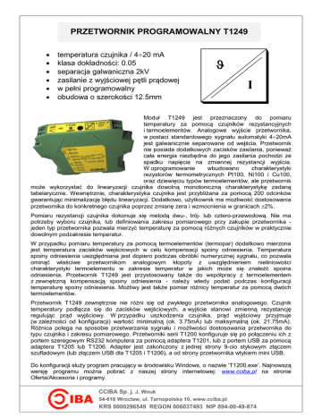 PRZETWORNIK PROGRAMOWALNY T1249 temperatura czujnika / 420 mA klasa dokładności: 0.05 separacja galwaniczna 2kV zasilanie z wyjściowej pętli prądowej w pełni programowalny obudowa o szerokości 12.5mm I Moduł T1249 jest przeznaczony do pomiaru temperatury za pomocą czujników rezystancyjnych i termoelementów. Analogowe wyjście przetwornika, w postaci standardowego sygnału automatyki 420mA jest galwanicznie separowane od wejścia. Przetwornik nie posiada dodatkowych zacisków zasilania, ponieważ cała energia niezbędna do jego zasilania pochodzi ze spadku napięcia na zmiennej rezystancji wyjścia. W oprogramowanie wbudowano charakterystyki rezystorów termometrycznych Pt100, Ni100 i Cu100, oraz dziewięciu typów termoelementów, ale przetwornik może wykorzystać do linearyzacji czujnika dowolną monotoniczną charakterystykę zadaną tabelarycznie. Wewnętrznie, charakterystyka czujnika jest przybliżana za pomocą 200 odcinków gwarantując minimalizację błędu linearyzacji. Dodatkowo, użytkownik ma możliwość dostosowania przetwornika do konkretnego czujnika poprzez zmianę zera i wzmocnienia w granicach 2%. Pomiaru rezystancji czujnika dokonuje się metodą dwu-, trój- lub cztero-przewodową. Nie ma potrzeby wyboru czujnika, lub definiowania zakresu pomiarowego przy zakupie przetwornika jeden typ przetwornika pozwala mierzyć temperaturę za pomocą różnych czujników w praktycznie dowolnym podzakresie temperatur. W przypadku pomiaru temperatury za pomocą termoelementów (termopar) dodatkowo mierzona jest temperatura zacisków wejściowych w celu kompensacji spoiny odniesienia. Temperatura spoiny odniesienia uwzględniana jest dopiero podczas obróbki numerycznej sygnału, co pozwala ominąć właściwe przetwornikom analogowym kłopoty z uwzględnieniem nieliniowości charakterystyki termoelementu w zakresie temperatur w jakich może się znaleźć spoina odniesienia. Przetwornik T1249 jest przystosowany także do współpracy z termoelementem z zewnętrzną kompensacją spoiny odniesienia - należy wtedy podać podczas konfiguracji temperaturę spoiny odniesienia. Możliwy jest także pomiar różnicy temperatur za pomocą dwóch termoelementów. Przetwornik T1249 zewnętrznie nie różni się od zwykłego przetwornika analogowego. Czujnik temperatury podłącza się do zacisków wejściowych, a wyjście stanowi zmienną rezystancję regulując prąd wyjściowy. W przypadku uszkodzenia czujnika, prąd wyjściowy przyjmuje (w zależności od konfiguracji) wartość minimalną (ok. 3.75mA) lub maksymalną (ok. 21.75mA). Różnica polega na sposobie przetwarzania sygnału i możliwości dostosowania przetwornika do typu czujnika i zakresu pomiarowego. Przetworniki serii T1200 konfiguruje się po połączeniu ich z portem szeregowym RS232 komputera za pomocą adaptera T1201, lub z portem USB za pomocą adaptera T1205 lub T1206. Adapter jest zakończony z jednej strony 9-cio stykowym złączem szufladowym (lub złączem USB dla T1205 i T1206), a od strony przetwornika wtykiem mini USB. Do konfiguracji służy program pracujący w środowisku Windows, o nazwie ‘T1200.exe’. Najnowszą wersję programu można pobrać z naszej strony internetowej: www.cciba.pl na stronie Oferta/Akcesoria i programy. CCIBA Sp. j. J. Wnuk 54-616 Wrocław, ul. Tarnopolska 10, www.cciba.pl KRS 0000296549 REGON 006037493 NIP 894-00-49-874 Schemat blokowy 1 5 4 2 P A/C 3 6 T1201, T1205, T1206 Źródło prądu wywołuje spadek napięcia na rezystancji czujnika mierzony przez wzmacniacz różnicowy. Podczas współpracy z termoelementem, źródło prądu służy do pomiaru temperatury spoiny odniesienia. Sygnał napięciowy podłączony do zacisków 2 i 3, po przejściu przez układ zabezpieczeń trafia do filtru dolnoprzepustowego, a następnie jest wzmacniany i przetwarzany do postaci cyfrowej. Oprócz tego mierzony jest prąd pobudzenia, oraz rezystancja przewodów doprowadzających czujnika. Mikroprocesor oblicza aktualną wartość temperatury i obsługuje łącze szeregowe. Wynik obliczeń jest przekazywany poprzez barierę galwaniczną do wyjściowego stopnia regulującego prąd. Wyjściowy układ zabezpieczeń chroni moduł przed przekroczeniem maksymalnego napięcia oraz przed zmianą jego polaryzacji. Prąd wyjściowy jest ograniczony wewnętrznie do 25mA. Część wejściowa przetwornika jest zasilana przez przetwornicę prądu stałego. Parametry toru wejściowego przetwornika są mierzone w procesie kalibracji i zapisane w pamięci nieulotnej. W pamięci nieulotnej zapisywane są również parametry konfiguracji: rodzaj czujnika, sposób pomiaru, parametry filtrów, współczynniki linearyzacji charakterystyki czujnika, zakres pomiarowy, poprawki zera i wzmocnienia, oraz notatki użytkownika i data ostatniej konfiguracji. Przetwarzanie sygnału Sygnał pochodzący z czujnika podlega filtracji. W przetworniku zastosowano kilka filtrów, które w sposób inteligentny oczyszczają sygnał z zakłóceń. Na wstępie, napięcie termoelementu (lub spadek napięcia na termorezystorze) przechodzi przez filtr dolnoprzepustowy eliminujący zakłócenia wysokoczęstościowe. Cyfrowy filtr sieciowy usuwa zakłócenia o częstotliwości sieci energetycznej. Procesor śledzi również szumy pozostałe po wstępnej filtracji odrzucając zakłócenia przypadkowe. Ostateczna filtracja sygnału ma miejsce po wstępnych obliczeniach i jest opisywana jest dwoma parametrami, które może dobrać użytkownik: stałą czasową oraz zakresem filtracji. Ten ostatni parametr jest wyrażany w procentach zakresu pomiarowego i służy do określenia progu zmiany sygnału pomiędzy kolejnymi cyklami pomiarowymi, powyżej którego uśrednianie zaczyna się od nowa. W ten sposób możliwe jest zachowanie długiej stałej czasowej filtru i jednocześnie natychmiastowej reakcji na szybką zmianę sygnału wejściowego. Wartość mierzonego sygnału jest porównywana z wartościami granicznymi w celu weryfikac