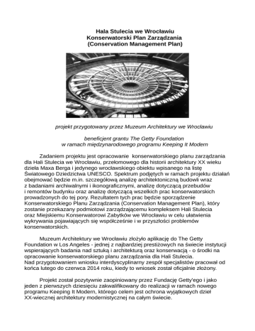 Hala Stulecia we Wrocławiu Konserwatorski Plan Zarządzania (Conservation Management Plan) projekt przygotowany przez Muzeum Architektury we Wrocławiu beneficjent grantu The Getty Foundation w ramach międzynarodowego programu Keeping It Modern Zadaniem projektu jest opracowanie konserwatorskiego planu zarządzania dla Hali Stulecia we Wrocławiu, przełomowego dla historii architektury XX wieku dzieła Maxa Berga i jedynego wrocławskiego obiektu wpisanego na listę Światowego Dziedzictwa UNESCO. Spektrum podjętych w ramach projektu działań obejmować będzie m.in. szczegółową analizę architektoniczną budowli wraz z badaniami archiwalnymi i ikonograficznymi, analizę dotyczącą przebudów i remontów budynku oraz analizę dotyczącą wszelkich prac konserwatorskich prowadzonych do tej pory. Rezultatem tych prac będzie sporządzenie Konserwatorskiego Planu Zarządzania (Conservation Management Plan), który zostanie przekazany podmiotowi zarządzającemu kompleksem Hali Stulecia oraz Miejskiemu Konserwatorowi Zabytków we Wrocławiu w celu ułatwienia wykrywania pojawiających się współcześnie i w przyszłości problemów konserwatorskich. Muzeum Architektury we Wrocławiu złożyło aplikację do The Getty Foundation w Los Angeles - jednej z najbardziej prestiżowych na świecie instytucji wspierających badania nad sztuką i architekturą oraz konserwacją - o środki na opracowanie konserwatorskiego planu zarządzania dla Hali Stulecia. Nad przygotowaniem wniosku interdyscyplinarny zespół specjalistów pracował od końca lutego do czerwca 2014 roku, kiedy to wniosek został oficjalnie złożony. Projekt został pozytywnie zaopiniowany przez Fundację Getty'ego i jako jeden z pierwszych dziesięciu zakwalifikowany do realizacji w ramach nowego programu Keeping It Modern, którego celem jest ochrona wyjątkowych dzieł XX-wiecznej architektury modernistycznej na całym świecie. Należy również podkreślić, że projekt przedłożony przez Muzeum Architektury we Wrocławiu został wybrany przez Fundację w ramach pierwszej edycji zamkniętego konkursu, jeszcze przed ogłoszeniem jego drugiej, otwartej ogólnoświatowej odsłony. Wysokość otrzymanego grantu to 200 000 USD. Informacje o zwycięzcach zostały zamieszczone w "Los Angeles Times" oraz "The New York Times", w wersji drukowanej i elektronicznej. Projekt „Hala Stulecia we Wrocławiu. Konserwatorski Plan Zarządzania (CMP)” realizowany będzie od października 2014 roku do końca lutego 2016 roku. Patronat Honorowy nad programem objął Prezydent Wrocławia Pan Rafał Dutkiewicz. Powołany został kilkuosobowy zespół specjalistów, który pracować będzie pod kierownictwem dr Jerzego Ilkosza, dyrektora Muzeum Architektury we Wrocławiu. W skład zespołu wchodzą: dr Jerzy Ilkosz (analiza architektoniczna Hali Stulecia wraz z badaniami archiwalnymi i ikonograficznymi; kwerendy bibliograficzne); dr Jadwiga Urbanik i Grzegorz Grajewski (analiza dotycząca przebudów i remontów Hali Stulecia oraz prac konserwatorskich wraz z wnioskami konserwatorskimi); prof. Jerzy Jasieńko (analiza strukturalna budynku Hali Stulecia); prof. Hana Cervinkova i Jędrzej Nawara (sporządzenie zasad postępowania i planu działania CMP); Ryszard Wójtowicz (konserwacja dzieł sztuki); Agnieszka Cynowska (administracja projektu) Prace nad realizacją projektu przebiegać będą pod nadzorem ekspertów – doradców: prof. Huberta-Jana Henketa z Rotterdamu i prof. Vladimíra Šlapety z Pragi. Plan pracy 1) ANALIZA ARCHITEKTONICZNA BUDOWLI WRAZ Z BADANIAMI ARCHIWALNYMI I IKONOGRAFICZNYMI. KWERENDY BIBLIOGRAFICZNE 2) ANALIZA DOTYCZĄCA PRZEBUDÓW I REMONTÓW BUDYNKU, PRAC KONSERWATORSKICH, WRAZ Z WNIOSKAMI KONSERWATORSKIMI 3) ANALIZA STRUKTURALNA BUDYNKU 4) SPORZĄDZENIE ZASAD POSTĘPOWANIA I PLANU DZIAŁANIA CMP Kontakt dla mediów: Marta Czyż-Kaczor Muzeum Architektury we Wrocławiu Tel. +48 71 369 99 34, e-mail: [email protected]