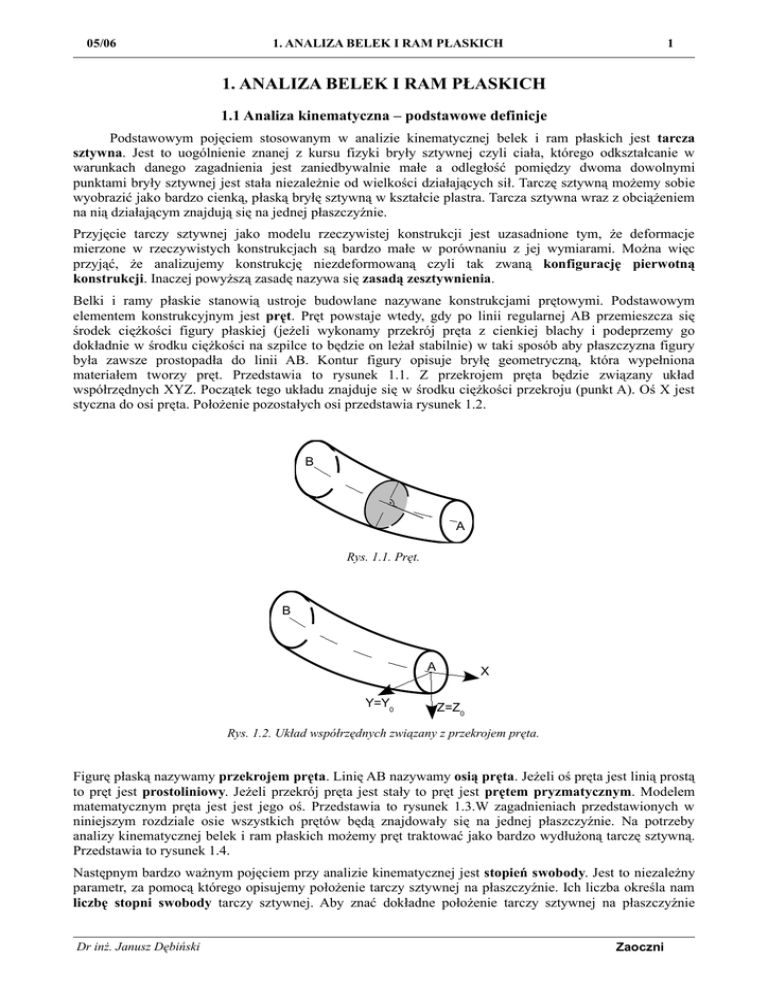 05/06 1. ANALIZA BELEK I RAM PŁASKICH 1 1. ANALIZA BELEK I RAM PŁASKICH 1.1 Analiza kinematyczna – podstawowe definicje Podstawowym pojęciem stosowanym w analizie kinematycznej belek i ram płaskich jest tarcza sztywna. Jest to uogólnienie znanej z kursu fizyki bryły sztywnej czyli ciała, którego odkształcanie w warunkach danego zagadnienia jest zaniedbywalnie małe a odległość pomiędzy dwoma dowolnymi punktami bryły sztywnej jest stała niezależnie od wielkości działających sił. Tarczę sztywną możemy sobie wyobrazić jako bardzo cienką, płaską bryłę sztywną w kształcie plastra. Tarcza sztywna wraz z obciążeniem na nią działającym znajdują się na jednej płaszczyźnie. Przyjęcie tarczy sztywnej jako modelu rzeczywistej konstrukcji jest uzasadnione tym, że deformacje mierzone w rzeczywistych konstrukcjach są bardzo małe w porównaniu z jej wymiarami. Można więc przyjąć, że analizujemy konstrukcję niezdeformowaną czyli tak zwaną konfigurację pierwotną konstrukcji. Inaczej powyższą zasadę nazywa się zasadą zesztywnienia. Belki i ramy płaskie stanowią ustroje budowlane nazywane konstrukcjami prętowymi. Podstawowym elementem konstrukcyjnym jest pręt. Pręt powstaje wtedy, gdy po linii regularnej AB przemieszcza się środek ciężkości figury płaskiej (jeżeli wykonamy przekrój pręta z cienkiej blachy i podeprzemy go dokładnie w środku ciężkości na szpilce to będzie on leżał stabilnie) w taki sposób aby płaszczyzna figury była zawsze prostopadła do linii AB. Kontur figury opisuje bryłę geometryczną, która wypełniona materiałem tworzy pręt. Przedstawia to rysunek 1.1. Z przekrojem pręta będzie związany układ współrzędnych XYZ. Początek tego układu znajduje się w środku ciężkości przekroju (punkt A). Oś X jest styczna do osi pręta. Położenie pozostałych osi przedstawia rysunek 1.2. B A Rys. 1.1. Pręt. B A Y=Y0 X Z=Z0 Rys. 1.2. Układ współrzędnych związany z przekrojem pręta. Figurę płaską nazywamy przekrojem pręta. Linię AB nazywamy osią pręta. Jeżeli oś pręta jest linią prostą to pręt jest prostoliniowy. Jeżeli przekrój pręta jest stały to pręt jest prętem pryzmatycznym. Modelem matematycznym pręta jest jest jego oś. Przedstawia to rysunek 1.3.W zagadnieniach przedstawionych w niniejszym rozdziale osie wszystkich prętów będą znajdowały się na jednej płaszczyźnie. Na potrzeby analizy kinematycznej belek i ram płaskich możemy pręt traktować jako bardzo wydłużoną tarczę sztywną. Przedstawia to rysunek 1.4. Następnym bardzo ważnym pojęciem przy analizie kinematycznej jest stopień swobody. Jest to niezależny parametr, za pomocą którego opisujemy położenie tarczy sztywnej na płaszczyźnie. Ich liczba określa nam liczbę stopni swobody tarczy sztywnej. Aby znać dokładne położenie tarczy sztywnej na płaszczyźnie Dr inż. Janusz Dębiński Zaoczni 05/06 1. ANALIZA BELEK I RAM PŁASKICH 2 wystarczy znać położenie dowolnego odcinka AB. Położenie tego odcinka może być opisane za pomocą dwóch współrzędnych punktu A (xA i yA) i kąta α, który jest kątem nachylenia odcinka AB. Przedstawia to rysunek 1.5. Można więc stwierdzić, że pojedyncza tarcza sztywna posiada na płaszczyźnie trzy stopnie swobody. B A Rzeczywisty obiekt B Model matematyczny A Rys. 1.3. Pręt i jego model matematyczny. Model matematyczny Tarcza sztywna Rys. 1.4. Model matematyczny pręta jako tarcza sztywna. Y B xA A α yA X Rys. 1.5. Niezależne parametry opisujące położenie tarczy sztywnej na płaszczyźnie. 1.2 Więzy Jak wiadomo od konstrukcji budowlanej wymagamy aby nie była ona mechanizmem i pozostała nieruchoma pod wpływem obciążenia. Aby tak było należy odebrać jej wszystkie stopnie swobody. Robi się to przymocowując tarcze sztywne do nieruchomej tarczy podporowej za pomocą więzów. Pierwszym rodzajem więzu jest pręt podporowy. Został on przedstawiony na rysunku 1.6 a i b. Schemat pręta podporowego przedstawia rysunek 1.6 c. Dr inż. Janusz Dębiński Zaoczni 05/06 1. ANALIZA BELEK I RAM PŁASKICH a) b) 3 c) A A A Rys. 1.6. Pręt podporowy. a) widok z przodu, b) widok z boku, c) schemat pręta podporowego. Jak widać na rysunku 1.6 pręt podporowy ma możliwość obrotu względem sworznia (a w zasadzie punktu) A. Tarczę sztywną podpartą prętem podporowym przedstawia rysunek 1.7. Do opisu położenia tarczy sztywnej połączonej z podłożem jednym prętem podporowym potrzebne są dwa niezależne parametry (kąty α oraz β). Czyli tarcza sztywna utraciła jeden stopień swobody. Można więc ostatecznie stwierdzić, że pręt podporowy odbiera tarczy sztywnej jeden stopień swobody (stanowi jeden więz). β A α Rys. 1.7. Tarcza sztywna podparta jednym prętem podporowym. Drugim rodzajem więzu jest przegub. Przedstawia go rysunek 1.8. Tarcza sztywna ma możliwość obrotu względem takiego przegubu. a) b) A c) A A Rys. 1.8. Tarcza sztywna podparta przegubem rzeczywistym. Przegub przedstawiony na rysunku 1.8 nazywa się przegubem rzeczywistym. Do opisu położenia tarczy sztywnej połączonej z podłożem przegubem rzeczywistym potrzebny jest jeden niezależny parametr (kąt nachylenia tarczy sztywnej do poziomu). Czyli tarcza sztywna utraciła dwa stopnie swobody. Można więc ostatecznie stwierdzić, że przegub rzeczywisty odbiera tarczy sztywnej dwa stopnie swobody (stanowi dwa więzy). Przegub może być także utworzony z dwóch prętów podporowych. Mówimy wtedy o przegubie fikcyjnym. Punkt przegubu znajduje się na przecięciu kierunków obu prętów podporowych. Przedstawia to rysunek 1.9. Może się zdarzyć taka sytuacja, że oba pręty podporowe tworzące przegub fikcyjny będą do siebie równoległe. Wtedy przegub fikcyjny znajduje się w nieskończoności i taki przegub nazywa się przegubem niewłaściwym. Tarczę sztywną podpartą dwoma równoległymi prętami podporowymi przedstawia rysunek 1.10 a. Rysunku 1