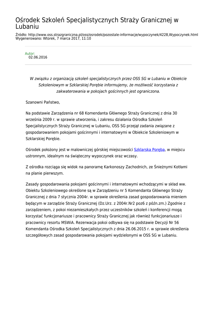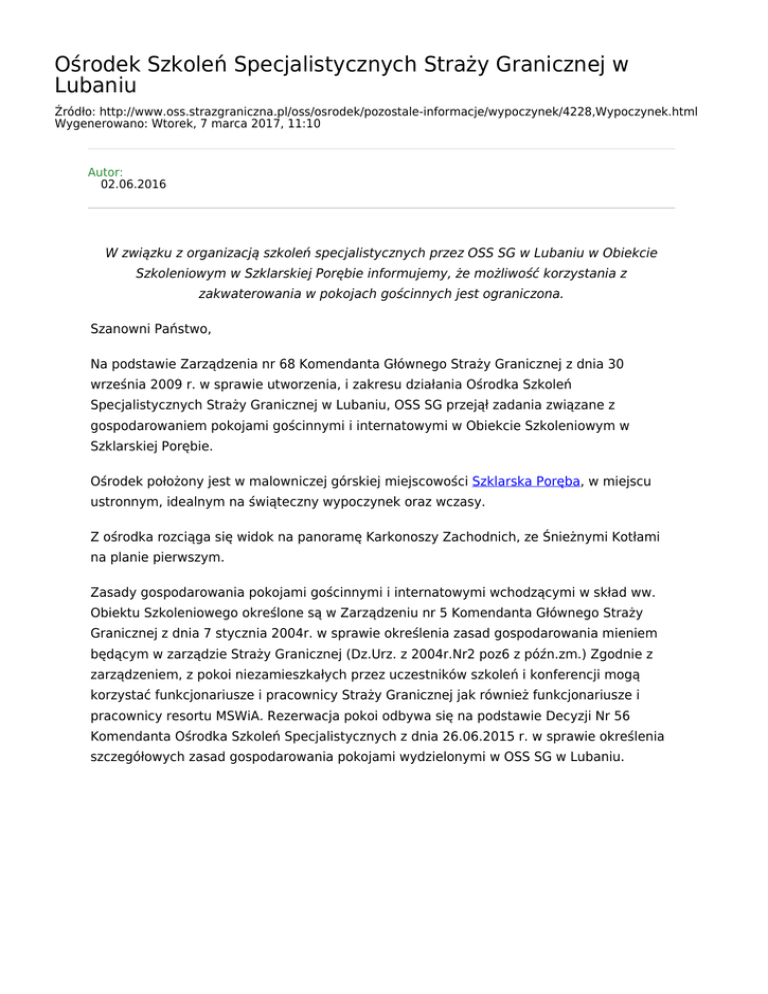 Ośrodek Szkoleń Specjalistycznych Straży Granicznej w Lubaniu Źródło: http://www.oss.strazgraniczna.pl/oss/osrodek/pozostale-informacje/wypoczynek/4228,Wypoczynek.html Wygenerowano: Wtorek, 7 marca 2017, 11:10 Autor: 02.06.2016 W związku z organizacją szkoleń specjalistycznych przez OSS SG w Lubaniu w Obiekcie Szkoleniowym w Szklarskiej Porębie informujemy, że możliwość korzystania z zakwaterowania w pokojach gościnnych jest ograniczona. Szanowni Państwo, Na podstawie Zarządzenia nr 68 Komendanta Głównego Straży Granicznej z dnia 30 września 2009 r. w sprawie utworzenia, i zakresu działania Ośrodka Szkoleń Specjalistycznych Straży Granicznej w Lubaniu, OSS SG przejął zadania związane z gospodarowaniem pokojami gościnnymi i internatowymi w Obiekcie Szkoleniowym w Szklarskiej Porębie. Ośrodek położony jest w malowniczej górskiej miejscowości Szklarska Poręba, w miejscu ustronnym, idealnym na świąteczny wypoczynek oraz wczasy. Z ośrodka rozciąga się widok na panoramę Karkonoszy Zachodnich, ze Śnieżnymi Kotłami na planie pierwszym. Zasady gospodarowania pokojami gościnnymi i internatowymi wchodzącymi w skład ww. Obiektu Szkoleniowego określone są w Zarządzeniu nr 5 Komendanta Głównego Straży Granicznej z dnia 7 stycznia 2004r. w sprawie określenia zasad gospodarowania mieniem będącym w zarządzie Straży Granicznej (Dz.Urz. z 2004r.Nr2 poz6 z późn.zm.) Zgodnie z zarządzeniem, z pokoi niezamieszkałych przez uczestników szkoleń i konferencji mogą korzystać funkcjonariusze i pracownicy Straży Granicznej jak również funkcjonariusze i pracownicy resortu MSWiA. Rezerwacja pokoi odbywa się na podstawie Decyzji Nr 56 Komendanta Ośrodka Szkoleń Specjalistycznych z dnia 26.06.2015 r. w sprawie określenia szczegółowych zasad gospodarowania pokojami wydzielonymi w OSS SG w Lubaniu. Obiekt jest przeznaczony do prowadzenia działalności szkoleniowej Straży Granicznej. Miejsca noclegowe dla osób indywidualnych udostępniane są w okresach wolnych od zamierzonych przedsięwzięć służbowych. Osoby, zainteresowane zakwaterowaniem w Obiekcie winny wystąpić z pisemnym wnioskiem do Komendanta Ośrodka Szkoleń Specjalistycznych w Lubaniu. Obiekt Szkoleniowy w Szklarskiej Porębie posiada ogółem 50 miejsc noclegowych, z tego: ● budynek główny przy ul. Kołłątaja 4 posiada 32 miejsca noclegowe w pokojach 2 i 3 osobowych z węzłami sanitarnymi, stołówka na 50 miejsc, sala konferencyjna na 40 miejsc, wyposażona w sprzęt komputerowy i audiowizualny oraz hala sportowa. ● budynek przy ul. Broniewskiego 2 usytuowany w pobliżu dolnej stacji wyciągu krzesełkowego na Szrenicę posiada 18 miejsc noclegowych w pokojach 1, 2 i 3 osobowych bez węzłów sanitarnych, 2 aneksy kuchenne z możliwością przygotowania sobie posiłków oraz świetlica. Biorąc pod uwagę fakt, że posiadane zasoby lokalowe są wykorzystywane na noclegi osób przebywających w delegacjach służbowych, wskazane jest aby zainteresowani noclegiem z odpowiednim wyprzedzeniem czasowym rezerwowali planowany okres pobytu za pośrednictwem faksu na formularzu, którego wzór zamieszczono poniżej. Informujemy, że prośby przesyłane na formularzach niezgodnych z wzorem wniosku nie będą rozpatrywane. Dla osób przebywających w pokojach gościnnych ośrodka, opłata za pobyt naliczana jest według poniższej tabeli: L.p. Nazwa pomieszczenia Osobodoba - cena brutto (w tym 8% VAT) 1 Pokój 2 i 3-osobowy z łazienką 31 zł 2 Pokój 1, 2 i 3-osobowy bez łazienki 23 zł Opłata za nocleg dzieci do lat 7 wynosi 50% stawki określonej w tabeli. Za pierwszy dzień pobytu i każdy następny, w którym dokonuje się zmiany pościeli, pobiera się dodatkową opłatę w wysokości 9,00 zł brutto. ZAŁĄCZNIKI DO STRONY Prośba o zakwaterowanie w pokojach gościnnych OSS SG (pdf, 54.95 KB) Data publikacji 02.06.2016 11:31
