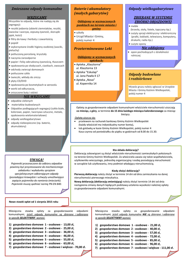 Zmieszane odpady komunalne WRZUCAMY Wszystkie te odpady, które nie nadają się do segregacji: resztki jedzenia (obierki ziemniaków, resztki, owoców i warzyw, zepsutą żywność, skorupki jajek, kości) filtry do kawy i herbaty z zawartością popiół wykorzystane środki higieny osobistej (waciki, pieluchy) potłuczoną porcelanę, kryształy naczynia żaroodporne papier i folię zabrudzoną żywnością, tłuszczem opakowania po słodyczach, ciastkach, owocach odchody zwierząt domowych potłuczone szkło świeczki, wkłady do zniczy płyty CD/DVD opakowania po kosmetykach w aerozolu worki od odkurzacza, zniszczone buty i odzież Baterie i akumulatory (małych gabarytów) Oddajemy w wyznaczonych punktach na terenie miasta i gminy szkoły Urząd Miasta i Gminy, pokój numer 4 Przeterminowane Leki Oddajemy w wyznaczonych aptekach: Apteka „Klasztorna” ul. Klasztorna 13 Apteka "Eskulap" ul. Jana Pawła II 17 Apteka „Nova” ul. Kopernika 14 kolorowe, papier, tworzywa sztuczne, metale, opakowania wielomateriałowe) odpady wielkogabarytowe odpady niebezpieczne (np. baterie, akumulatory) UWAGA! Pojemniki przeznaczone do odbioru odpadów powinny być przystosowane do mechanicznego załadunku i wyładunku sprzętem specjalistycznym odbierającym odpady (posiadające krawędzie i uchwyty umożliwiające zapięcie pojemnika do ramienia śmieciarki). Pojemniki muszą spełniać normę PN-EN 840. ZBIERANE W SYSTEMIE ZBIÓRKI OBJAZDOWEJ meble (krzesła, stoły, fotele, tapczany itp.) zużyty sprzęt elektryczny i elektroniczny (pralki, lodówki, telewizory, komputery, drukarki, radia itp.) zużyte opony Nie oddajemy opon pochodzących z działalności rolniczej Odpady budowlane i rozbiórkowe Wywóz gruzu należy zgłaszać w Urzędzie Miasta i Gminy Koźmin Wielkopolski, pokój numer 4 NIE WRZUCAMY odpadów zielonych materiałów budowlanych Odpadów podlegających segregacji (szkło białe, Odpady wielkogabarytowe Opłatę za gospodarowanie odpadami komunalnymi właściciele nieruchomości uiszczają co miesiąc, z góry, w terminie do 15 dnia każdego miesiąca kalendarzowego za miesiąc bieżący. Opłatę uiszcza się: przelewem na rachunek bankowy Gminy Koźmin Wielkopolski (każdy właściciel ma indywidualny numer konta), lub gotówką w kasie Gminy Koźmin Wielkopolski, pokój numer 4 Kasa czynna od poniedziałku do piątku w godzinach od 8.00 do 15.30. Kto składa deklarację? Deklarację zobowiązani są złożyć właściciele nieruchomości zamieszkałych położonych na terenie Gminy Koźmin Wielkopolski. Za właściciela uważa się także współwłaściciela, użytkownika wieczystego, jednostkę organizacyjną i osobę posiadającą nieruchomość w zarządzie lub użytkowaniu, inny podmiot władający nieruchomością. Kiedy złożyć deklarację? Pierwszą deklarację należy złożyć w terminie 14 dni od dnia zamieszkania na danej nieruchomości pierwszego mieszkańca. Nową deklarację (deklarację zmieniającą) należy złożyć terminie 14 dni od dnia nastąpienia zmiany danych będących podstawą ustalenia wysokości należnej opłaty za gospodarowanie odpadami komunalnymi. Nowe stawki opłat od 1 sierpnia 2015 roku Miesięczna stawka opłaty za gospodarowanie odpadami komunalnymi, jeżeli odpady komunalne są zbierane i odbierane w sposób SELEKTYWNY wynosi: Miesięczna stawka opłaty za gospodarowanie odpadami komunalnymi, jeżeli odpady komunalne NIE są zbierane i odbierane w sposób SELEKTYWNY wynosi: 1) 2) 3) 4) 5) 6) 7) 1) 2) 3) 4) 5) 6) 7) gospodarstwo domowe gospodarstwo domowe gospodarstwo domowe gospodarstwo domowe gospodarstwo domowe gospodarstwo domowe gospodarstwo domowe 1 - osobowe - 13,00 zł, 2 - osobowe - 25,00 zł, 3 - osobowe - 36,00 zł, 4 - osobowe - 46,00 zł, 5 - osobowe - 55,00 zł, 6 - osobowe - 63,00 zł, 7 - osobowe i większe - 70,00 zł. gospodarstwo domowe gospodarstwo domowe gospodarstwo domowe gospodarstwo domowe gospodarstwo domowe gospodarstwo domowe gospodarstwo domowe 1 - osobowe - 21,00 zł, 2 - osobowe - 40,00 zł, 3 - osobowe - 57,00 zł, 4 - osobowe - 72,00 zł, 5 - osobowe - 85,00 zł, 6 - osobowe - 96,00 zł, 7 - osobowe i większe - 111,00 zł.