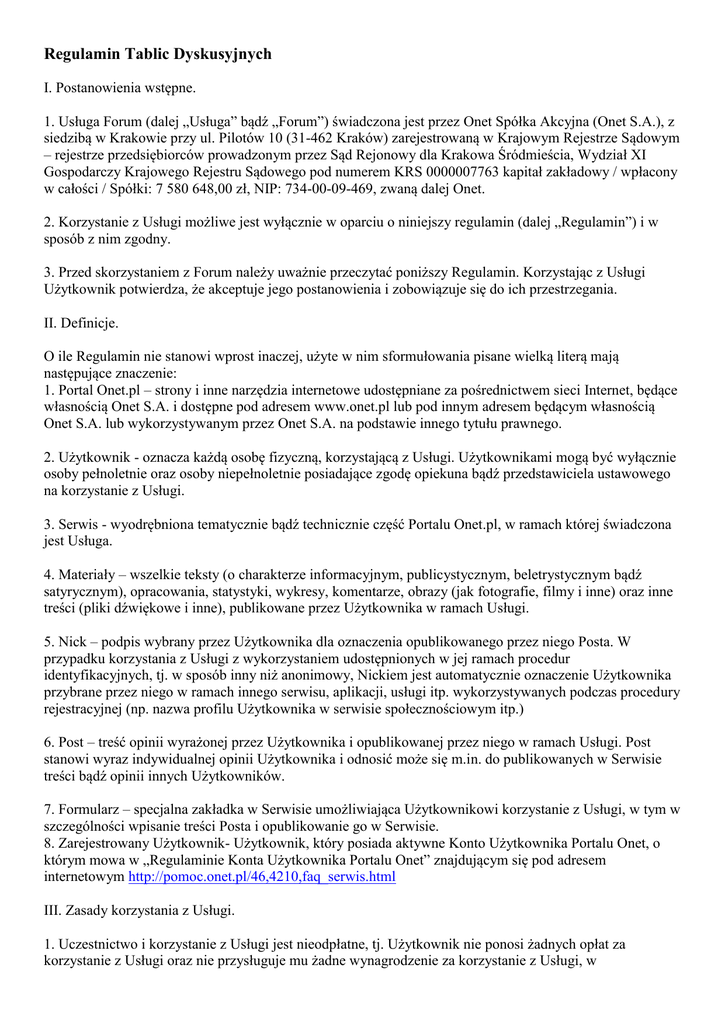 Regulamin Tablic Dyskusyjnych I. Postanowienia wstępne. 1. Usługa Forum (dalej „Usługa” bądź „Forum”) świadczona jest przez Onet Spółka Akcyjna (Onet S.A.), z siedzibą w Krakowie przy ul. Pilotów 10 (31-462 Kraków) zarejestrowaną w Krajowym Rejestrze Sądowym – rejestrze przedsiębiorców prowadzonym przez Sąd Rejonowy dla Krakowa Śródmieścia, Wydział XI Gospodarczy Krajowego Rejestru Sądowego pod numerem KRS 0000007763 kapitał zakładowy / wpłacony w całości / Spółki: 7 580 648,00 zł, NIP: 734-00-09-469, zwaną dalej Onet. 2. Korzystanie z Usługi możliwe jest wyłącznie w oparciu o niniejszy regulamin (dalej „Regulamin”) i w sposób z nim zgodny. 3. Przed skorzystaniem z Forum należy uważnie przeczytać poniższy Regulamin. Korzystając z Usługi Użytkownik potwierdza, że akceptuje jego postanowienia i zobowiązuje się do ich przestrzegania. II. Definicje. O ile Regulamin nie stanowi wprost inaczej, użyte w nim sformułowania pisane wielką literą mają następujące znaczenie: 1. Portal Onet.pl – strony i inne narzędzia internetowe udostępniane za pośrednictwem sieci Internet, będące własnością Onet S.A. i dostępne pod adresem www.onet.pl lub pod innym adresem będącym własnością Onet S.A. lub wykorzystywanym przez Onet S.A. na podstawie innego tytułu prawnego. 2. Użytkownik - oznacza każdą osobę fizyczną, korzystającą z Usługi. Użytkownikami mogą być wyłącznie osoby pełnoletnie oraz osoby niepełnoletnie posiadające zgodę opiekuna bądź przedstawiciela ustawowego na korzystanie z Usługi. 3. Serwis - wyodrębniona tematycznie bądź technicznie część Portalu Onet.pl, w ramach której świadczona jest Usługa. 4. Materiały – wszelkie teksty (o charakterze informacyjnym, publicystycznym, beletrystycznym bądź satyrycznym), opracowania, statystyki, wykresy, komentarze, obrazy (jak fotografie, filmy i inne) oraz inne treści (pliki dźwiękowe i inne), publikowane przez Użytkownika w ramach Usługi. 5. Nick – podpis wybrany przez Użytkownika dla oznaczenia opublikowanego przez niego Posta. W przypadku korzystania z Usługi z wykorzystaniem udostępnionych w jej ramach procedur identyfikacyjnych, tj. w sposób inny niż anonimowy, Nickiem jest automatycznie oznaczenie Użytkownika przybrane przez niego w ramach innego serwisu, aplikacji, usługi itp. wykorzystywanych podczas procedury rejestracyjnej (np. nazwa profilu Użytkownika w serwisie społecznościowym itp.) 6. Post – treść opinii wyrażonej przez Użytkownika i opublikowanej przez niego w ramach Usługi. Post stanowi wyraz indywidualnej opinii Użytkownika i odnosić może się m.in. do publikowanych w Serwisie treści bądź opinii innych Użytkowników. 7. Formularz – specjalna zakładka w Serwisie umożliwiająca Użytkownikowi korzystanie z Usługi, w tym w szczególności wpisanie treści Posta i opublikowanie go w Serwisie. 8. Zarejestrowany Użytkownik- Użytkownik, który posiada aktywne Konto Użytkownika Portalu Onet, o którym mowa w „Regulaminie Konta Użytkownika Portalu Onet” znajdującym się pod adresem internetowym http://pomoc.onet.pl/46,4210,faq_serwis.html III. Zasady korzystania z Usługi. 1. Uczestnictwo i korzystanie z Usługi jest nieodpłatne, tj. Użytkownik nie ponosi żadnych opłat za korzystanie z Usługi oraz nie przysługuje mu żadne wynagrodzenie za korzystanie z Usługi, w szczególności za publikowane w jej ramach Materiały i ewentualne późniejsze ich wykorzystanie przez Onet. Powyższy zapis nie uchybia obowiązkowi ponoszenia przez Użytkowników opłat za dostęp do sieci Internet, zgodnie z zawartymi przez Użytkowników umowami z podmiotami trzecimi zapewniającymi taki dostęp. 2. W ramach Usługi Użytkownik ma możliwość wyrażenia opinii dotyczących treści publikowanych w Serwisie, opinii innych Użytkowników oraz na inne tematy, o ile nie są one niezgodne z Regulaminem. Ilość znaków jaką zawierać może poszczególny Post może być ograniczana przez Onet, o czym Onet poinformuje Użytkowników na stronie internetowej Serwisu z odpowiednim, nie krótszym niż 3 dni, wyprzedzeniem. 3. W ramach Usługi Onet może również dopuścić zamieszczanie przez Użytkownika w Serwisie Materiałów innych niż opinie wyrażone w treści Postów. 4. Usługa umożliwia Użytkownikom publikowanie i przechowywanie Postów w zasobach informatycznych Serwisu przeznaczonych do zamieszczania Postów przez Użytkowników. 5. Posty zamieszczane są w ramach Usługi przy wykorzystaniu Formularza. Zamieszczając Posta przy wykorzystaniu Formularza Użytkownik może wybrać sposób podpisania Posta przy użyciu Nicka lub też zamieścić go w sposób anonimowy, tj. bez podpisu 6. Użytkownik akceptuje fakt, iż opublikowane przez niego w ramach Usługi Posty bądź Materiały wraz z Nickiem Użytkownika będą publicznie dostępne dla osób korzystających z Serwisu oraz, że mogą zostać przez innych Użytkowników skomentowane bądź ocenione. Użytkownik akceptuje również fakt, iż opublikowane przez niego Posty bądź Materiały mogą być klasyfikowane przez Onet według tematów, ocen uzyskanych według opinii innych osób korzystających z Serwisu i według innych obiektywnych kryteriów. 7. Posty i Materiały są publikowane i przechowywane w Serwisie w ramach Usługi w imieniu własnym Użytkownika, na jego rzecz i na jego odpowiedzialność. Onet, na zasadach określonych w obowiązujących przepisach, nie ponosi odpowiedzialności za treść Postów/Materiałów Użytkowników opublikowanych i przechowywanych w Serwisie. 8. Udostępnienie przez Onet Formularza umożliwiającego korzystanie z Usługi obejmuje wyłącznie udostępnienie stosownych rozwiązań technicznych. Stosownie do powyższego Onet nie ingeruje w treść Posta/Materiału podczas procedury jego publikacji realizowanej przez Użytkownika. 9. Publikując w Serwisie w ramach Usługi Post lub Materiał Użytkownik: a
