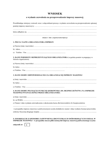 WNIOSEK o wydanie zezwolenia na przeprowadzenie imprezy masowej. Przedkładając niniejszy wniosek wraz z załącznikami proszę o wydanie zezwolenia na przeprowadzenie opisanej poniżej imprezy masowej tj.: ……………………………...……………………………………….……………….. …………………………………………………………………………………….………………………………… która odbędzie się ……………………………………………..............................………………………………… …………………………………………………………………………………….………………………………… (miejsce i data zorganizowania imprezy) 1. PEŁNA NAZWA ORGANIZATORA IMPREZY a) Nazwa (imię i nazwisko) …………………………….………………………..………………………………… b) Adres………………………………………………………......…...……….………………… c) Telefon / Fax .................................................................................... 2. DANE PODMIOTU REPREZENTUJĄCEGO ORGANIZATORA (wypełnia pomiot występujący w imieniu organizatora) a) Nazwa (imię i nazwisko) ……………………………………….………………………………… b) Adres ………………………………………………………………….………………………………… c) Telefon / Fax .................................................................................... 3. DANE OSOBY ODPOWIEDZIALNEJ ZA ORGANIZACJĘ IMPREZY MASOWEJ a) Imię i nazwisko ……………………………………………………………................................. b) Adres ............…………………………………………………………………………………… c) Telefon / Fax .................................................................................... 4. DANE OSOBY PEŁNIĄCEJ FUNKCJĘ KIEROWNIKA DS. BEZPIECZEŃSTWA NA IMPREZIE MASOWEJ WYZNACZONEJ PRZEZ ORGANIZATORA a) Imię i nazwisko ..……………………………..……………….………………………………… b) nr PESEL ................................................................................ c) Numer i data wydania zaświadczenia o ukończeniu kursu dla kierowników d/s bezpieczeństwa ............................................................................................................................................. .................. w przypadku imprezy masowej o podwyższonym ryzyku dodatkowo numer i datę wydania licencji pracownika ochrony fizycznej drugiego stopnia .................................................................................................... ....................... 5. INFORMACJE O SPOSOBIE ZAPEWNIENIA IDENTYFIKACJI OSÓB BIORĄCYCH UDZIAŁ W IMPREZIE MASOWEJ - w przypadku meczu piłki nożnej lub imprezy masowej podwyższonego ryzyka załącznik nr 1 6. INFORMACJE O OBIEKCIE NA KTÓRYM ORGANIZOWANA JEST IMPREZA a) Obiekt (zamknięty), teren (zamknięty, otwarty, otwarty wydzielony, ogrodzony) …………………………………………………………………………………….………………………………… b) Właściciel obiektu lub terenu …………………………………………………………………………………… c) Adres ………………………………………………….…………………........……………… d) Telefon / Fax .................................................................................... f) Regulamin obiektu wraz z informacją o sposobie udostępniania go uczestnikom imprezy masowej załącznik nr 2 g) Informacja o zainstalowanych urządzeniach rejestrujących obraz i dźwięk (zgodnie z art. 12 o bezp. imprez masowych) ……………………………………………………………………….………………………………… h) Informacja o liczbie miejsc dla osób w obiekcie lub na terenie na którym ma odbyć się impreza, udostępnionych przez organizatora ustaloną na podstawie przepisów prawa budowlanego i przepisów dot. ochrony przeciwpożarowej: …………………………………………………………………………………….………………………………… i) Przewidywana liczba osób, które mogą być obecne na imprezie masowej: ……………………………………………………………………………...............………………………………. j) Informacja o przewidywanych zagrożeniach bezpieczeństwa i porządku publicznego: .................................................................................................................................................................................... …………………………………………………………………………………….………………………………… …………………………………………………………………………………….………………………………… …………………………………………………………………………………….………………………………… …………………………………………………………………………………….………………………………… …………………………………………………………………………………….………………………………… …………………………………………………………………………………….………………………………… …………………………………………………………………………………….………………………………… k) Graficzny plan obiektu lub terenu na którym ma być przeprowadzona impreza masowa wraz z jego opisem, zawierający : oznaczenie : - dróg dojścia i rozcho