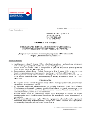 ……………………………….. Pieczęć Wnioskodawcy Katowice, dnia …................................... POWIATOWY URZĄD PRACY W KATOWICACH UL. POŚPIECHA 14 40-852 KATOWICE WNIOSEK Wn-W część I O PRZYZNANIE REFUNDACJI KOSZTÓW WYPOSAŻENIA STANOWISKA PRACY OSOBY NIEPEŁNOSPRAWNEJ „Program wyrównywania różnic między regionami III” w obszarze G Projekt „Zatrudnienie bez przeszkód” Podstawa prawna: Art. 26e ustawy z dnia 27 sierpnia 1997r. o rehabilitacji zawodowej i społecznej oraz zatrudnianiu osób niepełnosprawnych (Dz.U. z 2011r., Nr 127, poz. 721 z późn. zm.); 2. Ustawa z dnia 30 kwietnia 2004r. o postępowaniu w sprawach dotyczących pomocy publicznej (Dz.U. z 2007r. Nr 59, poz. 404 z późn. zm.); 3. Rozporządzenie Ministra Pracy i Polityki Społecznej z dnia 11 marca 2011r. w sprawie zwrotu kosztów wyposażenia stanowiska pracy osoby niepełnosprawnej (Dz.U. z 2015r., poz. 93); 4. Rozporządzenie Komisji (UE) nr 1407/2013 z dnia 18 grudnia 2013r. w sprawie stosowania art. 107 i 108 Traktatu o funkcjonowaniu Unii Europejskiej do pomocy de minimis (Dz.Urz. UE L 352 z 24.12.2013). INFORMACJA: 1. Na wszystkie zawarte we wniosku pytania należy udzielić precyzyjnej odpowiedzi, ponieważ będą one podstawą do rozpatrzenia wniosku. 2. W przypadku stwierdzenia nieprawidłowości we wniosku Powiatowy Urząd Pracy informuje Wnioskodawcę o nieprawidłowościach w terminie 14 dni od dnia otrzymania wniosku oraz wzywa do ich usunięcia w terminie 14 dni od dnia doręczenia wezwania. Wniosek nieuzupełniony we wskazanym terminie pozostawia się bez rozpatrzenia. 3. Wniosek należy złożyć do powiatowego urzędu pracy właściwego ze względu na miejsce zarejestrowania osoby niepełnosprawnej bezrobotnej lub poszukującej pracy niepozostającej w zatrudnieniu. 4. Wniosek stanowi kontynuację części I Wniosku o przyznanie refundacji kosztów wyposażenia stanowiska pracy osoby niepełnosprawnej, którego treść określa Załącznik do Rozporządzenia Ministra Pracy i Polityki Społecznej z dnia 11 marca 2011r. 1. …......................................................... podpis Wnioskodawcy SPIS DOKUMENTÓW DO WNIOSKU Kserokopie dokumentów wymagają potwierdzenia za zgodność z oryginałem przez osobę lub osoby uprawnione do reprezentowania Wnioskodawcy Kserokopia aktualnego dokumentu poświadczającego formę prawną Wnioskodawcy (nie dotyczy osób fizycznych prowadzących działalność gospodarczą). W przypadku spółki cywilnej do wniosku należy dołączyć umowę spółki. 2. Pełnomocnictwo do reprezentowania Wnioskodawcy (jeśli dotyczy). 3. Zaświadczenie z Zakładu Ubezpieczeń Społecznych o nie zaleganiu z opłacaniem składek na ubezpieczenia społeczne (aktualne 3 miesiące). 4. Zaświadczenie z Urzędu Skarbowego o nie zaleganiu z opłatami z tytułu zobowiązań podatkowych (aktualne 3 miesiące). 5. Dokument potwierdzający, że Wnioskodawca jest podatnikiem VAT (jeśli dotyczy). 6. Oświadczenie Wnioskodawcy (Załącznik nr 1 do wniosku). 7. Bilans oraz rachunek zysków i strat za ostatnie dwa lata obrotowe – w przypadku podmiotów składających bilans, w pozostałych przypadkach – roczne rozliczenia podatkowe za ostatnie dwa lata wraz z dowodem przyjęcia przez Urząd Skarbowy lub poświadczone przez audytora albo z dowodem nadania do Urzędu Skarbowego. 8. Bilans oraz rachunek zysków i strat za bieżący rok obrotowy – w przypadku podmiotów składających bilans. 9. Aktualne zaświadczenie z banku o posiadanych środkach finansowych, obrotach na rachunku za ostatni rok, ewentualnym zadłużeniu i prawnej formie zabezpieczenia oraz lokatach terminowych. 10. Krajowa oferta pracy. 11. W przypadku, gdy miejsce położenia stanowiska pracy (adres wskazany w cz. I, pkt E1, ppkt 74 wniosku Wn-W) nie wynika z dokumentów rejestrowych Wnioskodawcy, wymagany jest dokument (np. umowa najmu, dzierżawy, inne) potwierdzający prawo do dysponowania lokalem wskazanym jako miejsce położenia stanowiska pracy. 1. 12. Pracodawca, który podlega przepisom o pomocy publicznej, tj. prowadzący działalność gospodarczą, bez względu na formę organizacyjno – prawną oraz sposób finansowania, składa do wniosku: a) Oświadczenie Wnioskodawcy dotyczące pomocy publicznej (Załącznik nr 2 do wniosku). b) Zaświadczenia o pomocy de minimis jakie Wnioskodawca otrzymał w roku, w którym ubiega się o pomoc oraz w ciągu 2 poprzedzających go lat. c) Formularz informacji przedstawianych przy ubieganiu się o pomoc de minimis (Załącznik nr 1 do Rozporządzenia Rady Ministrów z dnia 24 października 2014r., poz. 1543). 13. Wnioskodawca, który spełnia warunki ujęte w definicji „jednego przedsiębiorstwa” w rozumieniu art. 2 ust. 2 Rozporządzenia Komisji (UE) nr 1407/2013 z dnia 18 grudnia 2013r. w sprawie stosowania art. 107 i 108 Traktatu o funkcjonowaniu Unii Europejskiej do pomocy de minimis (Dz.Urz. UE L 352 z dnia 24.12.2013), składa do wniosku zaświadczenia o pomocy de minimis wszystkich powiązanych jednostek gospodarczych (dotyczy zaświadczeń o pomocy de minimis otrzymanych w bieżącym roku podatkowym oraz w ciągu 2 poprzedzających go lat). Do celów niniejszego Rozporządzenia „jedno przedsiębiorstwo” obejmuje wszystkie jednostki gospodarcze, które są ze sobą powiązane co najmniej jednym z następujących stosunków: a) jedna jednostka gospodarcza posiada w drugiej jednostce gospodarczej większość praw głosu akcjonariuszy, wspólników lub członków; b) jedna jednostka gospodarcza ma prawo wyznaczyć lub odwołać większość członków organu administracyjnego, zarządzającego lub nadzorczego innej jednostki gospodarczej; c) jedna jednostka gospodarcza ma prawo wywierać dominujący wpływ na inną jednostkę gospodarczą zgodnie z umową zawartą z tą jednostką lub postanowieniami w jej akcie założycielskim lub umowie spółki; d) jedna jednostka gospodarcza, która jest akcjonariuszem lub wsp