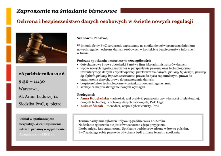 Zaproszenie na śniadanie biznesowe Ochrona i bezpieczeństwo danych osobowych w świetle nowych regulacji Szanowni Państwo, W imieniu firmy PwC serdecznie zapraszamy na spotkanie poświęcone zagadnieniom nowych regulacji ochrony danych osobowych w kontekście bezpieczeństwa informacji w firmie. 26 października 2016 9:30 – 11:30 Warszawa, Al. Armii Ludowej 14 Siedziba PwC, 9. piętro Udział w spotkaniu jest bezpłatny. W celu zgłoszenia udziału prosimy o wypełnienie formularza <<LINK>>. Podczas spotkania omówimy w szczególności: • dotychczasowe i nowe obowiązki Państwa firm jako administratorów danych; • wpływ nowych regulacji na biznes w perspektywie prawnej oraz technologicznej: inwentaryzacja danych i rejestr operacji przetwarzania danych, privacy by design, privacy by default, privacy impact assessment, prawo do bycia zapomnianym, prawo do ograniczenia danych, prawo do przenoszenia danych; • bezpieczeństwo technologiczne w związku z nowymi regulacjami; • sankcje za nieprzestrzeganie nowych wymagań. Prelegenci: Anna Kobylańska – adwokat, szef praktyki prawa ochrony własności intelektualnej, nowych technologii i ochrony danych osobowych, PwC Legal Łukasz Ślęzak – menedżer, zespół CyberSecurity, PwC Termin nadsyłania zgłoszeń upływa 19 października 2016 roku. Nadesłanie zgłoszenia nie jest równoznaczne z jego przyjęciem. Liczba miejsc jest ograniczona. Spotkanie będzie prowadzone w języku polskim. PwC zastrzega sobie prawo do odwołania bądź zmiany terminu spotkania.