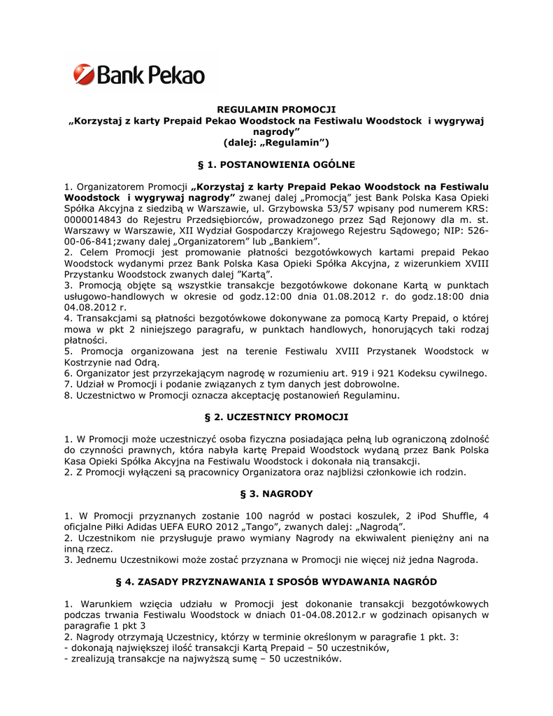 REGULAMIN PROMOCJI „Korzystaj z karty Prepaid Pekao Woodstock na Festiwalu Woodstock i wygrywaj nagrody” (dalej: „Regulamin”) § 1. POSTANOWIENIA OGÓLNE 1. Organizatorem Promocji „Korzystaj z karty Prepaid Pekao Woodstock na Festiwalu Woodstock i wygrywaj nagrody” zwanej dalej „Promocją” jest Bank Polska Kasa Opieki Spółka Akcyjna z siedzibą w Warszawie, ul. Grzybowska 53/57 wpisany pod numerem KRS: 0000014843 do Rejestru Przedsiębiorców, prowadzonego przez Sąd Rejonowy dla m. st. Warszawy w Warszawie, XII Wydział Gospodarczy Krajowego Rejestru Sądowego; NIP: 52600-06-841;zwany dalej „Organizatorem” lub „Bankiem”. 2. Celem Promocji jest promowanie płatności bezgotówkowych kartami prepaid Pekao Woodstock wydanymi przez Bank Polska Kasa Opieki Spółka Akcyjna, z wizerunkiem XVIII Przystanku Woodstock zwanych dalej ”Kartą”. 3. Promocją objęte są wszystkie transakcje bezgotówkowe dokonane Kartą w punktach usługowo-handlowych w okresie od godz.12:00 dnia 01.08.2012 r. do godz.18:00 dnia 04.08.2012 r. 4. Transakcjami są płatności bezgotówkowe dokonywane za pomocą Karty Prepaid, o której mowa w pkt 2 niniejszego paragrafu, w punktach handlowych, honorujących taki rodzaj płatności. 5. Promocja organizowana jest na terenie Festiwalu XVIII Przystanek Woodstock w Kostrzynie nad Odrą. 6. Organizator jest przyrzekającym nagrodę w rozumieniu art. 919 i 921 Kodeksu cywilnego. 7. Udział w Promocji i podanie związanych z tym danych jest dobrowolne. 8. Uczestnictwo w Promocji oznacza akceptację postanowień Regulaminu. § 2. UCZESTNICY PROMOCJI 1. W Promocji moŜe uczestniczyć osoba fizyczna posiadająca pełną lub ograniczoną zdolność do czynności prawnych, która nabyła kartę Prepaid Woodstock wydaną przez Bank Polska Kasa Opieki Spółka Akcyjna na Festiwalu Woodstock i dokonała nią transakcji. 2. Z Promocji wyłączeni są pracownicy Organizatora oraz najbliŜsi członkowie ich rodzin. § 3. NAGRODY 1. W Promocji przyznanych zostanie 100 nagród w postaci koszulek, 2 iPod Shuffle, 4 oficjalne Piłki Adidas UEFA EURO 2012 „Tango”, zwanych dalej: „Nagrodą”. 2. Uczestnikom nie przysługuje prawo wymiany Nagrody na ekwiwalent pienięŜny ani na inną rzecz. 3. Jednemu Uczestnikowi moŜe zostać przyznana w Promocji nie więcej niŜ jedna Nagroda. § 4. ZASADY PRZYZNAWANIA I SPOSÓB WYDAWANIA NAGRÓD 1. Warunkiem wzięcia udziału w Promocji jest dokonanie transakcji bezgotówkowych podczas trwania Festiwalu Woodstock w dniach 01-04.08.2012.r w godzinach opisanych w paragrafie 1 pkt 3 2. Nagrody otrzymają Uczestnicy, którzy w terminie określonym w paragrafie 1 pkt. 3: - dokonają największej ilość transakcji Kartą Prepaid – 50 uczestników, - zrealizują transakcje na najwyŜszą sumę – 50 uczestników. 3. Ogłoszenie laureatów nastąpi, poprzez podanie 8 ostatnich cyfr numeru rachunku karty Prepaid: - przed koncertem Elektrycznych Gitar (godz. 18:50)w sobotę tj 04.08.2012 przez pracownika Banku w zakresie pierwszego laureata z kaŜdej kategorii, - pełna lista laureatów dostępna będzie na stanowiskach Banku oraz na stronach internetowych www.pekao.com.pl/woodstock oraz www.wosp.org.pl . 4. Laureaci z kaŜdej z kategorii otrzymują: - za zajęcie 1 miejsca – iPod Shuffle i koszulkę, - za zajęcie 2 i 3 miejsca – piłkę Adidas i koszulkę, - pozostałe miejsca – koszulka, 5. Wydawanie Nagród odbywać się będzie na stanowisku Banku Pekao SA umiejscowionym na terenie Festiwalu w dniu 04.08.2012r, bezpośrednio po stwierdzeniu przez osobę działającą w imieniu Banku, iŜ Uczestnik spełnił warunek wzięcia udziału w Promocji lub wysłane pocztą na adres podany telefonicznie pod numerem infolinii: - dla osób dzwoniących z telefonów stacjonarnych 801 365 365 lub - dla osób dzwoniących z telefonów komórkowych lub z zagranicy (42) 68 38 232. 6. Warunkiem wydania Nagrody jest uprzednie okazanie osobie działającej w imieniu Banku karty Prepaid, której numer rachunku został wytypowany do nagrody oraz poprawnie wypełnionego (tj. zawierającego wszelkie wymagane przez Organizatora informacje, w tym w szczególności zgodę na przetwarzanie danych osobowych) protokołu odbioru Nagrody (załącznik numer 1 do niniejszego Regulaminu), którego formularz dostępny będzie u przedstawicieli Banku. 7. W przypadku odbioru nagrody pocztą, na podany telefonicznie adres korespondencyjny, Laureat powinien Podać Numer Rachunku Karty oraz niezbędne dane do wysyłki: imię, nazwisko, ulice, kod i miasto oraz telefon kontaktowy (załącznik nr 2 do niniejszego Regulaminu). Nagrody zostaną wysłane po weryfikacji Numeru Rachunku Karty na liście Laureatów, w okresie do 14 dni od momentu otrzymania zgłoszenia. 5. W przypadku zaistnienia sytuacji, iŜ więcej niŜ 50 osób będzie posiadało taką samą ilość dokonanych transakcji, o przyznaniu nagrody decydować będzie jak najwyŜsza łączna wartość dokonanych transakcji. 6. W przypadku zaistnienia sytuacji, iŜ więcej niŜ 50 osób będzie posiadało taką samą sumę dokonanych transakcji, o przyznaniu nagrody decydować będzie jak największa ilość dokonanych transakcji. 7. Prawidłowy przebieg konkursu będzie nadzorować powołana przez Organizatora komisja złoŜona z trzech przedstawicieli Organizatora z Regionu Dolnośląskiego (dalej „Komisja”). Decyzje Komisji są wiąŜące dla Uczestników. § 5. POSTĘPOWANIE REKLAMACYJNE 1. Reklamacje dotyczące Promocji mogą być zgłaszane pisemnie na adres siedziby Organizatora w ciągu 14 dni od daty zakończenia promocji. O zachowaniu terminu składania reklamacji decyduje data stempla pocztowego. 2. Prawo złoŜenia reklamacji przysługuje jedynie Uczestnikom Promocji. 3. Pisemna reklamacja powinna zawierać imię, nazwisko i dokładny adres Uczestnika oraz dokładny opis i uzasadnienie reklamacji, oraz zostać przesłana listem poleconym na adres Organizatora: Bank Pekao SA Departame