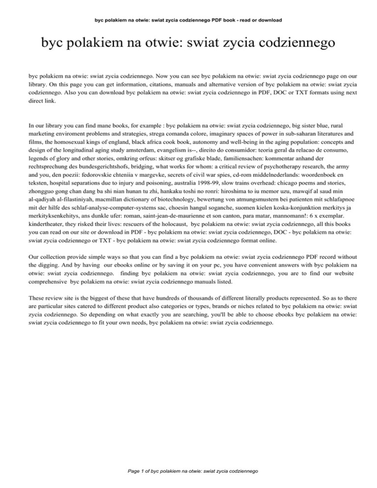 byc polakiem na otwie: swiat zycia codziennego PDF book - read or download byc polakiem na otwie: swiat zycia codziennego byc polakiem na otwie: swiat zycia codziennego. Now you can see byc polakiem na otwie: swiat zycia codziennego page on our library. On this page you can get information, citations, manuals and alternative version of byc polakiem na otwie: swiat zycia codziennego. Also you can download byc polakiem na otwie: swiat zycia codziennego in PDF, DOC or TXT formats using next direct link. In our library you can find mane books, for example : byc polakiem na otwie: swiat zycia codziennego, big sister blue, rural marketing enviroment problems and strategies, strega comanda colore, imaginary spaces of power in sub-saharan literatures and films, the homosexual kings of england, black africa cook book, autonomy and well-being in the aging population: concepts and design of the longitudinal aging study amsterdam, evangelism is--, direito do consumidor: teoria geral da relacao de consumo, legends of glory and other stories, omkring orfeus: skitser og grafiske blade, familiensachen: kommentar anhand der rechtsprechung des bundesgerichtshofs, bridging, what works for whom: a critical review of psychotherapy research, the army and you, den poezii: fedorovskie chteniia v margevke, secrets of civil war spies, cd-rom middelnederlands: woordenboek en teksten, hospital separations due to injury and poisoning, australia 1998-99, slow trains overhead: chicago poems and stories, zhongguo gong chan dang ba shi nian hunan tu zhi, hankaku toshi no ronri: hiroshima to iu memor uzu, mawqif al saud min al-qadiyah al-filastiniyah, macmillan dictionary of biotechnology, bewertung von atmungsmustern bei patienten mit schlafapnoe mit der hilfe des schlaf-analyse-computer-systems sac, choesin hangul soganche, suomen kielen koska-konjunktion merkitys ja merkityksenkehitys, ans dunkle ufer: roman, saint-jean-de-maurienne et son canton, para matar, mannomann!: 6 x exemplar. kindertheater, they risked their lives: rescuers of the holocaust, byc polakiem na otwie: swiat zycia codziennego, all this books you can read on our site or download in PDF - byc polakiem na otwie: swiat zycia codziennego, DOC - byc polakiem na otwie: swiat zycia codziennego or TXT - byc polakiem na otwie: swiat zycia codziennego format online. Our collection provide simple ways so that you can find a byc polakiem na otwie: swiat zycia codziennego PDF record without the digging. And by having our ebooks online or by saving it on your pc, you have convenient answers with byc polakiem na otwie: swiat zycia codziennego. finding byc polakiem na otwie: swiat zycia codziennego, you are to find our website comprehensive byc polakiem na otwie: swiat zycia codziennego manuals listed. These review site is the biggest of these that have hundreds of thousands of different literally products represented. So as to there are particular sites catered to different product also categories or types, brands or niches related to byc polakiem na otwie: swiat zycia codziennego. So depending on what exactly you are searching, you'll be able to choose ebooks byc polakiem na otwie: swiat zycia codziennego to fit your own needs, byc polakiem na otwie: swiat zycia codziennego. Page 1 of byc polakiem na otwie: swiat zycia codziennego