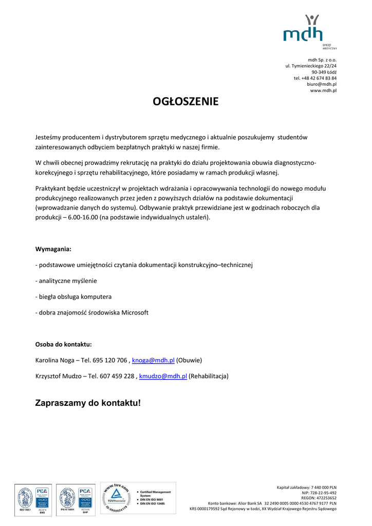mdh Sp. z o.o. ul. Tymienieckiego 22/24 90-349 Łódź tel. +48 42 674 83 84 [email protected] www.mdh.pl OGŁOSZENIE Jesteśmy producentem i dystrybutorem sprzętu medycznego i aktualnie poszukujemy studentów zainteresowanych odbyciem bezpłatnych praktyki w naszej firmie. W chwili obecnej prowadzimy rekrutację na praktyki do działu projektowania obuwia diagnostycznokorekcyjnego i sprzętu rehabilitacyjnego, które posiadamy w ramach produkcji własnej. Praktykant będzie uczestniczył w projektach wdrażania i opracowywania technologii do nowego modułu produkcyjnego realizowanych przez jeden z powyższych działów na podstawie dokumentacji (wprowadzanie danych do systemu). Odbywanie praktyk przewidziane jest w godzinach roboczych dla produkcji – 6.00-16.00 (na podstawie indywidualnych ustaleń). Wymagania: - podstawowe umiejętności czytania dokumentacji konstrukcyjno–technicznej - analityczne myślenie - biegła obsługa komputera - dobra znajomość środowiska Microsoft Osoba do kontaktu: Karolina Noga – Tel. 695 120 706 , [email protected] (Obuwie) Krzysztof Mudzo – Tel. 607 459 228 , [email protected] (Rehabilitacja) Zapraszamy do kontaktu! Kapitał zakładowy: 7 440 000 PLN NIP: 728-22-95-492 REGON: 472253652 Konto bankowe: Alior Bank SA 32 2490 0005 0000 4530 4767 9177 PLN KRS 0000179592 Sąd Rejonowy w Łodzi, XX Wydział Krajowego Rejestru Sądowego