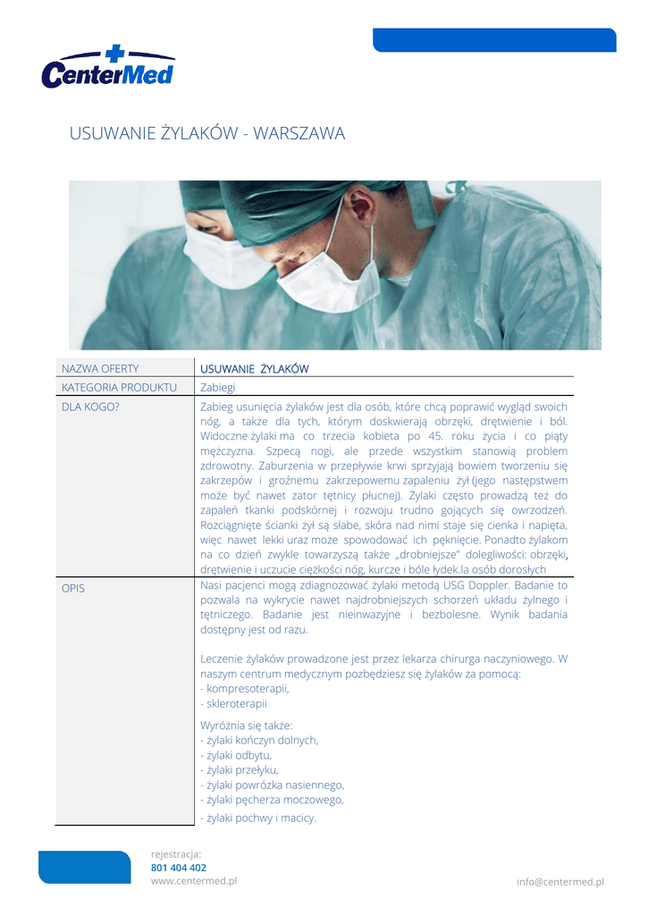 USUWANIE ŻYLAKÓW - WARSZAWA NAZWA OFERTY USUWANIE ŻYLAKÓW KATEGORIA PRODUKTU Zabiegi DLA KOGO? Zabieg usunięcia żylaków jest dla osób, które chcą poprawić wygląd swoich nóg, a także dla tych, którym doskwierają obrzęki, drętwienie i ból. Widoczne żylaki ma co trzecia kobieta po 45. roku życia i co piąty mężczyzna. Szpecą nogi, ale przede wszystkim stanowią problem zdrowotny. Zaburzenia w przepływie krwi sprzyjają bowiem tworzeniu się zakrzepów i groźnemu zakrzepowemu zapaleniu żył (jego następstwem może być nawet zator tętnicy płucnej). Żylaki często prowadzą też do zapaleń tkanki podskórnej i rozwoju trudno gojących się owrzodzeń. Rozciągnięte ścianki żył są słabe, skóra nad nimi staje się cienka i napięta, więc nawet lekki uraz może spowodować ich pęknięcie. Ponadto żylakom na co dzień zwykle towarzyszą także „drobniejsze” dolegliwości: obrzęki, drętwienie i uczucie ciężkości nóg, kurcze i bóle łydek.la osób dorosłych Nasi pacjenci mogą zdiagnozować żylaki metodą USG Doppler. Badanie to pozwala na wykrycie nawet najdrobniejszych schorzeń układu żylnego i tętniczego. Badanie jest nieinwazyjne i bezbolesne. Wynik badania dostępny jest od razu. OPIS Leczenie żylaków prowadzone jest przez lekarza chirurga naczyniowego. W naszym centrum medycznym pozbędziesz się żylaków za pomocą: - kompresoterapii, - skleroterapii Wyróżnia się także: - żylaki kończyn dolnych, - żylaki odbytu, - żylaki przełyku, - żylaki powrózka nasiennego, - żylaki pęcherza moczowego, - żylaki pochwy i macicy. rejestracja: 801 404 402 www.centermed.pl [email protected] Skleroterapia: I etap 500zł CENA II etap 200 III etap 700zł PRZYGOTOWANIE Brak DO BADANIA OKRES OFERTY Brak ram czasowych MIEJSCE REALIZACJI Warszawa ul. Waryńskiego 10a JAK SIĘ UMÓWIĆ Telefonicznie, online KONTAKT 801 404 402 rejestracja: 801 404 402 www.centermed.pl [email protected]