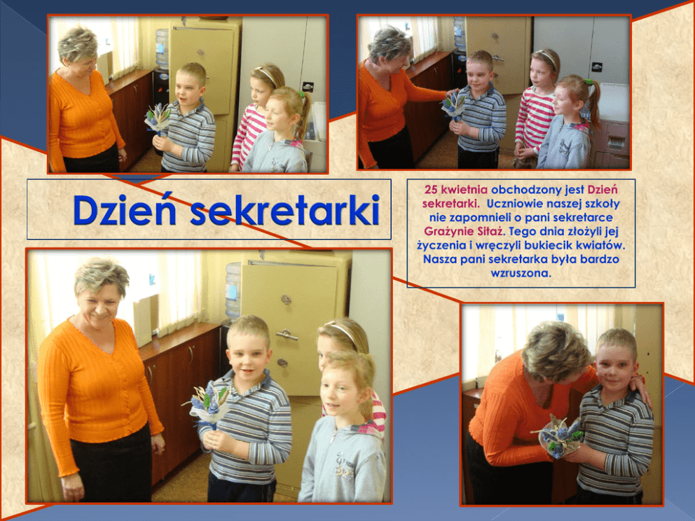 Dzień sekretarki 25 kwietnia obchodzony jest Dzień sekretarki. Uczniowie naszej szkoły nie zapomnieli o pani sekretarce Grażynie Sitaż. Tego dnia złożyli jej życzenia i wręczyli bukiecik kwiatów. Nasza pani sekretarka była bardzo wzruszona.
