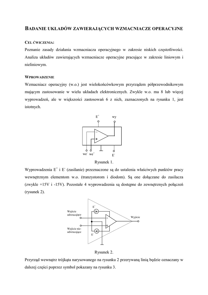 BADANIE UKŁADÓW ZAWIERAJĄCYCH WZMACNIACZE OPERACYJNE CEL ĆWICZENIA: Poznanie zasady działania wzmacniacza operacyjnego w zakresie niskich częstotliwości. Analiza układów zawierających wzmacniacze operacyjne pracujące w zakresie liniowym i nieliniowym. WPROWADZENIE Wzmacniacz operacyjny (w.o.) jest wielokońcówkowym przyrządem półprzewodnikowym mającym zastosowanie w wielu układach elektronicznych. Zwykle w.o. ma 8 lub więcej wyprowadzeń, ale w większości zastosowań 6 z nich, zaznaczonych na rysunku 1, jest istotnych. E+ we- we+ wy E- Rysunek 1. Wyprowadzenia E+ i E- (zasilanie) przeznaczone są do ustalenia właściwych punktów pracy wewnętrznym elementom w.o. (tranzystorom i diodom). Są one dołączane do zasilacza (zwykle +15V i -15V). Pozostałe 4 wyprowadzenia są dostępne do zewnętrznych połączeń (rysunek 2). E+ Wejście odwracające Wejście nieodwracające Wyjście E- Rysunek 2. Przyrząd wewnątrz trójkąta narysowanego na rysunku 2 przerywaną linią będzie oznaczany w dalszej części poprzez symbol pokazany na rysunku 3. u0 E +n ii0 ud ε− u0 0 i+ ε+ ud E −n Rysunek 3. Rysunek 4. Dla zastosowań w zakresie niskich częstotliwości prądy i napięcia wyprowadzeń w.o. spełniają następujące zależności: i − = I B− i + = I B+ u 0 = f (u d ) gdzie I B − , I B + są wejściowymi prądami polaryzującymi, a f(ud) jest symetryczną funkcją pokazaną na rysunku 4. W większości wzmacniaczy operacyjnych I B − , I B + są mniejsze niż 0.01mA, ε + , ε − są mniejsze niż 0.1mV, zaś nachylenie charakterystyki w przedziale [ε − , ε + ] oznaczane zwykle A jest większe niż 100000V/V, E +n = − E −n = E n ≅ 14V (zależne od napięcia zasilania). Biorąc pod uwagę powyższe wartości możemy przyjąć: I B − = I B + = 0, A = ∞ otrzymując model idealnego w.o. przedstawiony na rysunku 5. u0 En i-=0 i0 ud u0 i+=0 0 ud -En Rysunek 5. W zakresie niskich częstotliwości idealny w.o. jest bardzo dobrym przybliżeniem rzeczywistego układu i jest powszechnie stosowany w analizie układów zawierających w.o. Idealny wzmacniacz operacyjny jest opisany następującymi równaniami: 2 i− = i+ = 0 (1) u0 = En ud > 0 u 0 = −E n ud < 0 − En < u0 < En ud = 0 (2) Funkcja f(ud) jest więc reprezentowana przez 3-odcinkową charakterystykę, która określa trzy obszary pracy: obszar liniowy, obszar nasycenia dodatniego i obszar nasycenia ujemnego. Wzmacniacz operacyjny pracujący w zakresie liniowym W obszarze pracy liniowej idealny wzmacniacz operacyjny jest opisany zależnościami: i− = i+ = 0 ud = 0 Wykorzystując powyższe równania możemy analizować układy elektroniczne zawierające w.o. pracujący w zakresie liniowym. Metodę tę pokażemy na dwóch przykładach. 1. Układ z rysunku 6 jest nazywany wtórnikiem napięciowym. i-=0 i0 ud u0 1 uwe i+=0 a iwe Rysunek 6. Analizując układ otrzymujemy z PPK w węźle 1 i we = 0 (3) zaś z NPK w pętli a) u 0 = u we (ud = 0) Wyniki są ważne przy założeniu − E n < u we < E n które gwarantuje pracę w.o w zakresie liniowym. 2. Weźmy obecnie pod uwagę układ z rysunku 7. 3 (4) i2 i1 R1 1 Rf i-=0 i0 ud uwe u0 a i+=0 b Rysunek 7. Układ można opisać następującymi równaniami: ii = z NPK w pętli a) u we R1 i 2 = i1 z PPK w węźle 1) u 0 = −R f i 2 z NPK w pętli b) Stąd po przekształceniach otrzymujemy równanie: u0 = − Rf u we R1 (5) które jest ważne dla napięć wejściowych z zakresu: − R1 R E n < u we < 1 E n Rf Rf Ze względu na ujemny znak współczynnika we wzorze (5) układ jest nazywany wzmacniaczem odwracającym. W podobny sposób możemy analizować inne układy zawierające w.o. pracujące w liniowym zakresie. Wzmacniacz operacyjny pracujący w zakresie nieliniowym W pewnych zastosowaniach w.o. pracuje we wszystkich trzech regionach. W takich przypadkach musimy wykorzystać model nieliniowy przedstawiony na rysunku 5. Ponieważ charakterystyka u0=f(ud) jest odcinkowo-liniowa analizujemy układ w każdym z regionów jako układ liniowy. W obszarze nasycenia dodatniego (ud>0) model idealnego w.o. jest opisany następującymi równaniami: i− = i+ = 0 u0 = En W obszarze nasycenia ujemnego (ud<0) otrzymujemy: 4 (6) i− = i+ = 0 u 0 = −E n (7) Metoda analizy układów ze w.o. pracującymi w zakresie nieliniowym zostanie zilustrowana na przykładzie układu konwertera ujemno-rezystancyjnego z rysunku 8. if A i Rf c 1 ud u u0 B b i2 a R1 i1 R2 Rysunek 8. Chcemy wyznaczyć dwie charakterystyki i=g(u) oraz u0=f(u). Rozpatrzmy najpierw region liniowy (ud=0) otrzymując: z NPK w pętli a) i2 = u0 R1 + R 2 u = R 2i 2 z NPK w pętli b) Stąd wynika, że: u0 = 1 u β (8) gdzie β= R2 R1 + R 2 (9) Następnie wyznaczamy z PPK w węźle 1) i NPK w pętli c) i = if = ( 1 u − u0 Rf ) Z relacji tej i zależności (8) otrzymujemy: i=− R1 1 u R2 Rf (10) Wzór powyższy jest słuszny dla − En < u0 < En lub wykorzystując (8) dla − βE n < u < βE n 5 (11) W obszarze nasycenia dodatniego mamy: u − En Rf (12) u0 = En (13) ud > 0 (14) i= Wyznaczając ud w funkcji u mamy: ud = R2 E n − u = βE n − u R1 + R 2 Stąd i na podstawie (14) zależność (12) jest spełniona dla u < βE n (15) Podobne zależności otrzymujemy w obszarze nasycenia ujemnego: u + En Rf (16) u 0 = −E n (17) u > −β E n (18) i= Powyższe wzory pozwalają na narysowanie charakterystyki u-i (rysunek 9a). Jeżeli do zacisków AB dołączymu kondensator otrzymujemy układ gemeratora drgań relaksacyjnych. Drgania te mają charakter oscylacji o okresie T i są złożone z fragmentów krzywych wykładniczych (rysunek 9b) i 0 − R2 En R1 + R 2 u R2 En R1 + R 2 0 T t u (a) (b) Rysunek 9. CZĘŚĆ LABORATORYJNA 6 1. Badanie wzmacniacza operacyjnego w zakresie niskich częstotliwości. 1.1.Połącz układ zgodnie z rysunkiem 10. Rp i1 Zasilacz V2 V1 i2 Rysunek 10. Wyznacz charakterystykę u2=f(u1) wzmacniacza operacyjnego µA741. Zapisz wyniki w tabeli i narysuj charakterystykę na papierze