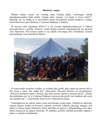 Młodzież z pasją Młodzi ludzie często nie wiedzą, jaką ścieżką pójść, wybierając szkołę ponadgimnazjalną bądź studia. Zadają sobie pytanie „Co będę w życiu robić?”. Okazuje się, że naukę (a w przyszłości pracę zawodową) można połączyć z pasją. Dowodem na to jest młodzież z Centrum Edukacji w Zabrzu. W nowym roku szkolnym 2016/17 w IX Liceum Ogólnokształcącym w Zabrzu powstała klasa o profilu „Fitness”, która skupia uczniów pasjonujących się sportem oraz fitnessem. Pod koniec nauki w tej szkole otrzymają dwa certyfikaty: trenera personalnego oraz instruktora fitness. Z wypowiedzi uczniów wynika, że wybrali taki profil, gdyż sport od zawsze był w ich życiu i chcą, aby nadal był. Aktywność fizyczna sprawia im przyjemność. „Wszyscy kochamy sport i chcemy, aby brał czynny udział w naszym życiu”, „Kiedy dowiedziałam się, że w Centrum Edukacji otworzą taki profil, nie miałam nad czym się zastanawiać” - wypowiedzi dziewczyn z fitnessowej ekipy. Nastolatkowie po szkole sporo czasu poświęcają swojej pasji. Chodzą na siłownię, zajęcia fitness, jeżdżą na rowerze, nartach, łyżwach, rolkach, pływają, biegają. Jest nawet w klasie grupa młodzieży, która chodziła na zajęcia z cheerleadingu oraz taka, która uczęszcza na zajęcia taneczne. W dodatku, pewien osobnik prowadzi zajęcia z tańca w ramach wolontariatu. Klasa zaangażowała się również w ogólnoświatową akcję "22 pushups for 22 KILL challenge", która ma zwrócić uwagę na problemy weteranów wojennych. Przez 22 dni, dzień w dzień robili 22 pompki. Idea akcji była szczytna, ponieważ wspiera weteranów, którzy po powrocie z misji cierpią na zespół stresu pourazowego. Według pewnego ucznia, zawód, który wybrali jest zawodem z przyszłością, iż coraz więcej ludzi chce ćwiczyć, dbać o swoje zdrowie fizyczne. To twierdzenie mówi o tym, jak rozsądnego wyboru dokonali, ponieważ nie kierowali się chwilą, ale zwracali uwagę na perspektywy zatrudnienia w przyszłości. Młodzi ludzie z zabrzańskiego CE dbają o swój rozwój fizyczny i ciało. Udzielają się sportowo zamiast siedzieć godzinami przed ekranem komputera i jeść chipsy oraz inne świństwa. I taka postawa jest naprawdę w porządku. Uczniowie ILB są warci uwagi, albowiem są właśnie młodzieżą z pasją. Młodzieżą, która znalazła mniej więcej swoją ścieżkę życiową. Młodzieżą, której pasja jest jednym z kroków do szczęścia. Piotr Frelke