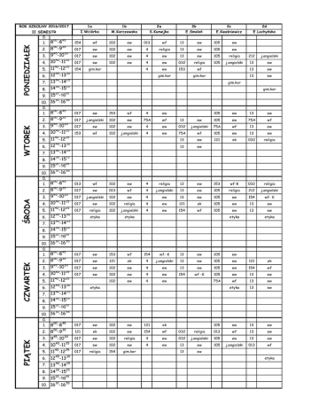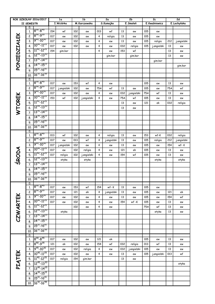 ROK SZKOLNY 2016/2017 1a 1b 2a 2b 2c 2d II SEMESTR I.Wciórka M.Karczewska S.Kumejko E.Smoleń E.Kwaśniewicz E.Lochyńska PONIEDZIAŁEK 0. 1. 2. 3. 4. 800-845 850-935 945-1030 1040-1125 7. 1430-1515 9. 1520-1605 1. WTOREK 2. 10 ew 013 wf 13 ew 105 ew 102 ew 4 religia 13 ew 105 ew 017 ew 102 ew 4 ew 13 ew 105 religia 212 017 ew 102 ew 4 ew 032 religia 105 j.angielski 13 ew 4 ew 153 wf 13 ew 13 ew 850-935 45 30 3. 9 -10 40 25 4. 10 -11 40 25 5. 11 -12 45 30 6. 12 -13 7. 1430-1515 9. 1520-1605 1. 2. 3. 4. 10 gim.kor 017 ew 153 wf 4 ew 017 j.angielski 102 ew 75A wf 850-935 945-1030 1040-1125 017 ew 102 ew 4 153 wf 102 j.angielski 4 1430-1515 9. 1520-1605 1. 2. 10 800-845 850-935 5. 1140-1225 6. 12 -13 45 ew ew 75A wf ew 032 j.angielski 75A wf 13 ew ew 75A wf 105 ew 13 ew 13 ew 121 ek 032 religia 13 ew wf 102 ew 4 religia 13 ew 153 wf-K 032 religia 017 ew 013 wf 4 j.angielski 13 ew 105 religia 212 j.angielski 017 j.angielski 102 ew 4 ew 13 ew 105 ew 154 wf- K 017 ew 102 religia 4 ew 121 ek 105 ew 13 ew religia 102 j.angielski 4 ew 154 wf 105 ew 13 ew 1430-1515 9. 1520-1605 10 etyka etyka etyka ew 153 wf 154 wf- K 13 ew 105 ew 017 ew 121 ek 4 j.angielski 13 ew 105 ew 121 017 ew 102 ew 4 ew 13 ew 105 ew 154 wf 017 ew 102 ew 4 ew 154 wf -K 105 ew 13 ew 102 ew 4 ew 75A wf 13 ew etyka 13 ew 105 ew 13 ew 013 wf 13 ew etyka 1340-1425 10. 16 -16 etyka 017 30 8. 0. 13 105 55 45 30 3. 9 -10 40 25 4. 10 -11 7. ew ew 013 1340-1425 8. 0. 105 13 55 800-845 10. 16 -16 gim.kor gim.kor 40 25 017 5. 11 -12 45 30 6. 12 -13 7. gim.kor 1340-1425 8. 0. gim.kor j.angielski 55 800-845 10. 16 -16 ŚRODA 102 ew 1340-1425 8. 0. CZWARTEK wf 017 40 25 154 5. 11 -12 45 30 6. 12 -13 10. 16 -16 PIĄTEK 154 ek 55 1. 800-845 017 ew 102 ew 121 ek 2. 850-935 121 ek 102 ew 154 wf 032 religia 017 ew 102 religia 4 ew 032 j.angielski 105 ew 13 ew 017 ew 102 ew 4 ew 13 ew 105 j.angielski 013 wf 017 religia 154 gim.kor 13 ew 45 30 3. 9 -10 4. 1040-1125 40 25 5. 11 -12 6. 1245-1330 7. 1340-1425 8. 1430-1515 9. 1520-1605 10 10. 16 -16 55 etyka 2e 2f 3a 3b 3c 3d 3e 3f A.Stefaniak J.Dziran M.Lubczyńska M.Mróz K.Boczar L.Janus B.Surowiec A.Oportowska 104 ew 6 ew 212 j.angielski 101 ew 154 wf-K 6 ew 032 religia 101 ew 104 ew 6 ew 3 ew 101 104 ew 154 Wf-K 75A wf 101 104 ew 3 ew 101 j.angielski etyka 3 ew 7 ew 111 religia 123 j.angielski 3 ew 7 ew 111 ew ew 7 ew 032 religia 154 wf 013 wf religia 75A wf 013 wf 7 ew 111 ew 7 ew 209 j.angielski religia 121 ek etyka etyka etyka 7 ew b 7 ew b etyka 032 religia/etyka gim.kor gim.kor 104 ew 6 ew 3 ew 104 ew 6 ew 3 ew 75A wf 6 religia b b 7 ew b b 111 121 ek 75A wf b 101 ew 7 ew 3 ew b 111 ew 104 ew 6 j.angielski j.angielski 101 ew 7 ew 3 ew j.angielski 111 ew 101 ew 3 ew 111 ew gim.kor. 111 ew ew 212 b b b b 123 ew 104 ew 6 ew 3 ew 154 wf 7 ew 27 ew 104 ew 6 ew 3 ew 101 ew 7 ew 27 ew 104 religia 6 religia 3 ew 101 j.angielski 013 wf 032 j.angielski 7 ew 111 104 ew 6 ew 212 j.angielski 101 ew 123 j.angielski 3 ew 7 ew 154 wf 6 ew 013 wf 101 ew 121 ek 3 ew 7 ew 111 j.angielski etyka etyka etyka etyka gim.kor 013 wf 6 ew 104 ew 153 wf gim.kor. 101 religia 7 ew 3 ew 75A wf 7 ew 3 ew 7 ew etyka 75A wf gim.kor. 111 ew 032 religia 75A wf 104 ew 6 j.angielski 3 ew 101 ew 7 ew 032 religia 121 ek 111 ew 104 j.angielski 6 ew 3 ew 101 ew 7 ew 121 ek 123 j.angielski 111 religia 6 ew 3 ew 121 ek 032 religia 013 wf 7 ew 111 j.angielski 7 ew 7 ew 111 ew 7 ew 111 ew etyka 3 ew 3 religia 154 wf 013 wf 3 ew 101 ew 104 ew 6 ew 3 ew 101 ew 123 j.angielski 27 j.angielski 104 ew 6 ew 121 ek 013 wf 154 wf 3 ew 7 ew 111 ew 104 religia 121 ek 154 wf 212 j.angielski 7 ew 3 ew 123 j.angielski 111 ew 104 j.angielski 27 ew 101 ew 7 ew 3 ew 013 wf 111 j.angielski ew 153 etyka 154 gim.kor. 7 gim.kor wf etyka/gim.kor 4a 4b 4c 5a 5b 5c I.Mazurkiewicz A.Komur B.Woźniakowska A.Marcinkowska b.Drohomirecka B.Jasińska 75A wf 31 przyroda 213 historia 123 j.angielski 209 muz./plastyka 214 j.polski 31 przyroda 125 zaj.tech. 75A wf 213 historia 209 muz./plastyka 212 j.angielski 126 matematyka 125 zaj.tech. 206 j. polski wf/wf 31 przyroda 213 j. polski 126 matematyka 206 przyroda 214 j. polski 27 przyroda 153 wf 213 j. polski 75A wf 123 j.angielski 126 matematyka 214 j. polski 124 matematyka 212 /j.ang. 211 godz. wych 154 szer/teak 31 przyroda 126 matematyka 154 szer/teak zw.mat. zw.mat 153 153 75A 154 wf/wf 75A 154 119 zaj.komp./ 119 zaj.komp./ 212 /j.ang. 123 /j.ang. 032 religia 119 zaj.komp./ 214 j. polski 032 religia 31 przyroda 206 j. polski 119 zaj.komp./ 214 j. polski 31 przyroda 211 j. polski 206 j. polski 123 j.angielski 126 matematyka 125 technika 032 religia 126 matematyka 214 j. polski 213 historia 211 j.angielski 125 technika 126 matematyka 31 przyroda 209 godz. wych. 214 godz. wych 124 matematyka 154 szer/teak 75A wf 206 j.angielski 209 muz./plastyka 154 szer/teak 125 wdż 209 muz./plastyka 212 j.ang/ 123 zw.j.ang. j.ang/ zw.j.ang. 153 153 213 153 153 154 154 historia szer/teak szer/teak wdż 212 153 75A j.ang/ wf/wf 126 153 75A j.ang/ wf/wf 75A wf / j.ang 214 j. polski 213 historia 75A wf 032 religia 31 przyroda 126 matematyka 125 religia 123 j.angielski 214 j. polski 124 matematyka wf/wf 214 j. polski 211 j.angielski 123 126 matematyka 211 j.polski 31 przyroda 032 religia 126 matematyka 206 j. polski 213 j.polski 032 religia /j.ang. 123 etyka/j.ang. 212 zw.j.pol. 123 153 126 zw.j.pl. 75A 75A wf/wf 153 75A j.ang. / wf 126 matematyka 032 religia matematyka 032 religia/etyka 211 j.angielski 119 ety. /zaj.komp. etyka 119 -/zaj.komp. etyka 126 godz. wych. 124 j.ang/ 209 muz./plastyka 214 j. polski 119 zaj.komp/- 75A wf 126 matematyka 211 j. polski 209 muz./plastyka 214 j. polski 119 zaj.komp/- 31 przyroda 31 przyroda 211 j. polski wf / j.ang 126 matematyka 75A wf 214 j. polski j. polski 31 przyroda 211 j.angielski 124 matematyka j.ang. / wf 213 historia 126 matematyka 153 153 75A 153 211 212 wf/wf j. polski j.ang/ 75A 75A 209 209 wf/wf muz./plastyka muz./plastyka 209 muz./plastyka 211 j. polski 209 muz./plastyka 126 matematyk