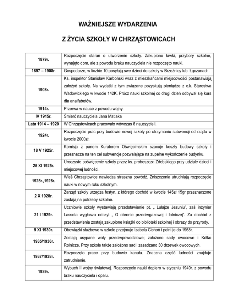 WAŻNIEJSZE WYDARZENIA Z ŻYCIA SZKOŁY W CHRZĄSTOWICACH 1879r. 1897 – 1908r. Rozpoczęcie starań o utworzenie szkoły. Zakupiono ławki, przybory szkolne, wynajęto dom, ale z powodu braku nauczyciela nie rozpoczęto nauki. Gospodarze, w liczbie 10 posyłają swe dzieci do szkoły w Brzeźnicy lub Łączanach. Ks. inspektor Stanisław Karboński wraz z mieszkańcami miejscowości postanawiają 1908r. założyć szkołę. Na wydatki z tym związane pozyskują pieniądze z c.k. Starostwa Wadowickiego w kwocie 142K. Prócz nauki szkolnej co drugi dzień odbywał się kurs dla analfabetów. 1914r. Przerwa w nauce z powodu wojny. IV 1915r. Śmierć nauczyciela Jana Matlaka Lata 1914 – 1920 1924r. 18 V 1925r. 25 XI 1925r. 1925r.,1926r. 2 X 1928r. W Chrząstowicach pracowało wówczas 6 nauczycieli. Rozpoczęcie prac przy budowie nowej szkoły po otrzymaniu subwencji od rządu w kwocie 2000zł. Komisja z panem Kuratorem Oświęcimskim szacuje koszty budowy szkoły i przeznacza na ten cel subwencje pozwalające na zupełne wykończenie budynku. Uroczyste poświęcenie szkoły przez ks. proboszcza Zdebskiego przy udziale dzieci i miejscowej ludności. Wieś Chrząstowice nawiedza straszna powódź. Zniszczenia utrudniają rozpoczęcie nauki w nowym roku szkolnym. Zarząd szkoły urządza festyn, z którego dochód w kwocie 145zł 15gr przeznaczone zostają na potrzeby szkolne. Uczniowie szkoły wystawiają przedstawienie pt. „ Lulajże Jezuniu”, zaś inżynier 21 I 1929r. Lassota wygłasza odczyt „ O obronie przeciwgazowej i lotniczej”. Za dochód z przedstawienia zostają zakupione książki do biblioteki szkolnej i obrazy do przyrody. 9 XI 1930r. 1935/1936r. 1937/1938r. 1939r. Obowiązki służbowe w szkole przejmuje Izabela Cichoń i pełni je do 1968r. Zostają usypane wały przeciwpowodziowe; założono sady owocowe i Kółko Rolnicze. Przy szkole także założono sad i zasadzano 30 drzewek owocowych. Rozpoczęto prace przy budowie kanału. Znaczna część ludności znajduje zatrudnienie. Wybuch II wojny światowej. Rozpoczęcie nauki dopiero w styczniu 1940r. z powodu braku nauczyciela i opału. 1941- 1944r. 1944/1945r. 24 I 1945r. 1945/1946r. 1947r. Styczeń 1948r. 5 XII 1948r. Styczeń 1949r. 1953/1954r. Nauka w szkole odbywa się z przerwami ( brak opału w zimie, choroba nauczyciela). Budynek szkoły zajęty przez organizację T.O.D.T. Zajmującej się sypaniem okopów i rowów przeciwczołgowych, a następnie przez niemiecki Urząd Celny. Wkroczenie wojsk radzieckich. Do szkoły uczęszcza 48 dzieci. Szkoła staje się filią Zbiorczej Szkoły w Brzeźnicy i jest nią do 1977r. Ukończenie budowy domu Ludowego na terenie wsi Chrząstowice i uroczyste poświęcenie. Choinka dla dzieci szkolnych z inicjatywy kierownictwa szkoły i Prezesa Samopomocy Chłopskiej. Kierownictwo szkoły wspólnie z Kołem Młodzieży organizuje przedstawienie dla dzieci pt. „ Święty Mikołaj idzie”. Wystawienie przedstawienia pt. „ Jasełka”. W szkole zaczynają działać organizacje uczniowskie: Samorząd Szkolny, Koło PCK, Koło Przyjaźni Polsko – Radzieckiej. 1957/1958r. Rozpoczęcie budowy zapory wodnej na Wiśle. 1959/1960r. Ukończenie budowy zapory wodnej i mostu na Wiśle. Obowiązki nauczyciela oprócz Izabeli Cichoń pełni Gromala Maria. Remont kapitalny szkoły. 1960/1961r. Zorganizowano wycieczki: do Krakowa na Wawel oraz film „ Krzyżacy”, do Skawiny na film „ O sierotce Marysi i Krasnoludkach”, do kopalni soli w Wieliczce. 1967/1968r. W szkole rozpoczyna pracę p. Zofia Skoczeń, funkcję kierownika nadal pełni p. Izabela Cichoń. Na emeryturę odchodzi p. Izabela Cichoń, obowiązki kierownika szkoły przejmuje p. 1968/1969r. Zofia Sendera i pełni je do 1984r. W tym czasie pracę w szkole rozpoczyna także p. Anna Kozioł. 1978r. Szkoła staje się filią Zbiorczej Szkoły Gminnej w Tłuczani i jest nią do 1984r. 1981r. Pracę rozpoczyna p. Irena Kapusta, która od 1984r. pełni funkcję kierownika szkoły. 1983r. 1984r. Pracę rozpoczyna p. Urszula Marszałek, która pracuje do dziś w szkole w Chrząstowicach. Szkoła w Chrząstowicach zostaje filią Zbiorczej Szkoły Podstawowej w Łączanach, a od 1989r. Szkoły Podstawowej im. Janusza Korczaka w Łączanach. 1990r. 1992r. 1 IX 1999r. 2006/ 2007r. 1 IX 2007r. 2008/2009r. Pracę jako nauczycielka rozpoczyna p. Anna Sikora i pracuje w Chrząstowicach do 2007r. Pracę w szkole rozpoczyna p. Dorota Książek i pracuje do dziś. W Chrząstowicach powstaje sześcioletnia szkoła podstawowa. Dyrektorem zostaje pani mgr Irena Kapusta. Na emeryturę odchodzi p. mgr Irena Kapusta. Dyrektorem Szkoły Podstawowej w Chrząstowicach zostaje pani mgr Maria Czyżowska. Powstanie placu zabaw przy szkole . Wzbogacenie szkoły o nowe pomoce edukacyjne w ramach programu „ Radosna szkoła.” 2009/2010r. Dzieci zaczynają korzystać z obiadów dowożonych ze stołówki ZSP w Brzeźnicy. 31 VIII 2010r. Likwidacja 6-letniej Szkoły Podstawowej w Chrząstowicach. 1 IX 2010r. Szkoła w Chrząstowicach staje się filią Szkoły Podstawowej im. Jana Kochanowskiego w Brzeźnicy. Opracowano na podstawie: Kronik szkolnych prowadzonych w latach 1908- 1972, Dzienników lekcyjnych , Protokołów Rady Pedagogicznej.