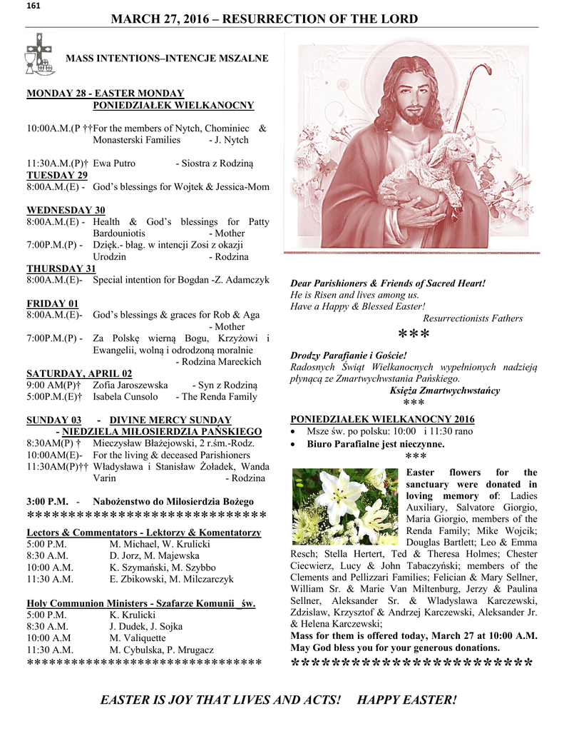 161 MARCH 27, 2016 – RESURRECTION OF THE LORD MASS INTENTIONS–INTENCJE MSZALNE MONDAY 28 - EASTER MONDAY PONIEDZIAŁEK WIELKANOCNY 10:00A.M.(P ††For the members of Nytch, Chominiec & Monasterski Families - J. Nytch 11:30A.M.(P)† Ewa Putro - Siostra z Rodziną TUESDAY 29 8:00A.M.(E) - God’s blessings for Wojtek & Jessica-Mom WEDNESDAY 30 8:00A.M.(E) - Health & God’s blessings for Patty Bardouniotis - Mother 7:00P.M.(P) - Dzięk.- błag. w intencji Zosi z okazji Urodzin - Rodzina THURSDAY 31 8:00A.M.(E)- Special intention for Bogdan -Z. Adamczyk FRIDAY 01 8:00A.M.(E)- God’s blessings & graces for Rob & Aga - Mother 7:00P.M.(P) - Za Polskę wierną Bogu, Krzyżowi i Ewangelii, wolną i odrodzoną moralnie - Rodzina Mareckich SATURDAY, APRIL 02 9:00 AM(P)† Zofia Jaroszewska - Syn z Rodziną 5:00P.M.(E)† Isabela Cunsolo - The Renda Family SUNDAY 03 - DIVINE MERCY SUNDAY - NIEDZIELA MIŁOSIERDZIA PAŃSKIEGO 8:30AM(P) † Mieczysław Błażejowski, 2 r.śm.-Rodz. 10:00AM(E)- For the living & deceased Parishioners 11:30AM(P)†† Władysława i Stanisław Żoładek, Wanda Varin - Rodzina Dear Parishioners & Friends of Sacred Heart! He is Risen and lives among us. Have a Happy & Blessed Easter! Resurrectionists Fathers *** Drodzy Parafianie i Goście! Radosnych Świąt Wielkanocnych wypełnionych nadzieją płynącą ze Zmartwychwstania Pańskiego. Księża Zmartwychwstańcy *** PONIEDZIAŁEK WIELKANOCNY 2016 Msze św. po polsku: 10:00 i 11:30 rano Biuro Parafialne jest nieczynne. *** Holy Communion Ministers - Szafarze Komunii św. 5:00 P.M. K. Krulicki 8:30 A.M. J. Dudek, J. Sojka 10:00 A.M M. Valiquette 11:30 A.M. M. Cybulska, P. Mrugacz Easter flowers for the sanctuary were donated in loving memory of: Ladies Auxiliary, Salvatore Giorgio, Maria Giorgio, members of the Renda Family; Mike Wojcik; Douglas Bartlett; Leo & Emma Resch; Stella Hertert, Ted & Theresa Holmes; Chester Ciecwierz, Lucy & John Tabaczyński; members of the Clements and Pellizzari Families; Felician & Mary Sellner, William Sr. & Marie Van Miltenburg, Jerzy & Paulina Sellner, Aleksander Sr. & Wladyslawa Karczewski, Zdzislaw, Krzysztof & Andrzej Karczewski, Aleksander Jr. & Helena Karczewski; Mass for them is offered today, March 27 at 10:00 A.M. May God bless you for your generous donations. ******************************** ************************ 3:00 P.M. - Nabożenstwo do Milosierdzia Bożego ***************************** Lectors & Commentators - Lektorzy & Komentatorzy 5:00 P.M. M. Michael, W. Krulicki 8:30 A.M. D. Jorz, M. Majewska 10:00 A.M. K. Szymański, M. Szybbo 11:30 A.M. E. Zbikowski, M. Milczarczyk EASTER IS JOY THAT LIVES AND ACTS! HAPPY EASTER! 161 MARZEC 27, 2016 – NIEDZIELA ZMARTWYCHWSTANIA PAŃSKIEGO Kwiaty na Wielkanoc zostały ofiarowane jako dar milości i modlitwy za zmarlych: Członkinie Korpusu Pomocniczego Pań; Ks. Eugeniusz Pietrasik; Ewa Handler i Kendrick DeMelo, Marcin Handler, Lana-Lee DeMelo, Joanna Bieniasz, Krystyna Ząbecka; Ewa Putro, Marian Przybyłowski, Helena, Jakub Śledziński, Józef Kaczmarek, z rodziny Rams, Ozorek i Przybyłowski; Bronisława, Kazimierz Krukowscy, Anna, Teofil Skroccy; z rodziny Rachfałowski i Gawełda; Mieczysław, Józefa i Alicja Lech; Marianna, Franciszek i Józef Kiljański, Tadeusz, Józefa i Stanisław Krajewski, Leokadia, Vincent Kosiorek; Janina, Wojciech Zięba, Józefa, Stanisław Osika; Wanda, Władysław, Krzysztof Chwedczuk, Helena, Kazimierz Bączek, Włodzimierz Hamulak, Zofia Walach, Ida Rode, Maria, Zenon Straszak; Jan, Jerzy, Stanisław Faszczo, Jerzy, Bożenka, Siemion, Helena Oleksinska; z rodziny Kunka, Adamiec i Armacki; z rodziny Łukoszyk; z rodzin: Mosiądz, Bałut, Kopała, Szwed; z rodzin: Jeliński, Bien, Borowiec, Wieczorek, Leokadia Poznańska; Helena i Grażyna Blicharski, Marianna i Władysław Sulima, Janina Wąsik, Roman Andzelm; Felix Ostrowski, Vincent Szymański; Ewa Walczyk, David Jersz, z rodzin: Jersz, Jezierski, Bryl, Kaczmarek, Rygiel, Smokowski, Gabrysz, Kocełło, Wolniewicz, Paszczuk, Parczyk, Dąbrowski, Małachowski, Andrzejczak, Dąbek, Jorgos Gabris, Baran, Aniela Psutka, Kosiorek; Stanisław i Stanisława Tynek, Eugenia Langer, Zofia Bauza, Halina Sikorska, Mikołaj Bieliński, ks. Edmund Mucha, ks. Eugeniusz Pietrasik, Stanisława Sarnecka, Anna Soares; z rodziny Poniewierski; z rodzin: Starzyński, Prusak i Drożdż; Felicja, Stanisław, Emilia i Czesław Pel, Władysława, Wincenty i Stanisław Ziembicki; Jan, Elżbieta Fasciszewski, Wawrzyniec, Rozalia Kowalik; Teresa Kamieniak, Józef Jajus, Zofia, Jan Jaroszewski; Jan, Waleria Wróbel, Jan, Zofia, Stanisław Rzepa; Helena, Piotr Korneluk, Wanda, Jan, Krystyna Rams; Teresa Przestrzelski, z rodziny Mioduszewski i Karwowski; z rodziny Biesiada, Kosakowski, Morusiewicz, Klubowski; Antoni i Stefania Płuchowski, Stefan i Maria Fajferek oraz z obu rodzin; Maria i Edward Pachla, Jadwiga Malotta, Katarina Schier, z rodziny Pachla i Kacprzak, Patryk Gabinet; rodzice, Józef i Maria, brat Jan, Jarosław, Stefan, Władysław, Zenon; Jerzy Bandurski; z rodzin Wyszotrawka i Krzeczkowski; z rodziny Kotas, Samek, Chlebek; Anna, Andrzej Damienc, Tadeusz Armacki; Maria Kowalczyk, Czesław Kord, z rodziny Kord; Józefa, Zofia, Stanisław Kozioł; z rodziny Świniarski, Wziętek, Ciesielski, Wiktoria Bobras, Tadeusz Szarnowski, Kazimiera Jedrzejewska, ks. Eugeniusz Pietrasik; z rodziny Bartoszewski, Nowak, Matusak; z rodziny Paduchowski, Fornalewski, Giska, Ciosk, Sobczyk i Sochoń; Zdzisława i Lucjan Dzięgielewski, Helena i Czesław Sochoń; Bogumiła Małkowicz, Aleksander Małkowicz, Aniela i Józef Małkowicz, Emilia i Eugeniusz Fajgier, Leokadia i Borys Żedzik; Paweł, Kazimierz Woś; Stanisław Bugiel, z rodziny Michta i Drużyński; Weronika i Leon Kusz, Zofia i Henryk Zaborski; Marian Filipkiewicz, z rodziny Filipkiewicz, Gój, Małecki, Baran, G. Kawka, M. Pniok, D. Wróbel; z rodziny Sznajder i Orłowski; Apolonia, Franciszka Arcimowicz, 