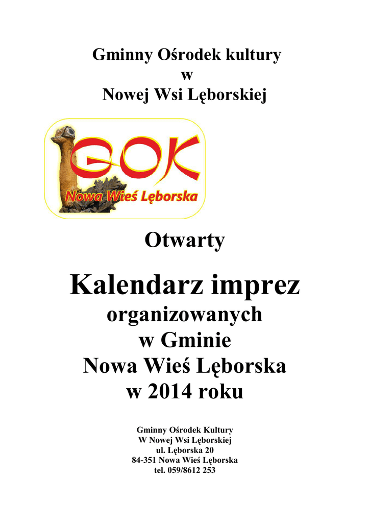 Gminny Ośrodek kultury w Nowej Wsi Lęborskiej Otwarty Kalendarz imprez organizowanych w Gminie Nowa Wieś Lęborska w 2014 roku Gminny Ośrodek Kultury W Nowej Wsi Lęborskiej ul. Lęborska 20 84-351 Nowa Wieś Lęborska tel. 059/8612 253 Termin Nazwa imprezy Miejsce Organizator Styczeń 2014 Styczeń Noworoczny koncert po kaszubsku Gminny Ośrodek Gminny Ośrodek Kultury Kultury w Nowej Wsi Lęborskiej Gminny Ośrodek XXII Finał Wielkiej Orkiestry ŚwiąteczKultury Gminny Ośrodek Kultury 12 stycznia nej Pomocy w Nowej Wsi Lębor- w Nowej Wsi Lęborskiej skiej Komisja Sportu Zespół Szkół XI Grand Prix Nowej Wsi Lęborskie w Rady Gminy Styczeń w Nowej Wsi LęborTenisie Stołowym Gminny Ośrodek Kultury skiej w Nowej Wsi Lęborskiej Gminny Ośrodek „Ferie Pełne uśmiechu” Kultury Gminny Ośrodek Kultury Styczeń Kostiumowy Bal Karnawałowy dla dzieci w Nowej Wsi Lębor- w Nowej Wsi Lęborskiej skiej Luty 2014 Luty 9 luty 16 luty Luty Luty Komisja Sportu Zespół Szkół XI Grand Prix Nowej Wsi Lęborskie w Rady Gminy w Nowej Wsi LęborTenisie Stołowym Gminny Ośrodek Kultury skiej w Nowej Wsi Lęborskiej Gminny Ośrodek Gminny Ośrodek Kultury X Gminno - Powiatowy Turniej Kół GoKultury w Nowej Wsi Lęborskiej spodyń Wiejskich w Nowej Wsi LęborKoła Gospodyń Wiejskich skiej Komisja Sportowa przy IX Gminnym Halowym Turnieju Piłki Radzie Gminy w Nowej Nożnej o Puchar Wójta Gminy Nowa Hala Sportowa w Wsi Lęborskiej Wieś Lęborska Lęborku Gminny Ośrodek Kultury w Nowej Wsi Lęborskiej Gminny Ośrodek HU! HU! HA! Nasza Zima zła – wystawa Kultury Gminny Ośrodek Kultury pokonkursowa dla dzieci w Nowej Wsi Lębor- w Nowej Wsi Lęborskiej skiej Gminny Ośrodek „Karnawałowy Bal Charytatywny” – imGminny Ośrodek Kultury Kultury preza koszykowa w Nowej Wsi Lęborskiej Marzec 2014 Marzec Marzec Marzec Komisja Sportowa przy Radzie Gminy w Nowej Zespół Szkół w NoWsi Lęborskiej wej Wsi Lęborskiej Gminny Ośrodek Kultury w Nowej Wsi Lęborskiej Gminny Ośrodek „Marzanna 2014” – impreza plenerowa Kultury Gminny Ośrodek Kultury w Nowej Wsi Lębor- w Nowej Wsi Lęborskiej skiej Dzień Kobiet - pokaz tańca towarzyskiego Gminny Ośrodek Gminny Ośrodek Kultury IX Otwarty Turniej Tenisa Stołowego im. Józefa Lisieckiego Kultury w Nowej Wsi Lęborskiej w Nowej Wsi Lęborskiej Gminny Ośrodek Muzyczny „Talent Show” Kultury Gminny Ośrodek Kultury Przegląd muzycznych talentów z Gminy w Nowej Wsi w Nowej Wsi Lęborskiej Nowa Wieś Lęborska Lęborskiej Gminny Ośrodek Kultury Gminny Ośrodek Kultury Wystawa Malarstwa Józefa Góry w Nowej Wsi Lębor- w Nowej Wsi Lęborskiej skiej Koncert Muzyczno - Wokalny Marzec Marzec Kwiecień 2014 Kwiecień Kwiecień Kwiecień- „Wielkanoc w Tradycji Polskiej” Gminny Ośrodek Gminny Ośrodek Kultury – konkurs plastyczny adresowany Kultury w Nowej Wsi Lęborskiej do dzieci, młodzież i dorosłych XII Rockowisko – impreza plenerowa dla Gminny Ośrodek młodzieży Kultury Gminny Ośrodek Kultury Koncert okolicznych zespołów w Nowej Wsi Lębor- w Nowej Wsi Lęborskiej skiej Gminny Ośrodek Obrona Cywilna, Powiatowe Mistrzostwa Obrony Cywilnej Kultury Polski Czerwony Krzyż, i PCK w udzielaniu pierwszej pomocy w Nowej Wsi LęborOchotnicza Służba skiej Ratownicza Maj 2014 1 maja 8 maja Maj I Trasa 17 Maja 18 Maja Maja Maja Rada Sołecka Dziechlino VIII Festyn z okazji Rajdu rowerowego Świetlica Dziechlino Gminny Ośrodek Kultury „Jesteśmy w Unii” w Nowej Wsi Lęborskiej Gminny Ośrodek Wystawa Malarstwa Kultury Gminny Ośrodek Kultury Stanisławy Dawidowicz „Ogrody” w Nowej Wsi w Nowej Wsi Lęborskiej Lęborskiej Gminny Ośrodek Dzień Animatora Kultury Kultury Gminny Ośrodek Kultury w Nowej Wsi w Nowej Wsi Lęborskiej Lęborskiej Majówka Wilkowska Wilkowo – Miejsce III Grand Prix Nowej Wsi Lęborskiej rekreacyjne GOK, Rada Sołecka Wilkowo Nordic Walking Park Nowa Wieś LęborObliwice, Ścieżka Gminny Ośrodek Kultury ska , Trasa nr 2 (czerwona) ; 8,2 km ; Przyrodnicza, Wil- w Nowej Wsi Lęborskiej czas przejścia ok. 1 godz. 30min. kowo Wilkowo - Obliwice – Wilkowo Rada Sołecka Wilkowo Wilkowo – Miejsce Majówka Wilkowska Gminny Ośrodek Kultury rekreacyjne GOK w Nowej Wsi Lęborskiej Komitet Organiza- Komitet Organizacyjny i V Międzynarodowy Rajd pojazdów socjacyjny i GOK, Leśni- Gminny Ośrodek Kultury listycznych ce w Nowej Wsi Lęborskiej Koło Gospodyń Le- Rada Sołecka i Gminny Festyn „Niezapominajka” śnice, Rada Sołecka i Ośrodek Kultury GOK w Nowej Wsi Lęborskiej 24 maja II Trasa 24 maja 25 maja Maj Komisja Sportowa przy Radzie Gminy w Nowej Wsi Lęborskiej Turystyczny Dzień Gminy Nowa Wieś Fundacja Ekologiczno – Lęborska Obliwice Sportowa im. T. Hopfera III Drużynowy Turniej w Nowej Wsi Lęborskiej Siatkówki Plażowej Gminny Ośrodek Kultury w Nowej Wsi Lęborskiej Rada Sołecka Obliwice, Turystyczny Dzień Gminy Nowa Wieś Fundacja Ekologiczno – Lęborska Sportowa im. T. Hopfera Obliwice, JanisłaIII Grand Prix Nowej Wsi Lęborskiej w Nowej Wsi Lęborskiej wiec, Garczegorze, Nordic Walking Park Nowa Wieś LęborPolskie Towarzystwo TuObliwice ska , Trasa nr 1 (zielona) ; 7,7 km ; czas rystyczno Krajoznawcze, przejścia ok. 1 godz. 20min. Gminny Ośrodek Kultury Obliwice - Garczegorze - Obliwice w Nowej Wsi Lęborskiej XXXII Ogólnopolski Bieg Przełajowy o Puchar Leśny pam. T. Hopfera w Obliwicach. Fundacja Ekologiczno – VIII Międzynarodowa Sportowa im. T. Hopfera Mila ROL LAND Obliwice Obliwice w Nowej Wsi Lęborskiej pamięci Piotra Gładkiego Gminny Ośrodek Kultury XIII Ogólnopolski Bieg Sołtysów w Nowej Wsi Lęborskiej pamięci Jana Pawła II Dzień Gminy Nowej Wsi Lęborskiej „Śpiewaj i tańcz – Wiosenny Talent Show dla Mamy” Gminny Ośrodek Kultury Gminny Ośrodek Kultury w Nowej Wsi w Nowej Wsi Lęborskiej Lęborskiej Czerwiec 2014 1 czerwca III Trasa 7 czerwca 7 czerwca 7 czerwca Czerwiec Czerwiec Festyny z okazji Dnia dziecka na terenie Gmin