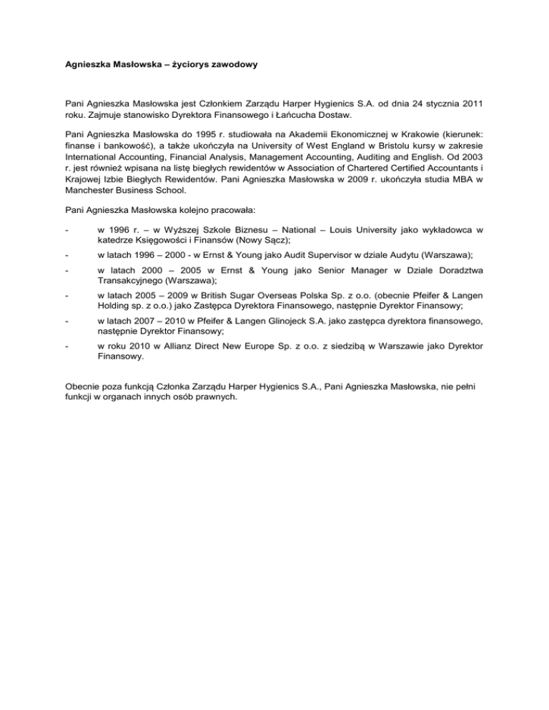Agnieszka Masłowska – życiorys zawodowy Pani Agnieszka Masłowska jest Członkiem Zarządu Harper Hygienics S.A. od dnia 24 stycznia 2011 roku. Zajmuje stanowisko Dyrektora Finansowego i Łańcucha Dostaw. Pani Agnieszka Masłowska do 1995 r. studiowała na Akademii Ekonomicznej w Krakowie (kierunek: finanse i bankowość), a także ukończyła na University of West England w Bristolu kursy w zakresie International Accounting, Financial Analysis, Management Accounting, Auditing and English. Od 2003 r. jest również wpisana na listę biegłych rewidentów w Association of Chartered Certified Accountants i Krajowej Izbie Biegłych Rewidentów. Pani Agnieszka Masłowska w 2009 r. ukończyła studia MBA w Manchester Business School. Pani Agnieszka Masłowska kolejno pracowała: - w 1996 r. – w Wyższej Szkole Biznesu – National – Louis University jako wykładowca w katedrze Księgowości i Finansów (Nowy Sącz); - w latach 1996 – 2000 - w Ernst & Young jako Audit Supervisor w dziale Audytu (Warszawa); - w latach 2000 – 2005 w Ernst & Young jako Senior Manager w Dziale Doradztwa Transakcyjnego (Warszawa); - w latach 2005 – 2009 w British Sugar Overseas Polska Sp. z o.o. (obecnie Pfeifer & Langen Holding sp. z o.o.) jako Zastępca Dyrektora Finansowego, następnie Dyrektor Finansowy; - w latach 2007 – 2010 w Pfeifer & Langen Glinojeck S.A. jako zastępca dyrektora finansowego, następnie Dyrektor Finansowy; - w roku 2010 w Allianz Direct New Europe Sp. z o.o. z siedzibą w Warszawie jako Dyrektor Finansowy. Obecnie poza funkcją Członka Zarządu Harper Hygienics S.A., Pani Agnieszka Masłowska, nie pełni funkcji w organach innych osób prawnych.