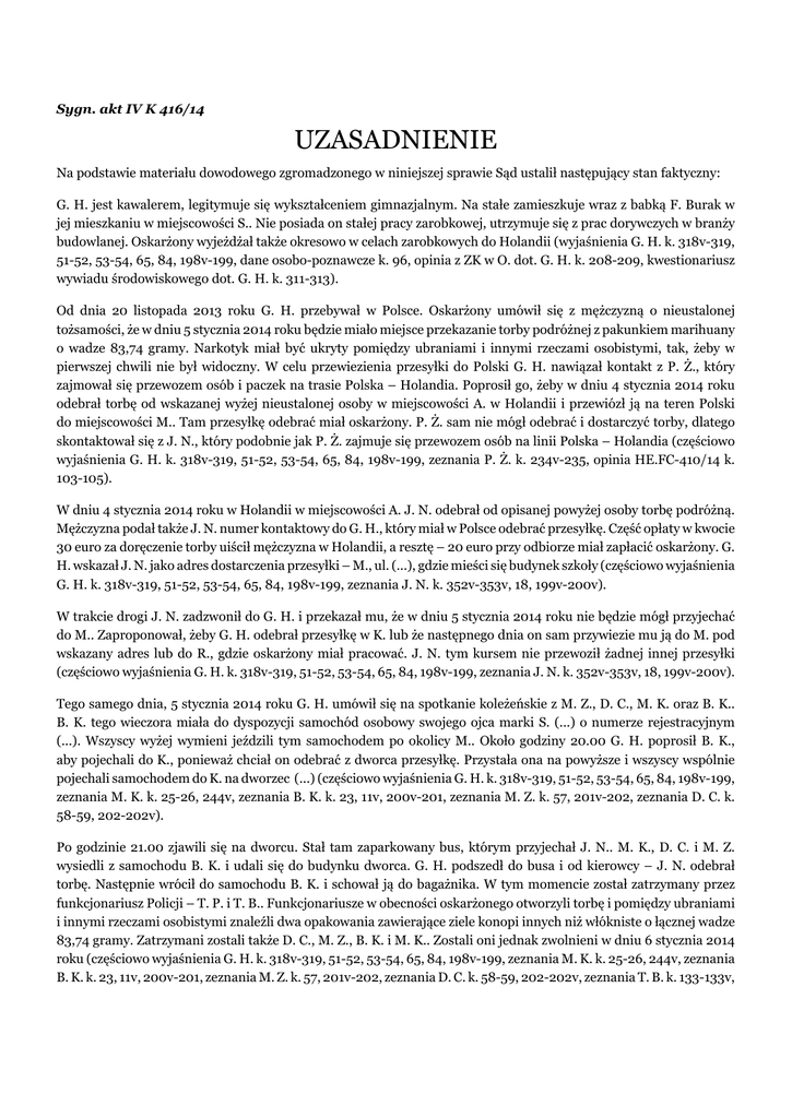 Sygn. akt IV K 416/14 UZASADNIENIE Na podstawie materiału dowodowego zgromadzonego w niniejszej sprawie Sąd ustalił następujący stan faktyczny: G. H. jest kawalerem, legitymuje się wykształceniem gimnazjalnym. Na stałe zamieszkuje wraz z babką F. Burak w jej mieszkaniu w miejscowości S.. Nie posiada on stałej pracy zarobkowej, utrzymuje się z prac dorywczych w branży budowlanej. Oskarżony wyjeżdżał także okresowo w celach zarobkowych do Holandii (wyjaśnienia G. H. k. 318v-319, 51-52, 53-54, 65, 84, 198v-199, dane osobo-poznawcze k. 96, opinia z ZK w O. dot. G. H. k. 208-209, kwestionariusz wywiadu środowiskowego dot. G. H. k. 311-313). Od dnia 20 listopada 2013 roku G. H. przebywał w Polsce. Oskarżony umówił się z mężczyzną o nieustalonej tożsamości, że w dniu 5 stycznia 2014 roku będzie miało miejsce przekazanie torby podróżnej z pakunkiem marihuany o wadze 83,74 gramy. Narkotyk miał być ukryty pomiędzy ubraniami i innymi rzeczami osobistymi, tak, żeby w pierwszej chwili nie był widoczny. W celu przewiezienia przesyłki do Polski G. H. nawiązał kontakt z P. Ż., który zajmował się przewozem osób i paczek na trasie Polska – Holandia. Poprosił go, żeby w dniu 4 stycznia 2014 roku odebrał torbę od wskazanej wyżej nieustalonej osoby w miejscowości A. w Holandii i przewiózł ją na teren Polski do miejscowości M.. Tam przesyłkę odebrać miał oskarżony. P. Ż. sam nie mógł odebrać i dostarczyć torby, dlatego skontaktował się z J. N., który podobnie jak P. Ż. zajmuje się przewozem osób na linii Polska – Holandia (częściowo wyjaśnienia G. H. k. 318v-319, 51-52, 53-54, 65, 84, 198v-199, zeznania P. Ż. k. 234v-235, opinia HE.FC-410/14 k. 103-105). W dniu 4 stycznia 2014 roku w Holandii w miejscowości A. J. N. odebrał od opisanej powyżej osoby torbę podróżną. Mężczyzna podał także J. N. numer kontaktowy do G. H., który miał w Polsce odebrać przesyłkę. Część opłaty w kwocie 30 euro za doręczenie torby uiścił mężczyzna w Holandii, a resztę – 20 euro przy odbiorze miał zapłacić oskarżony. G. H. wskazał J. N. jako adres dostarczenia przesyłki – M., ul. (...), gdzie mieści się budynek szkoły (częściowo wyjaśnienia G. H. k. 318v-319, 51-52, 53-54, 65, 84, 198v-199, zeznania J. N. k. 352v-353v, 18, 199v-200v). W trakcie drogi J. N. zadzwonił do G. H. i przekazał mu, że w dniu 5 stycznia 2014 roku nie będzie mógł przyjechać do M.. Zaproponował, żeby G. H. odebrał przesyłkę w K. lub że następnego dnia on sam przywiezie mu ją do M. pod wskazany adres lub do R., gdzie oskarżony miał pracować. J. N. tym kursem nie przewoził żadnej innej przesyłki (częściowo wyjaśnienia G. H. k. 318v-319, 51-52, 53-54, 65, 84, 198v-199, zeznania J. N. k. 352v-353v, 18, 199v-200v). Tego samego dnia, 5 stycznia 2014 roku G. H. umówił się na spotkanie koleżeńskie z M. Z., D. C., M. K. oraz B. K.. B. K. tego wieczora miała do dyspozycji samochód osobowy swojego ojca marki S. (...) o numerze rejestracyjnym (...). Wszyscy wyżej wymieni jeździli tym samochodem po okolicy M.. Około godziny 20.00 G. H. poprosił B. K., aby pojechali do K., ponieważ chciał on odebrać z dworca przesyłkę. Przystała ona na powyższe i wszyscy wspólnie pojechali samochodem do K. na dworzec (...) (częściowo wyjaśnienia G. H. k. 318v-319, 51-52, 53-54, 65, 84, 198v-199, zeznania M. K. k. 25-26, 244v, zeznania B. K. k. 23, 11v, 200v-201, zeznania M. Z. k. 57, 201v-202, zeznania D. C. k. 58-59, 202-202v). Po godzinie 21.00 zjawili się na dworcu. Stał tam zaparkowany bus, którym przyjechał J. N.. M. K., D. C. i M. Z. wysiedli z samochodu B. K. i udali się do budynku dworca. G. H. podszedł do busa i od kierowcy – J. N. odebrał torbę. Następnie wrócił do samochodu B. K. i schował ją do bagażnika. W tym momencie został zatrzymany przez funkcjonariusz Policji – T. P. i T. B.. Funkcjonariusze w obecności oskarżonego otworzyli torbę i pomiędzy ubraniami i innymi rzeczami osobistymi znaleźli dwa opakowania zawierające ziele konopi innych niż włókniste o łącznej wadze 83,74 gramy. Zatrzymani zostali także D. C., M. Z., B. K. i M. K.. Zostali oni jednak zwolnieni w dniu 6 stycznia 2014 roku (częściowo wyjaśnienia G. H. k. 318v-319, 51-52, 53-54, 65, 84, 198v-199, zeznania M. K. k. 25-26, 244v, zeznania B. K. k. 23, 11v, 200v-201, zeznania M. Z. k. 57, 201v-202, zeznania D. C. k. 58-59, 202-202v, zeznania T. B. k. 133-133v, 233v-234, 351v-352, zeznania T. P. k. 133-134v, 234, 352-352v, opinia HE.FC-410/14 k. 103-105, protokół użycia testera narkotykowego k. 14-15). Stanowisko procesowe oskarżonego nie zmieniało się w toku postępowania. Konsekwentnie nie przyznawał się on do popełnienia zarzucanego mu czynu. Podczas pierwszego przesłuchania przy przedstawieniu mu zarzutu posiadania znacznej ilości środka odurzającego, wyczerpującego znamiona art. 62 ust. 2 ustawy z dnia 29 lipca 2005 roku o przeciwdziałaniu narkomanii wyjaśnił, że pracował okresowo w Holandii dwa razy w roku po cztery miesiące. Twierdził, że w październiku 2013 roku poznał chłopaka pochodzącego z G. – T. M., z którym uzgodnił, że wyśle mu paczkę, w której miały znajdować się ubrania, narzędzia i słodycze. Torbę miał przewieźć kierowca busa pod wskazany adres szkoły w M.. Kierowca z uwagi na zmęczenie jazdą zwrócił się do oskarżonego by ten odebrał przesyłkę w K. na dworcu. Tak też się stało i G. H. pojechał ze swoimi znajomymi samochodem do K. na dworzec (...). Odebrał tam od kierowcy torbę i został zatrzymany przez Policję. Funkcjonariusze przeszukali torbę i znaleźli w niej marihuanę. Oskarżony wyjaśnił, że nic o narkotyku nie wiedział, że w torbie miały być tylko ubrania, słodycze i narzędzia. Wskazał, że zna T. M. ze S., którego nigdy w Holandii nie widział, natomiast drugi mężczyzna o tych samych personaliach ma około 190 cm wzr