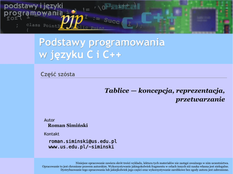 Podstawy programowania w języku języku C i C++ Część szósta Tablice — koncepcja, reprezentacja, przetwarzanie Autor Roman Simiński Kontakt [email protected] www.us.edu.pl/~siminski Niniejsze opracowanie zawiera skrót treści wykładu, lektura tych materiałów nie zastąpi uważnego w nim uczestnictwa. Opracowanie to jest chronione prawem autorskim. Wykorzystywanie jakiegokolwiek fragmentu w celach innych niż nauka własna jest nielegalne. Dystrybuowanie tego opracowania lub jakiejkolwiek jego części oraz wykorzystywanie zarobkowe bez zgody autora jest zabronione. Podstawy programowania w C++ Tablice — koncepcja, reprezentacja, przetwarzanie Tablice — koncepcja Tablica jest zmienną złożoną z elementów tego samego typu. Obejmuje ona ciągły obszar pamięci operacyjnej dokładnie tak duży, aby zmieścić wszystkie jej elementy. Termin tablica w języku potocznym jest zmiennikiem sformułowania zmienna tablicowa. Tablice stosuje się wtedy, gdy trzeba zgromadzić wiele obiektów tego samego typu w jednym miejscu, i w sposób wygodny przetwarzać je, według jednolitego schematu. Czasy przejazdów 30 zawodników startujących w slalomie można zapamiętać w tablicy. 1 2 3 14.5 14.8 13.5 30 16 ••• 1 30 • 2 • • 3 Copyright © Roman Simiński Strona : 2 Podstawy programowania w C++ Tablice — koncepcja, reprezentacja, przetwarzanie Tablice — uwaga na standardy C89 i C99 Według standardu C89 i C++: tablica zawsze składa się z ustalonej, i znanej na etapie kompilacji liczby elementów, liczba elementów tablicy nie ulega zmianie w trakcie działania programu ― tablice są statyczne. W standardzie C99 istnieją tablice VLA (ang. variable length array): liczba elementów tablicy może być zdefiniowany w trakcie wykonania programu — może być określona wartością zmiennej, ta wartość nie musi być znana na etapie kompilacji, liczba elementów tablicy nie ulega zmianie w trakcie działania programu ― raz stworzona tablica zachowuje swój rozmiar. Copyright © Roman Simiński Strona : 3 Podstawy programowania w C++ Tablice — koncepcja, reprezentacja, przetwarzanie Deklaracja zmiennych tablicowych Ogólna postać deklaracji tablicy — zmiennej tablicowej: <typ_elemetu> nazwa_zmiennej_tablicowej[ <wyrażenie_ stałe> ] wyrażenie_ stałe — wyrażenie określające liczbę elementów tablicy, wartość tego wyrażenia musi być znana na etapie kompilacji. Deklaracja 10-cio elementowej tablicy liczb całkowitych: int tab[ 10 ]; 10 elementów tab 0 1 2 3 4 5 6 7 8 9 Elementy tablicy numerowane są zawsze od 0. Zatem jeżeli N oznacza liczbę elementów tablicy, to ostatni jej element ma numer N − 1. Copyright © Roman Simiński Strona : 4 Podstawy programowania w C++ Tablice — koncepcja, reprezentacja, przetwarzanie Deklaracja zmiennych tablicowych, parametryzacja rozmiaru Liczba elementów tablicy (rozmiar) określa się zwykle używając stałych: #define N 10 . . . int tab[ N ]; Parametryzacja liczby elementów tablicy pozwala na łatwiejszą modyfikację liczby przetwarzanych elementów. Wykorzystanie modyfikatora const: Kwalifikator typu const może wystąpić z każdą specyfikacją typu. Zmienna z const powinna być zainicjowana ale potem nie może zmieniać wartości. Zmienna z kwalifikatorem const w języku C nie jest traktowana jako wartość stała i nie może być wykorzystywana do określania rozmiaru tablicy. Zmienna z kwalifikatorem const w języku C++ może być wykorzystywana do określania rozmiaru tablicy. Copyright © Roman Simiński Strona : 5 Podstawy programowania w C++ Tablice — koncepcja, reprezentacja, przetwarzanie Deklaracja zmiennych tablicowych, modyfikator const Dziesięcioelementowa tablica liczb całkowitych Różne warianty deklaracji C poprawne poprawne int tab[ 10 ]; #define N 10 . . . int tab[ N ]; const int N = 10; . . . int tab[ N ] C++ poprawne poprawne niepoprawne poprawne Preferowane postacie definicji zmiennych tablicowych: C , ANSI89 C++ #define MAKS_DL 80 char bufor[ MAKS_DL ]; const int MAKS_DL = 80; char bufor[ MAKS_DL ]; #define LB_MIES 12 double dochody[ LB_MIES ]; const int LB_MIES = 12; double dochody[ LB_MIES ]; Copyright © Roman Simiński Strona : 6 Podstawy programowania w C++ Tablice — koncepcja, reprezentacja, przetwarzanie Dowoływanie się do elementów tablicy tab[ 0 ] = 1; tab[ N - 1 ] = 5; a = 2 * tab[ 3 ]; int i = 0, j = N – 1; a = tab[ i ] + tab [ j ]; W języku C i C++ nie ma żadnych wbudowanych mechanizmów zabezpieczających przed odwoływaniem się do „elementów” leżących poza zakresem indeksowym tablic! tab[ 12 ] = 10; tab 0 1 2 3 4 5 6 7 8 9 ? 10 ? 11 10 12 Obszar poza zakresem tablicy ! Copyright © Roman Simiński Strona : 7 Podstawy programowania w C++ Tablice — koncepcja, reprezentacja, przetwarzanie Tablice wolno inicjalizować na etapie deklaracji Jeżeli inicjalizowana tablica nie posiada określonego rozmiaru, ostanie on określony na podstawie liczby elementów inicjalizujących. Jeżeli liczba wartości początkowych jest mniejsza od rozmiaru tablicy, to elementy o brakujących wartościach początkowych otrzymują wartość zero (zmienne zewnętrzne, statyczne i automatyczne). Podanie zbyt wielu wartości początkowych jest błędem. W C89 i C++ nie ma sposobu na zainicjowanie środkowego elementu bez podania wszystkich wartości pośrednich (w C99 można). int tab[ 10 ] = { 1, 2, 3, 4, 5, 6, 7, 8, 9, 10 }; int dni_miesiecy[] = { 31, 28, 31, 30, 31, 30, 31, 31, 30, 31, 30, 31 }; float przychody[ 12 ] = { 0, 0, 0 }; // Za mało wartości początkowych Copyright © Roman Simiński Strona : 8 Podstawy programowania w C++ Tablice — koncepcja, reprezentacja, przetwarzanie Tablice wolno inicjalizować na etapie deklaracji Inicjalizacja wybranych elementów tablicy w C99: int tab[ 10 ] = { [ 3 ] = 10, 20, 30, [ 4 ] = 50 } ; Zainicjuj zgodnie z podanym indeksem. Niezainicjowanym przypisz zero. Zapamiętaj ostatnią inicjalizację. Jak wyznaczyć liczbę 