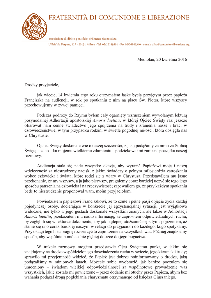 FRATERNITÀ DI COMUNIONE E LIBERAZIONE associazione di diritto pontificio civilmente riconosciuta Uffici: Via Porpora, 127 - 20131 Milano - Tel. 02/26149301 - Fax 02/26149340 - e-mail: [email protected] Mediolan, 20 kwietnia 2016 Drodzy przyjaciele, jak wiecie, 14 kwietnia tego roku otrzymałem łaskę bycia przyjętym przez papieża Franciszka na audiencji, w rok po spotkaniu z nim na placu Św. Piotra, które wszyscy przechowujemy w żywej pamięci. Podczas podróży do Rzymu byłem cały ogarnięty wzruszeniem wywołanym lekturą posynodalnej Adhortacji apostolskiej Amoris laetitia, w której Ojciec Święty raz jeszcze ofiarował nam cenne świadectwo jego spojrzenia na trudy i zranienia nasze i braci w człowieczeństwie, w tym przypadku rodzin, w świetle pogodnej miłości, która dosięgła nas w Chrystusie. Ojciec Święty doskonale wie o naszej szczerości, z jaką podążamy za nim i za Stolicą Świętą, i za to – ku mojemu wielkiemu zdumieniu – podziękował mi zaraz na początku naszej rozmowy. Audiencja stała się nade wszystko okazją, aby wyrazić Papieżowi moją i naszą wdzięczność za niestrudzony nacisk, z jakim świadczy o pełnym miłosierdzia zatroskaniu wobec człowieka i świata, które rodzi się z wiary w Chrystusa. Przedstawiłem mu jasne przekonanie, że my wszyscy, a ja jako pierwszy, pragniemy coraz bardziej uczyć się tego jego sposobu patrzenia na człowieka i na rzeczywistość; zapewniłem go, że przy każdym spotkaniu będę to niestrudzenie proponował wam, moim przyjaciołom. Powiedziałem papieżowi Franciszkowi, że to czułe i pełne pasji objęcie życia każdej pojedynczej osoby, docierające w konkrecie jej egzystencjalnej sytuacji, jest wyjątkowo widoczne, nie tylko w jego gestach doskonale wszystkim znanych, ale także w Adhortacji Amoris laetitia; przekazałem mu nadto informację, że zaprosiłem odpowiedzialnych ruchu, by zagłębili się w lekturze dokumentu, aby jak najlepiej utożsamić się z tym spojrzeniem, aż stanie się ono coraz bardziej naszym w relacji do przyjaciół i do każdego, kogo spotykamy. Przy okazji tego listu pragnę rozszerzyć to zaproszenie na wszystkich was. Później znajdziemy sposób, aby wspólnie pomóc sobie głębiej dotrzeć do jego bogactwa. W trakcie rozmowy mogłem przedstawić Ojcu Świętemu punkt, w jakim się znajdujemy na drodze współdzielonego doświadczenia ruchu w świecie, jego kierunek i trudy; sprawiło mi przyjemność widzieć, że Papież jest dobrze poinformowany o drodze, jaką podążaliśmy w minionych latach. Możecie sobie wyobrazić, jak bardzo poczułem się umocniony – świadom wielkiej odpowiedzialności za wspólnotowe prowadzenie was wszystkich, jakie zostało mi powierzone – przez dodanie mi otuchy przez Papieża, abym bez wahania podążał drogą pogłębiania charyzmatu otrzymanego od księdza Giussaniego. Wychodząc ze spotkania doznałem niesamowitego zdumienia, gdy wyraźniej zdałem sobie sprawę z głębokiej zgodności pomiędzy papieżem Franciszkiem a księdzem Giussanim. Stąd też uważam, że nic bardziej nie może nam pomagać niż stałe dążenie do utożsamiania się ze świadectwem, jakie Papież Franciszek codziennie nam ofiaruje. Ową zgodność odnajduję zawartą w następujących słowach księdza Giussaniego, naprawdę wyzwalających, które w ostatnim czasie są jakby dominującą nutą moich dni; ofiaruję je również wam, aby mogły być pomocą w przeżywaniu najważniejszego obowiązku świadectwa, jakiego papież Franciszek i Kościół spodziewają się po naszym Bractwie, tzn. od każdego z nas: „Wydarzenie Chrystusa jest prawdziwym źródłem krytycznej postawy, ponieważ nie oznacza ono odnajdywania ograniczeń rzeczy, ale dostrzeganie ich wartości [...] To wydarzenie Chrystusa stwarza nową kulturę i daje początek prawdziwej krytyce. Wartościowanie odrobiny lub ogromu dobra, które znajduje się we wszystkich rzeczach, zobowiązuje do stworzenia nowej cywilizacji, do pokochania nowej budowli. W ten sposób rodzi się nowa kultura, jako więź między wszystkimi odnajdywanymi okruchami dobra, w usiłowaniu ich dowartościowania i urzeczywistnienia. Uwydatnione zostaje to, co pozytywne, pomimo tego, że znajduje się w tym ograniczenie; cała reszta natomiast zostaje zawierzona miłosierdziu Ojca” (Zostawiać ślady w historii świata, Wydawnictwo i Drukarnia św. Krzyża, Opole 2011, s. 160-161). Nie zapominajmy modlić się każdego dnia za papieża Franciszka, prawdziwy dar Boga dla jego Kościoła, w tych czasach epokowych przemian, tak jak o to prosi ciągle wszystkich tych, z którymi się spotyka, mając świadomość jak bardzo jej potrzebuje. Niech ta modlitwa stanie się także dla nas przywołaniem do rozpoznania naszego niedostatku w obecnym Roku Świętym Miłosierdzia. Wasz przyjaciel w entuzjastycznej przygodzie wiary Ks. Julián Carrón