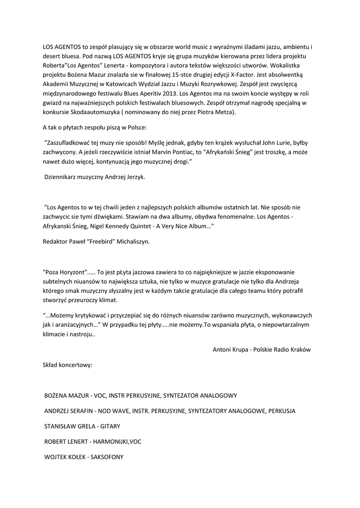 LOS AGENTOS to zespół plasujący się w obszarze world music z wyraźnymi śladami jazzu, ambientu i desert bluesa. Pod nazwą LOS AGENTOS kryje się grupa muzyków kierowana przez lidera projektu Roberta”Los Agentos” Lenerta - kompozytora i autora tekstów większości utworów. Wokalistka projektu Bożena Mazur znalazła sie w finałowej 15-stce drugiej edycji X-Factor. Jest absolwentką Akademii Muzycznej w Katowicach Wydział Jazzu i Muzyki Rozrywkowej. Zespół jest zwycięzcą międzynarodowego festiwalu Blues Aperitiv 2013. Los Agentos ma na swoim koncie występy w roli gwiazd na najważniejszych polskich festiwalach bluesowych. Zespół otrzymał nagrodę specjalną w konkursie Skodaautomuzyka ( nominowany do niej przez Piotra Metza). A tak o płytach zespołu piszą w Polsce: ”Zaszufladkowad tej muzy nie sposób! Myślę jednak, gdyby ten krążek wysłuchał John Lurie, byłby zachwycony. A jeżeli rzeczywiście istniał Marvin Pontiac, to “Afrykaoski Śnieg” jest troszkę, a może nawet dużo więcej, kontynuacją jego muzycznej drogi.” Dziennikarz muzyczny Andrzej Jerzyk. "Los Agentos to w tej chwili jeden z najlepszych polskich albumów ostatnich lat. Nie sposób nie zachwycic sie tymi dźwiękami. Stawiam na dwa albumy, obydwa fenomenalne. Los Agentos Afrykanski Śnieg, Nigel Kennedy Quintet - A Very Nice Album…" Redaktor Paweł “Freebird” Michaliszyn. "Poza Horyzont"..... To jest pŁyta jazzowa zawiera to co najpiękniejsze w jazzie eksponowanie subtelnych niuansów to największa sztuka, nie tylko w muzyce gratulacje nie tylko dla Andrzeja którego smak muzyczny słyszalny jest w każdym takcie gratulacje dla całego teamu który potrafił stworzyd przeuroczy klimat. “…Możemy krytykowad i przyczepiad się do różnych niuansów zarówno muzycznych, wykonawczych jak i aranżacyjnych…” W przypadku tej płyty…..nie możemy.To wspaniała płyta, o niepowtarzalnym klimacie i nastroju.. Antoni Krupa - Polskie Radio Kraków Skład koncertowy: BOŻENA MAZUR - VOC, INSTR PERKUSYJNE, SYNTEZATOR ANALOGOWY ANDRZEJ SERAFIN - NOD WAVE, INSTR. PERKUSYJNE, SYNTEZATORY ANALOGOWE, PERKUSJA STANISŁAW GRELA - GITARY ROBERT LENERT - HARMONIJKI,VOC WOJTEK KOŁEK - SAKSOFONY