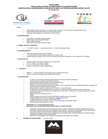REGULAMIN PRZYJACIELSKI BIEG SYLWESTROWY Z KLUBEM FORMA I MISTRZOSTWA WODZISŁAWIA ŚLĄSKIEGO W BIEGU ZE SPADACHRONEM SPEED CHUTE 31.12.2014 R. 1. CEL: Popularyzacja biegów masowych oraz nordic walking jako jednej z form zdrowego i aktywnego stylu życia. Promocja Miasta Wodzisław Śląski oraz Gosław Sport Center. Integracja osób biegających z zawodnikami nordic walking. 2. ORGANIZATORZY: Klub Sportowy „FORMA” Wodzisław Śląski Gosław Sport Center Wodzisław Śląski Miasto Wodzisław Śląski Sklep Sportowy Monsun Wodzisław Śląski 3. TERMIN I MIEJSCE ZAWODÓW: 31.12.2014 r ( środa ) – Gosław Sport Center ul. Cisowa 6 Wodzisław Śląski 4. PROGRAM IMPREZY: 10.00 start przyjacielski bieg i nordic walking 11.30 rozpoczęcie zawodów bieg ze spadochronem speed chute podczas imprezy do godziny 16.00 istnieje możliwość morsowania, korzystania z saun, kawiarni Emi i Grill Baru. 5. KLASYFIKACJA: 6. Kategorie wiekowe w biegu ze spadochronem speed chute K-1 ( 16 - 39 lat ), K-2 ( 40 lat i więcej ). M-1 ( 16 - 39 lat ), M-2 ( 40 lat i więcej ). 3 najlepsze przebrania w biegu przyjacielskim NAGRODY: Miejsca 1 - 3 w każdej kategorii otrzymają puchar oraz nagrodę rzeczową. Wszyscy zawodnicy otrzymają ciepły posiłek niespodziankę. 7. UCZESTNICTWO: W biegu i nordic walking młodzieży zgoda pisemna rodziców lub opiekuna prawnego. Osoba pełnoletnia podpisuje oświadczenie startowe. Zawody odbędą się bez względu na warunki atmosferyczne. Organizator nie ubezpiecza uczestników imprezy. Wszyscy uczestnicy zawodów biorą udział na własne ryzyko a organizator nie ponosi odpowiedzialności za wypadki lub zdarzenia losowe zaistniałe podczas zawodów. Opłata startowa uiszczona przelewem do 30.12.2014 r. wynosi 20 złotych. Za zgłoszenie uważa się podanie danych uczestnika oraz dokonanie opłaty startowej na konto organizatora. W zawodach może wziąć udział tylko 100 zgłoszonych i opłaconych uczestników. Po osiągnięciu limitu lista startowa zostanie zamknięta. Opłata startowa nie podlega zwrotowi. Zapisy: wystarczy opłata na konto KS Forma w Banku BGŻ z podaniem danych uczestnika, mailem podając dane adresowe i kategorię: [email protected], w siedzibie KS Forma os 1 Maja 27 Wodzisław Śląski, w sklepie turystyczno-sportowym monsun.com.pl ul. Mendego 28 Wodzisław Śląski, Opłatę startową należy wpłacać na konto: BANK BGŻ S.A. ul. Kubsza Wodzisław Śląski Klub Sportowy Forma Wodzisław Śląski 79 2030 0045 1110 0000 0255 0850 8. Organizator zastrzega sobie prawo do przeprowadzania z każdym uczestnikiem wywiadu, fotografowania go oraz filmowania w celach reklamowych, promocyjnych, wykorzystania w internecie lub transmisjach radiowo-telewizyjnych oraz innych zdarzeniach komercyjnych mających na celu promocję wydarzenia sportowego. Organizator zastrzega sobie prawo do nieodpłatnego wykorzystania zdjęć, materiałów filmowych przedstawiających uczestników zawodów w celach promocyjnych. Organizatorzy zastrzegają sobie możliwość wcześniejszego zamknięcia listy startowej. INFORMACJE DODATKOWE: tel. 502 212 592