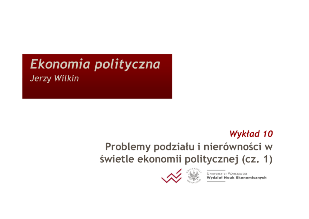 Ekonomia polityczna Jerzy Wilkin Wykład 10 Problemy podziału i nierówności w świetle ekonomii politycznej (cz. 1) Wprowadzenie Ograniczone miejsce dla kwestii podziału i nierówności w ekonomii głównego nurtu Rosnące zainteresowanie badaczy i organizacji międzynarodowych (Bank Światowy, OECD) Głód i niedożywienie – najostrzejszy przejaw biedy Bieda i ubóstwo – zmienność i względność zjawiska; stosowane definicje Wykluczenie i marginalizacja – nowe zjawiska współczesnego świata 2 Plan zajęć Część I Nierówność, ubóstwo i wykluczenie społeczne – uwagi metodologiczne Rozmiar problemu 3 Ważne pytania Dlaczego w krajach o zbliżonym poziomie rozwoju gospodarczego występują znaczne różnice pod względem rozpiętości dochodów i skali ubóstwa? Jak te różnice wpływają na: dobrobyt społeczny? międzynarodową konkurencyjność? wzrost gospodarczy? Dlaczego w krajach zamożnych nie kurczy się sfera względnego ubóstwa? Czy europejski model społeczny ma szanse skutecznej konkurencji z modelem Stanów Zjednoczonych i modelem azjatyckim? 4 Ważne pytania (cd.) Dlaczego ekonomiści powinni zajmować się nierównościami? Dlaczego kwestia podziału dochodów ma znaczenie dla efektywności ekonomicznej? sposoby redystrybucji, rodzaje podatków i ich wpływ na efektywność oraz nierówności koszty społeczne nierówności dochodowych i nierówności szans Dlaczego pozycja społeczna i dochody są skorelowane z pochodzeniem i dochodami rodziców? Czy da się rozwiązać problem nierówności dochodów i szans? 5 Nierówność, ubóstwo i wykluczenie społeczne Złożoność pojęć: nierówność (majątku, dochodu, szans); ubóstwo (obiektywne, subiektywne, absolutne, względne); wykluczenie społeczne (niski status materialny, edukacyjny, zdrowotny, zawodowy, społeczny, polityczny), 6 Bieda i nędza są stopniowalne, względne i zmienne Skrajna nędza – głodowanie, zagrożenie życia, niezdolność do pracy, niezdolność do zmiany sytuacji Bieda i ubóstwo – niski poziom zaspokojenia potrzeb, niemożliwość wykorzystania potencjału ludzkiego, niewielki bądź zerowy stopień aktywności w życiu społecznym, duży dystans dzielący od średniego poziomu życia w danym kraju Ubóstwo absolutne i względne – znaczenie punktów odniesienia 7 Rozmiary zjawiska ubóstwa Nie ma jednoznacznej definicji ubóstwa. Np. Słownik ekonomiczny Webstera: ‘stan człowieka w którym brakuje mu społecznie akceptowanej wystarczającej kwoty pieniężnej lub dóbr materialnych potrzebnych do życia’ Bank Światowy: ‘niezdolność człowieka do uzyskania minimalnego standardu życia’ Amartya Sen (Noblista z ekonomii) : ‘niedostateczny poziom zdolności/umiejętności’ potrzebny do przetrwania Problemy z tymi definicjami: Co to znaczy ‘społecznie akceptowalny’ poziom? Jak oddzielić biedę indywidualnego człowieka od biedy całej rodziny? itd. 8 Egoizm krajów bogatych Kraj Norwegia Pomoc krajom ubogim jako % dochodu narod. w 1990 r 1,17 Pomoc krajom ubogim, jako % dochodu narod. W 2004 r. 0,87 Szwecja 0,91 0,78 Niemcy 0,42 0,28 USA 0,21 0,17 Średnia 28 kraj. 0,33 0,26 9 Realokacja (korekta?) bogactwa na świecie a likwidacja skrajnej nędzy W 2001 r. poniżej poziomu dochodu 1,08$ żyło 1,1 mld ludzi. Ich dochód wynosił średnio 0,77 $ dziennie. Ich niedobór środków na zaspokojenie podstawowych potrzeb wynosił 0,77% dziennie, czyli 118$ rocznie. Niedobór dochodów ludzi ubogich na świecie wynosił więc 124 mld$ Transfer z 22 najbogatszych krajów (DAC) w wysokości 0,6% ich PKB, może zlikwidować tę lukę W Millenijnych Celach Rozwoju ONZ przyjęto wskaźnik 0,7% PKB jako pożądany poziom wsparcia dla krajów ubogich 10 Wskaźniki zróżnicowania dochodów Kraj Stosunek dochodów 10% ludności najbogatszej do 10% ludności najbiedniejszej Stosunek Wskaźnik Gini dochodów 20% ludności najbogatszej do 20% ludności najbiedniejszej Polska 8,8 5,6 34,5 Norwegia 6,1 3,9 25,8 Szwecja 6,2 4,0 25,0 W.Brytania 13,8 7,2 34,7 USA 15,9 8,4 40,8 Węgry 5,5 3,8 26,9 Rosja 12,7 7,6 39,9 11 Zróżnicowanie: kilka przykładów Współczynnik Gini wzrósł w Polsce z ok. 0,24 na początku lat 1990 do ok. 0,35 w 2006 r. Przeciętna długość życia w Polsce wzrasta, ale najwolniej na „ścianie wschodniej”, a najszybciej w woj. opolskim, w wielkopolskim i pomorskim; Odsetek ubóstwa relatywnego w rodzinach jednoosobowych i małżeństwach bez dzieci wynosi ok. 6%, w rodzinach z dwojgiem dzieci 15%, a w rodzinach z czworgiem dzieci prawie 50%; Narażenie na ubóstwo dzieci i młodzieży w Polsce jest najwyższe w UE; W Wilanowie w szkołach na 1 komputer przypada 12 dzieci, a na Pradze Północ 52 dzieci 12 4 podejścia do mierzenia ubóstwa 1. 2. Podejście monetarne pionierem był Rownteers: badania gospodarstw domowych w Wielkiej Brytanii ustanowił pojęcia ‘granica ubóstwa’ (poverty line) na podstawie niedostatecznej konsumpcji i dochodu człowieka Podejście nastawione na zdolności potrzebne do przetrwania (capabilities) lata 90tych Amartya Sen’a: szerszy aspekt ubóstwa problem alokacji dóbr, potrzeby rozwijania ludzkich zdolności takich jak edukacja, aktywność społeczna jako sposób uniknięcia i/lub wyjścia z biedy 13 4 podejścia do mierzenia ubóstwa (cd.) 3. 4. Podejście społecznego wykluczenia – pionierem był Lanoir (1974), skupia uwagę na procesie przyczyn i stopnia wykluczenia grup biednych z różnych form życia społecznego Podejście przez partycypację – biedni uczestniczą w określaniu tego co uważają za przyczyny swojej biedy i jak temu zaradzić badania Banku Światowego 14 Klasyfikacja podejść do zjawiska biedy Podejście do zjawiska: Monetarne/ Pieniężne Nastawione na umiejętności Społecznego wykluczenia Partycypacji Podstawy definicji Wartość dochodu, konsumpcji i użyteczności poniżej ogólnie akceptowalnego poziomu Pozbawienie ludzi ich podstawowych zdolności/umiejętn oś